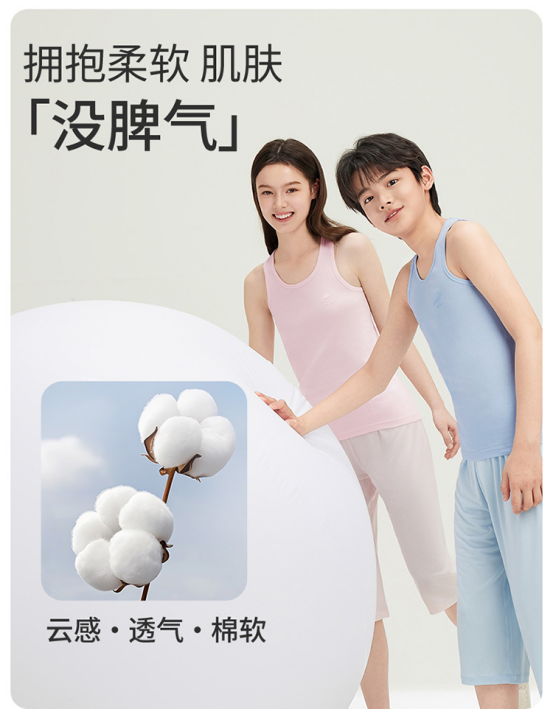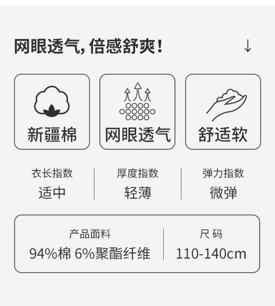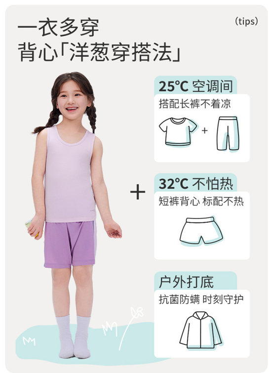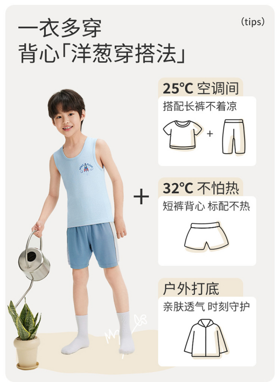 ✅透气王炸!40℃高温也不黏身! 每一款的材质兼顾安全+贴身+透气+抗菌抗敏! ✅凉感黑科技💨,出汗秒吸干! 上身轻薄到像没穿! 娃疯跑一天后背还是干爽的 弹性+耐造!怎么疯玩都不变形 拉伸回弹率超90%!弹性大、不起球! 二年级穿到五年级,每年囤两件就够!