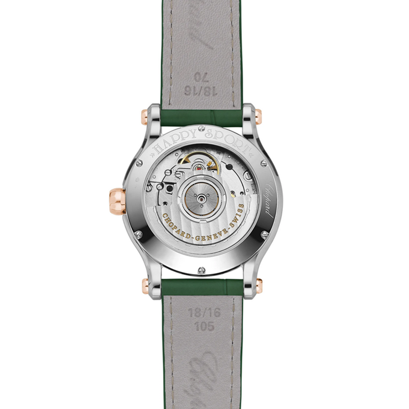 镜面材质 | 蓝宝石水晶玻璃 | 表盘 | 18K玫瑰金,精钢间金表壳 凹凸质感的绿色珍珠母贝表盘。 罗马文及条形时标,5钻钻石 背透 |