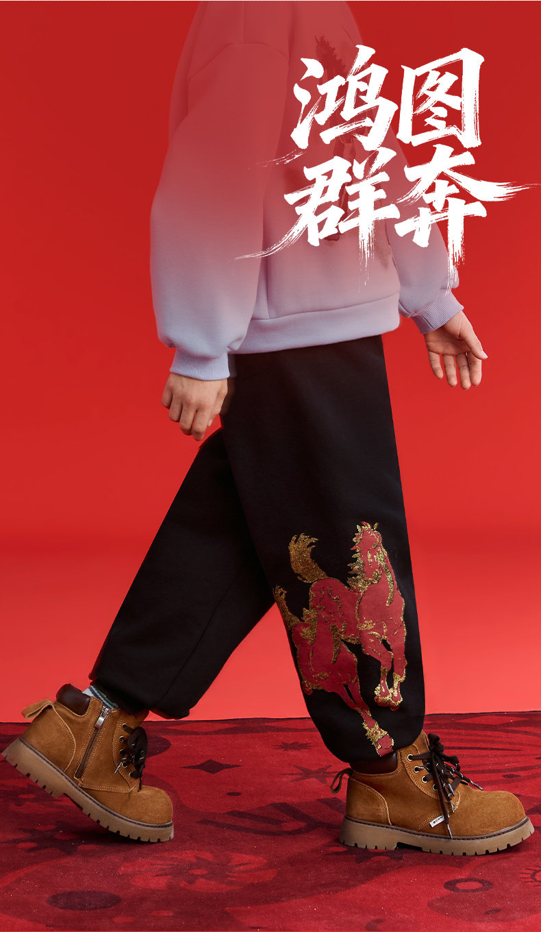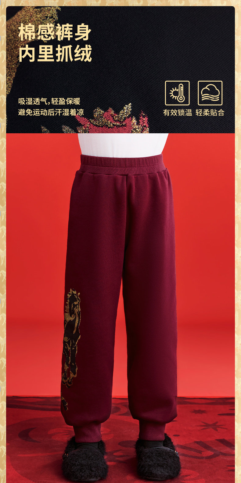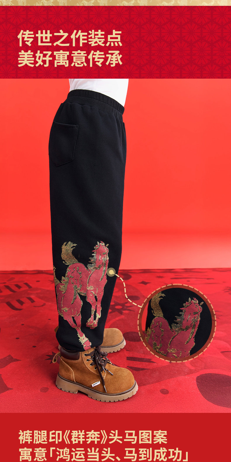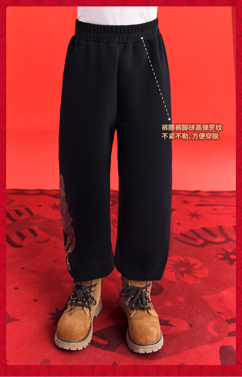徐悲鸿联名年衣童装长裤儿童冬季新款男女同款加绒大展鸿图长裤
