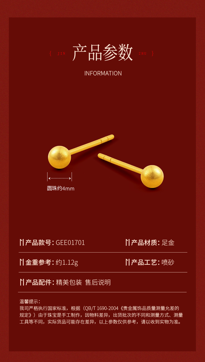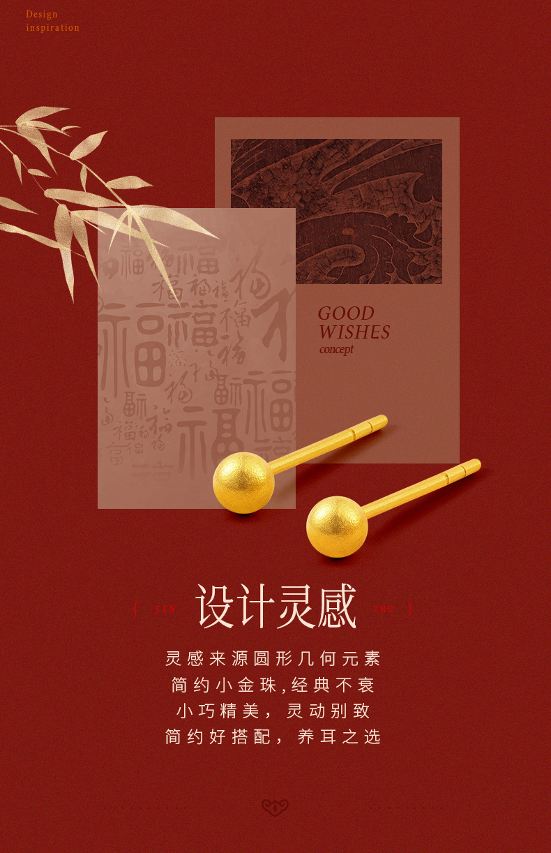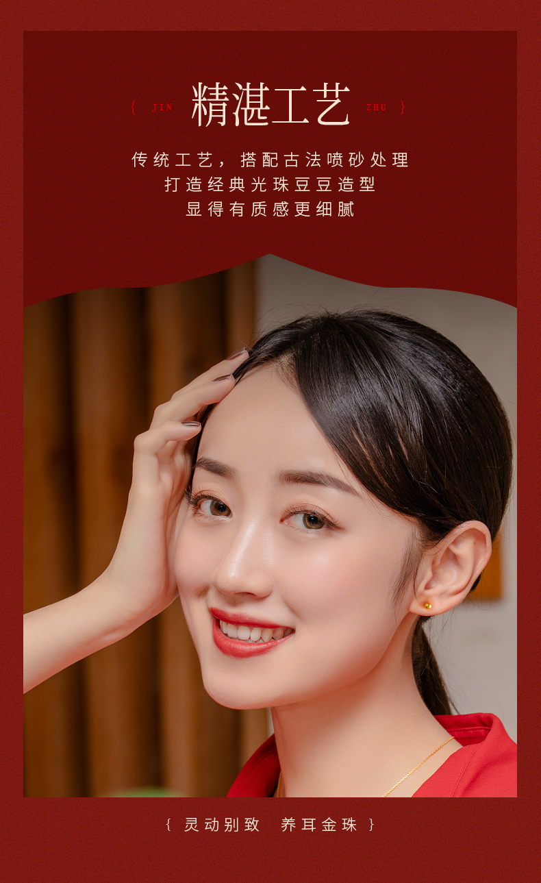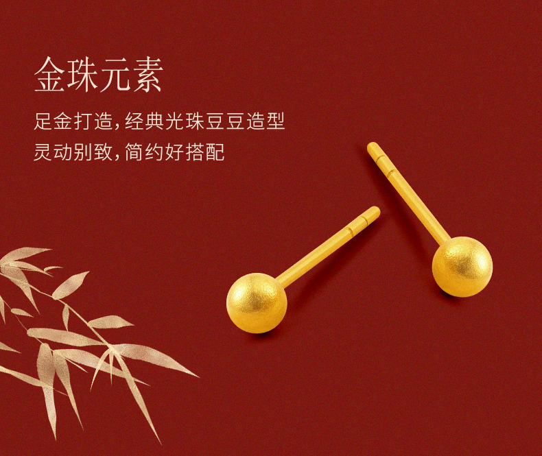 黄金耳钉女款古法足金圆珠养耳棒经典小金珠耳饰计价【按克计价黄金1】MEMORA诗普琳GEE01701(线上专供)
