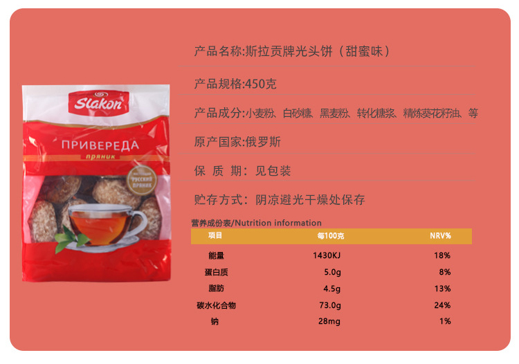 【分仓直发包邮】俄罗斯原装进口撕拉贡光头饼450g(甜蜜原味)