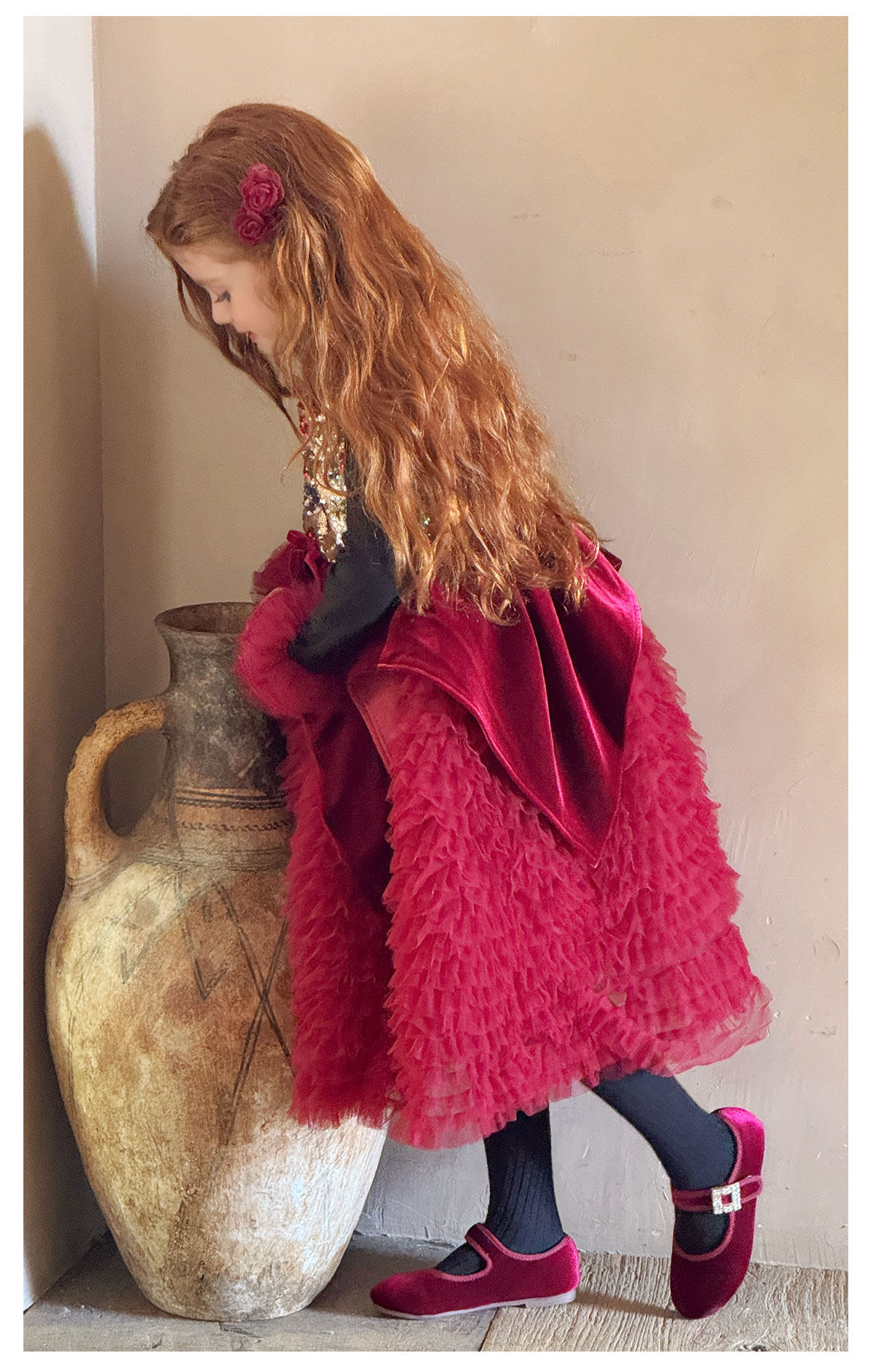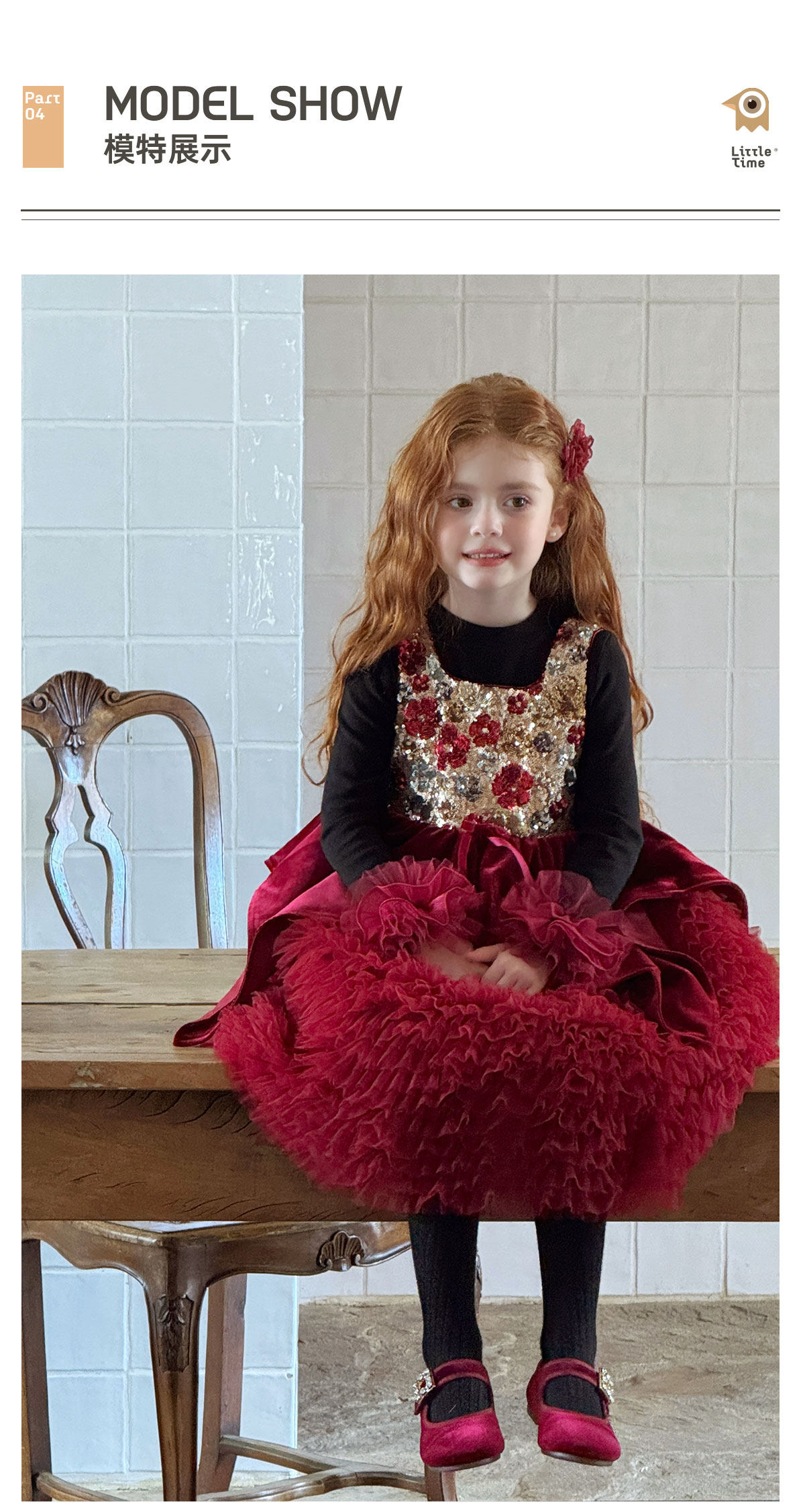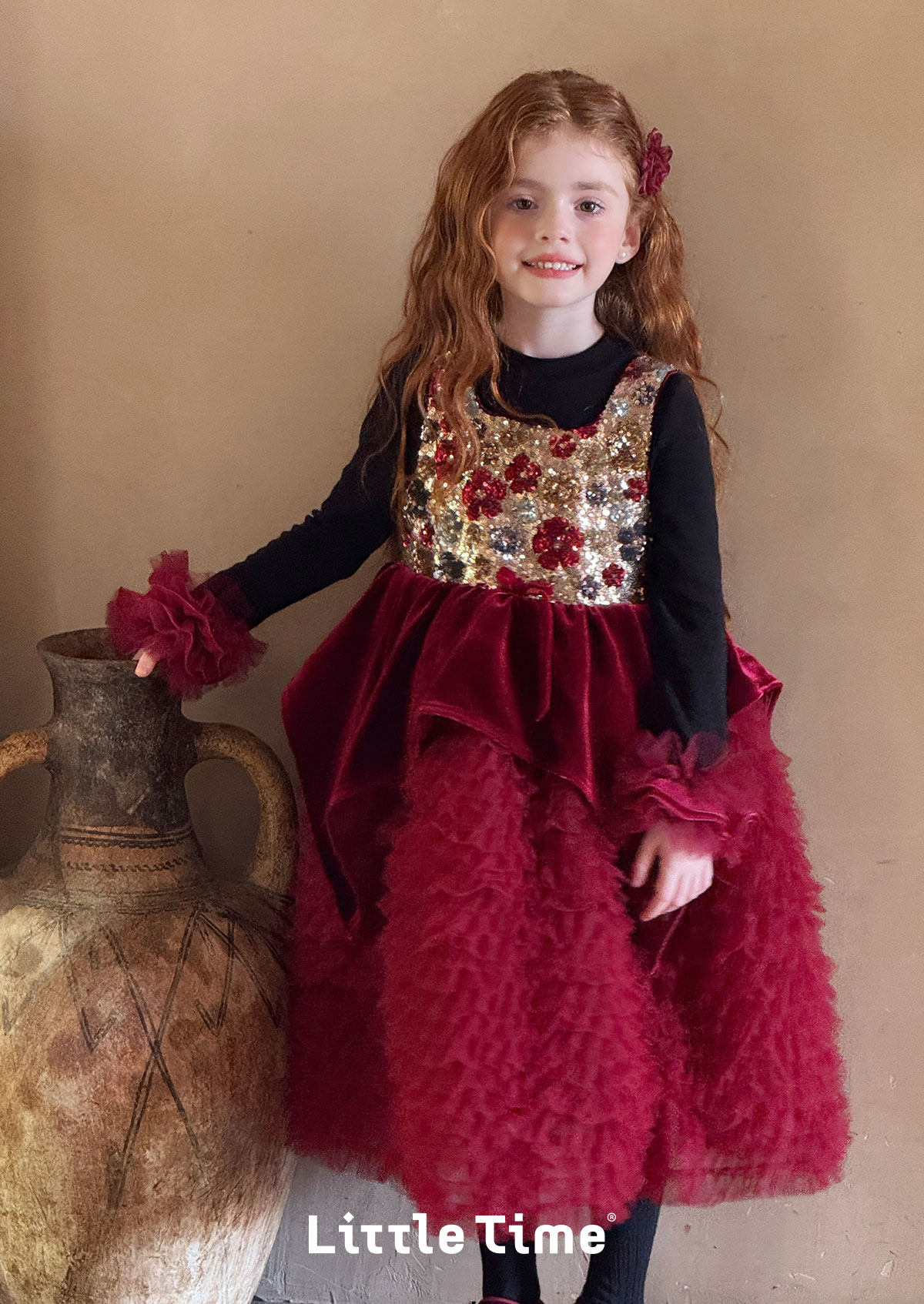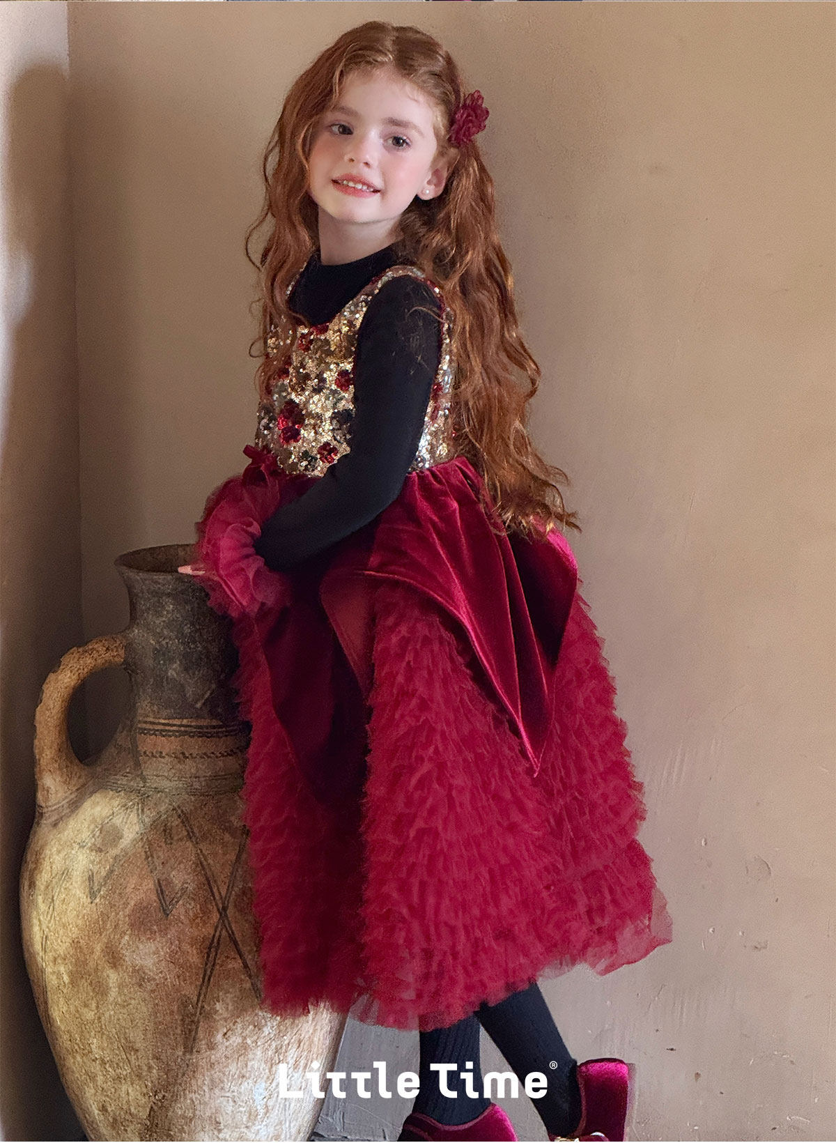littletime女童酒红金丝绒裙2022秋冬新款拜年服长袖公主连衣裙