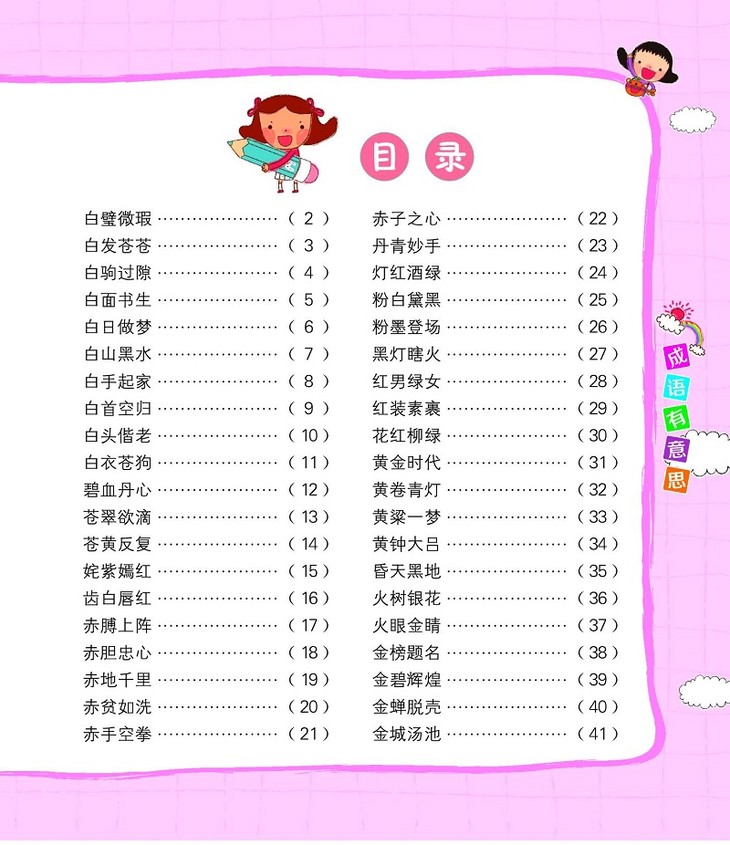 。游戏部分是本套书的特色,它通过形式多样的文字游戏启发孩子的思维,让孩子在潜移默化中就能理解和掌握大量成语,并且学会对学过的成语进行分类整理。另外,有趣多彩的配图为孩子营造生动活泼的阅读环境。