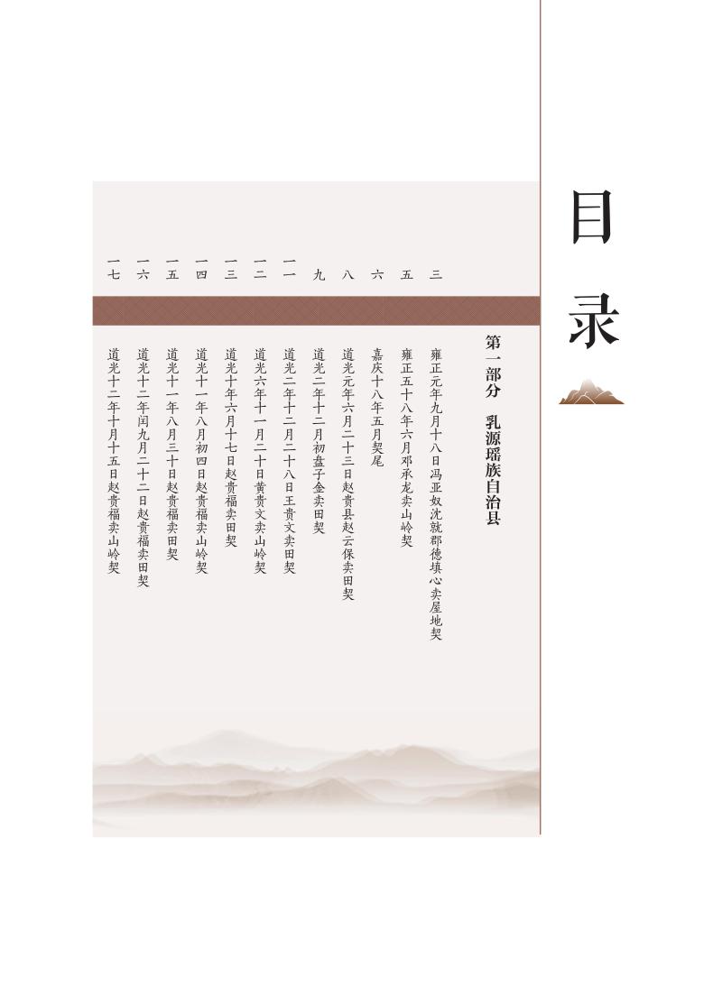 《南岭走廊契约文书汇编(1683—1949年)》所收契约文书按地域分为五卷,分别是粤北卷,郴州卷,贺州卷,桂林、柳州、来宾、贵港卷,衡阳、永州、浏阳、玉林、赣州卷,正文结构为文书编号、文书名称、文书转录内容、文书照片。本卷《粤北卷》,收集了清远辖下连山、连南,韶关辖下乳源等地的契约文书共404份,涉及买卖田地、屋地、牛栏、菜园、山岭林木契据,典当、借贷、股份契据,收据、分家契据等方面内容,对研究清朝和民国时期的粤北历史文化有着重要的史料价值。