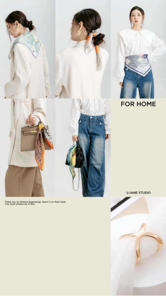 丝巾不仅仅只能系在脖颈 可以做三角领巾披在衣服外 可以作为头饰或者发饰 可以系在腰间做装饰可以系在包包上, 手腕上,脚腕上等等