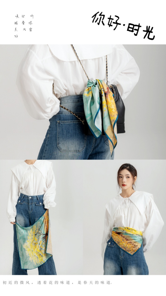 春季拥有精致贵感的秘诀是.当然是戴上一条丝巾啦! 一到初春走在大街上看到的都是黑白灰棕 而丝巾搭配纯色衣服效果是最显著的 毫不费力的优雅贵气当然真丝丝巾是最近的心头爱 取生活时尚色彩为元素予以100%6A级桑蚕丝制作 小众华丽而有趣 希望这条有时间魔法的丝巾 能为你定格生活中所有美好瞬间