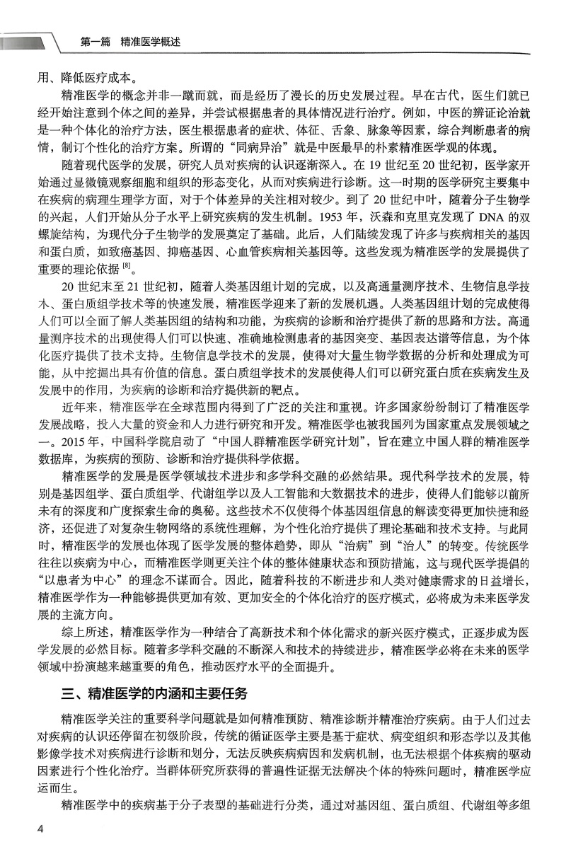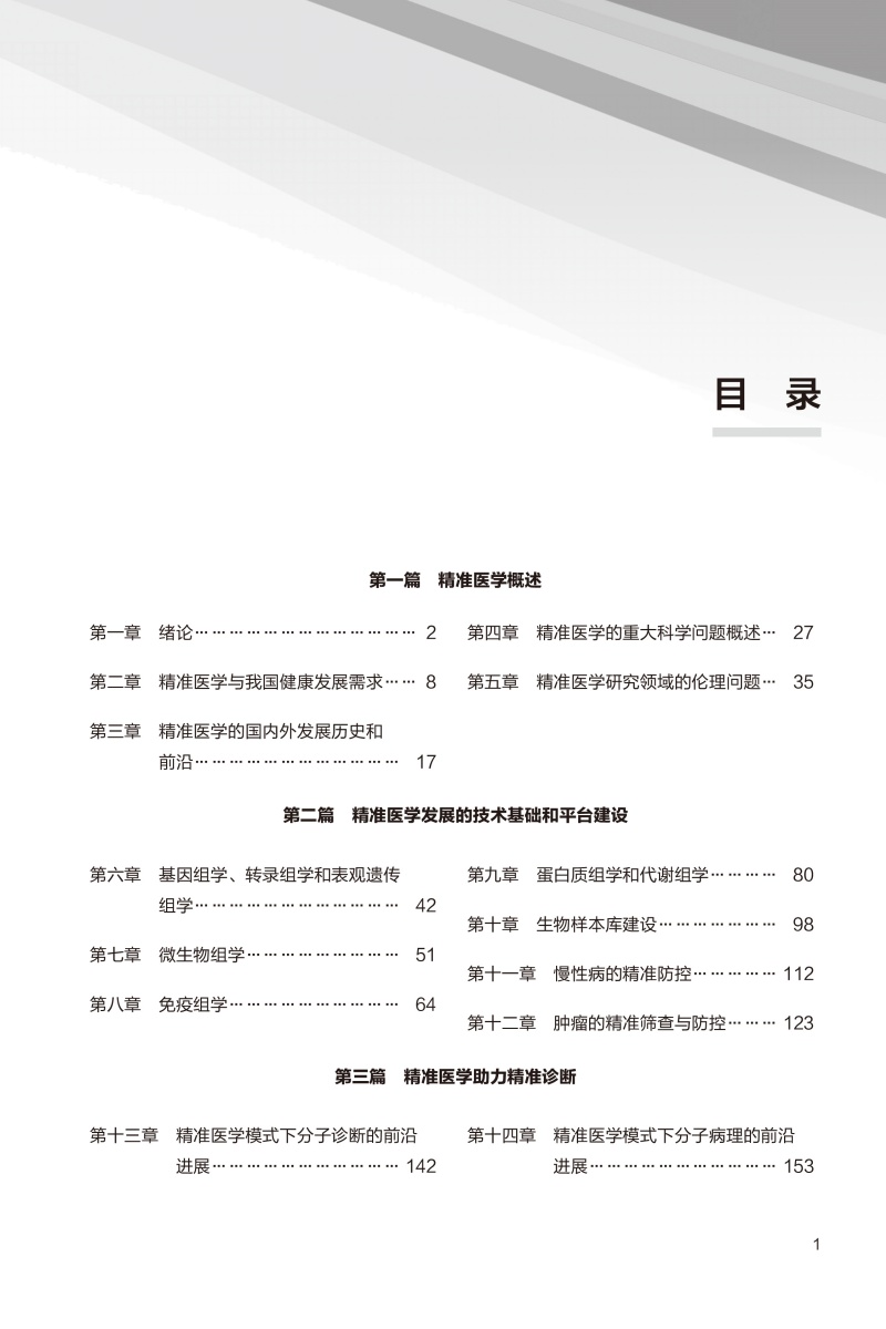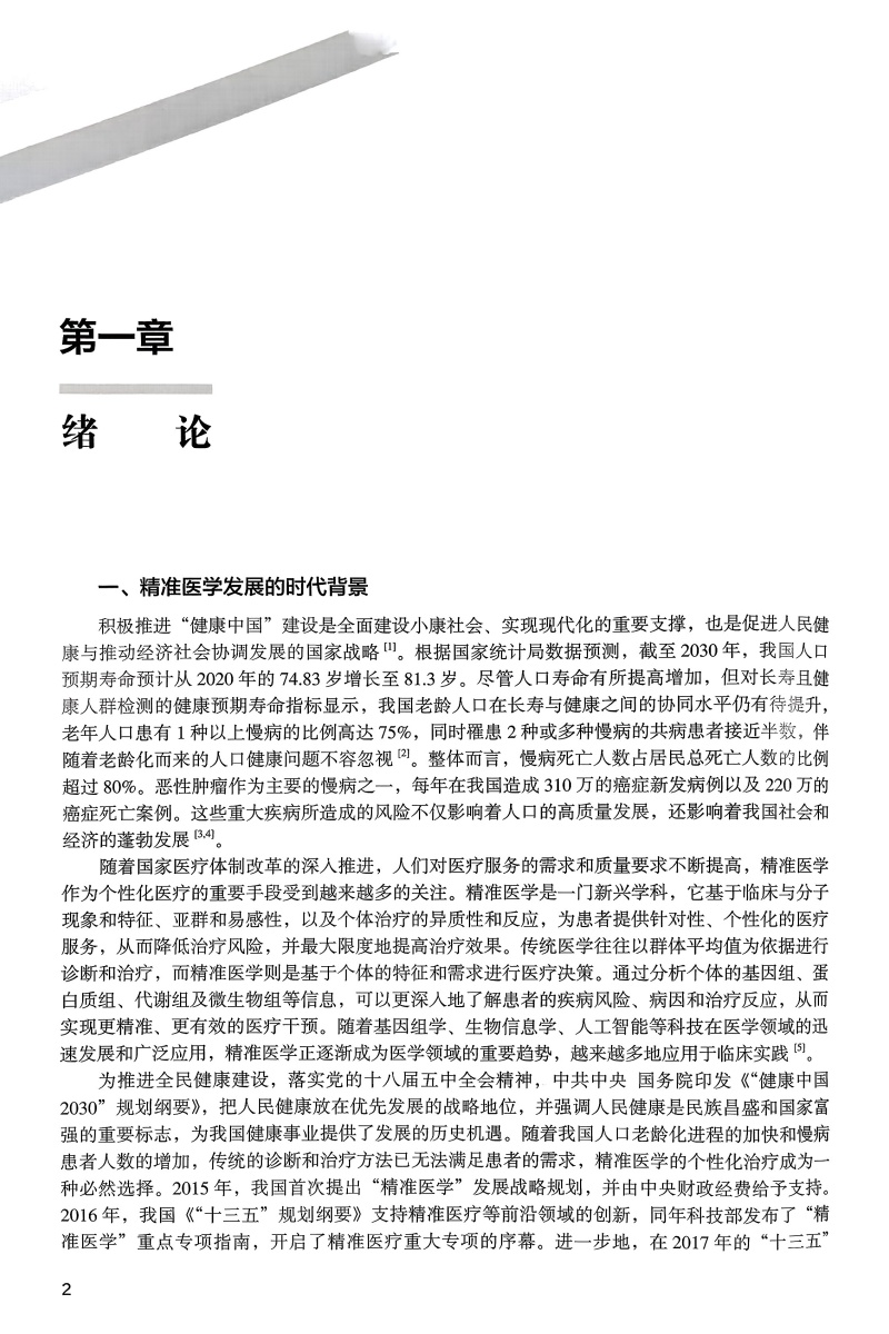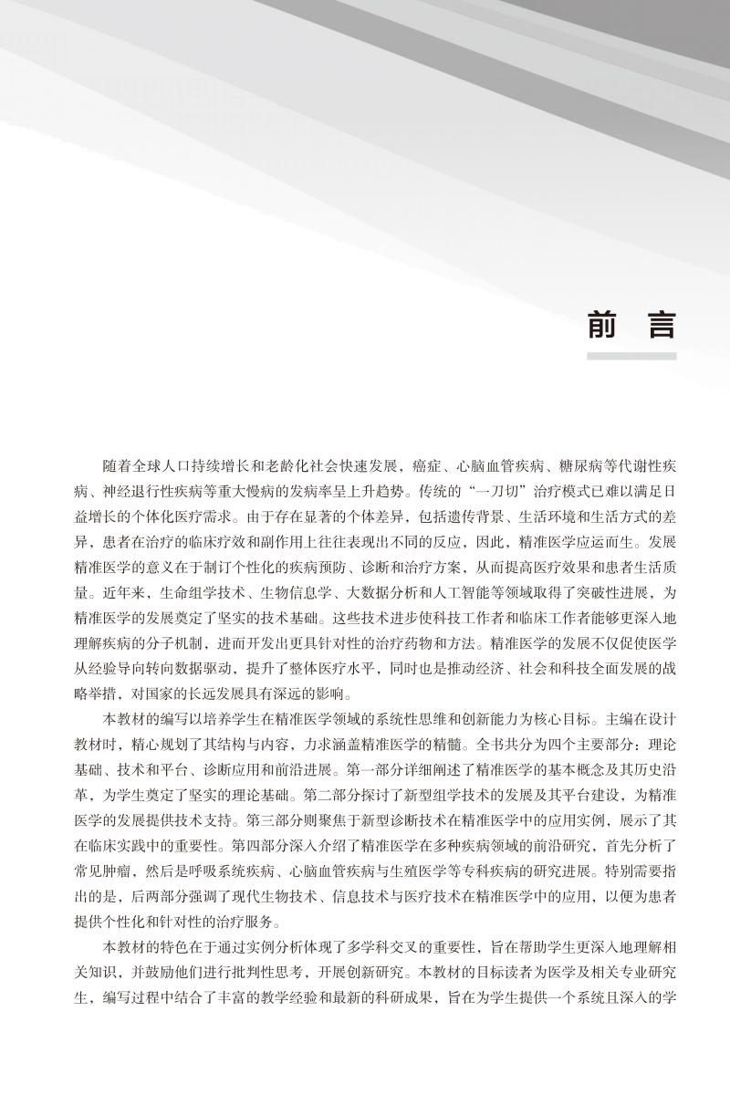 我国在重大疾病的诊疗方面仍面临着巨大的挑战。因此,系统地加强精准医学研究布局,对于我国重大疾病防控和促进全民健康,对于我国未来占据医学发展高地以及推动我国生命健康产业发展具有重要意义。本教材分为四部分共四十三章,第一部分为“精准医学概述”,主要介绍了精准医学的概念、历史发展及重大科学问题;第二部分为“精准医学发展的技术基础和平台建设”,主要介绍了基因组学、蛋白组学、代谢组学、免疫组学及微生物组学等组学技术以及生物样本库的建设,为精准医学的发展夯实了基础;第三部分为“精准医学助力精准诊疗”,介绍了包含分子诊断、分子影像、分子病理、人工智能及大数据整合等新型诊断技术,第四部分为“精准医学在疾病中的诊断治疗前沿进展等”,该部分细致地展开介绍了精准医学在不同肿瘤疾病、慢性疾病、呼吸疾病、心脑血管疾病及生殖医学等领域的前沿进展,后两部分着重描述了精准医学如何利用现代生物技术、信息技术和医疗技术,为患者提供针对性、个性化的医疗服务。
