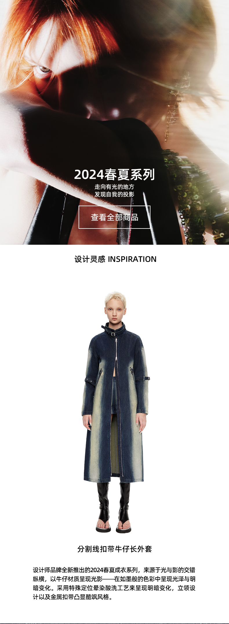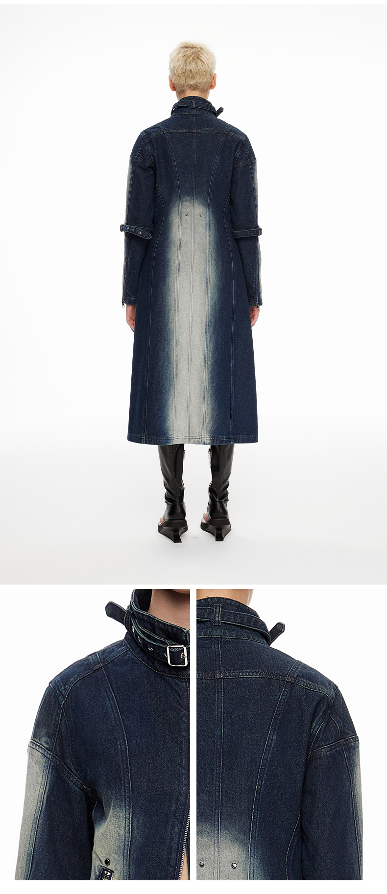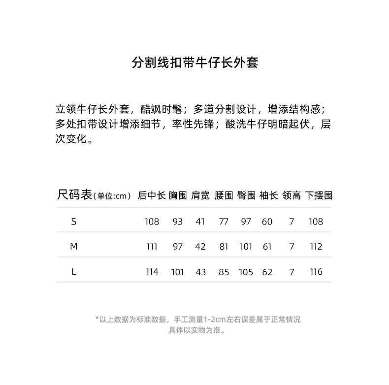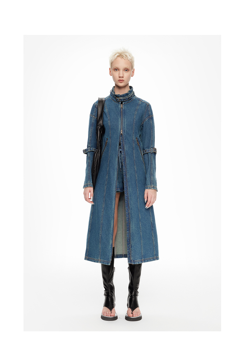 lost in echo2024春季新品设计师品牌分割线扣带酸洗牛仔长外套