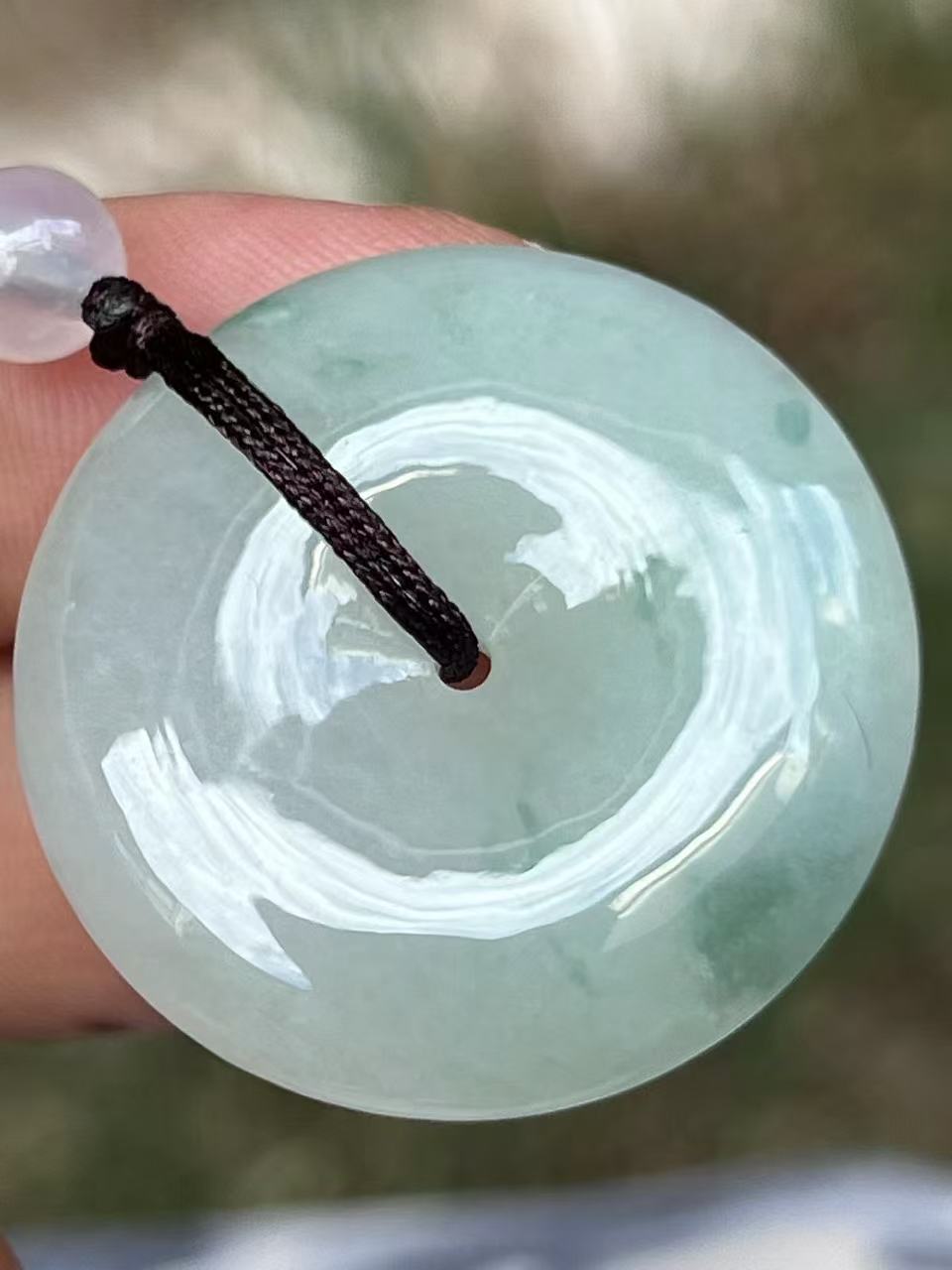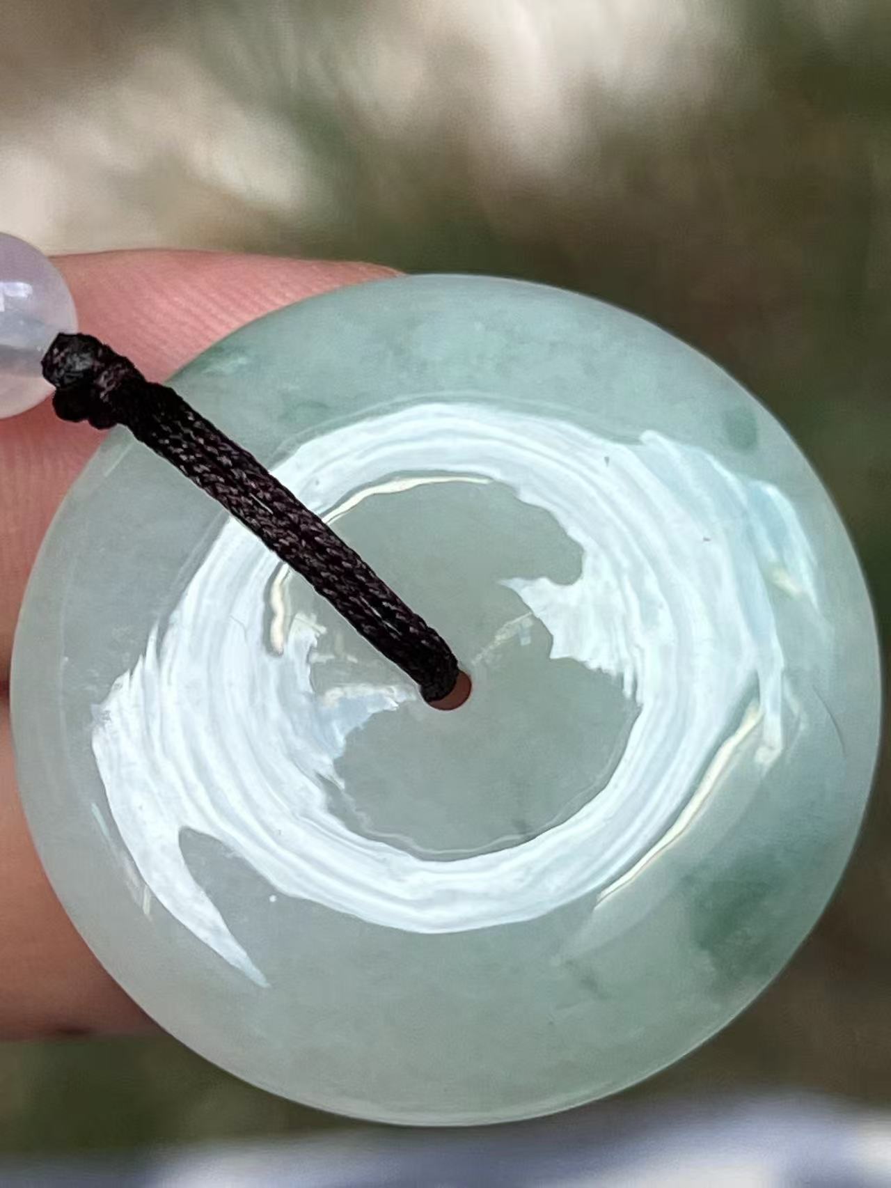 天然A货翡翠,冰润底子澄澈如水,幽幽兰花翩然绽放,似墨韵染宣,清雅自成。手工精雕平安扣,形如满月,佩之温润生香。每一缕飘花都是时光的笔触,戴一份文人风骨,藏一世平安喜乐。