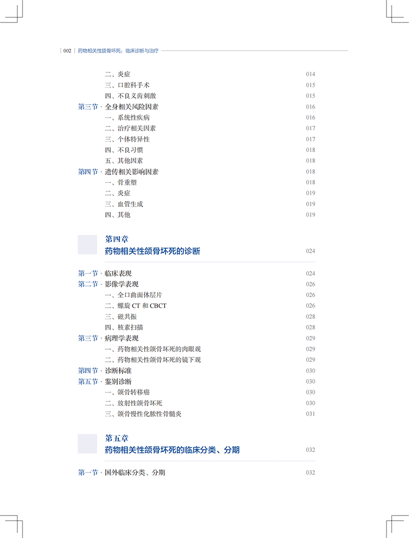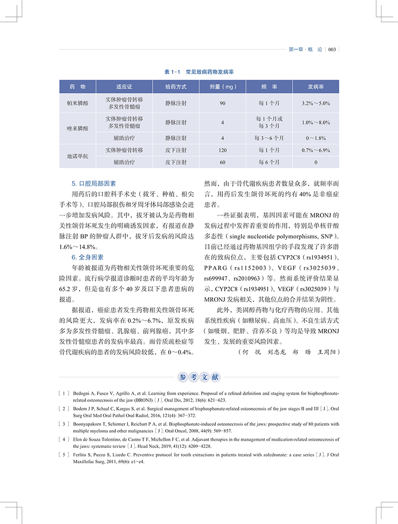 药物相关性颌骨坏死(medication‐related osteonecrosis of the jaw,MRONJ)是指因骨质疏松、 恶性肿瘤骨转移等疾病使用双膦酸盐类药物、抗血管生成类药物或类固醇类药物所致的颌骨代谢紊乱及骨坏死类疾病,是口腔颌面外科、肿瘤科、影像科、内分泌科、风湿免疫科、骨科等共同面临的临床难题。本书旨在系统性地阐述药物相关性颌骨坏死的临床、影像、病因及病理,着重强调该疾病的临床诊断和分类分期,将药物相关性颌骨坏死的规范化诊疗提到一个新的高度。全书内容分为大致分为三个部分(十个章节),第一部分主要介绍药物相关性颌骨坏死的定义、流行病学、病因等的研究进展;第二部分主要从临床表现、诊断、分类分期等方面着手,重点阐述药物相关性颌骨坏死的诊断标准及分级体系;第三部分为药物相关性颌骨坏死的临床治疗及疗效评价,循序渐进地介绍国内目前关于药物相关性颌骨坏死的非手术及手术治疗方案、术后护理及预后评估。