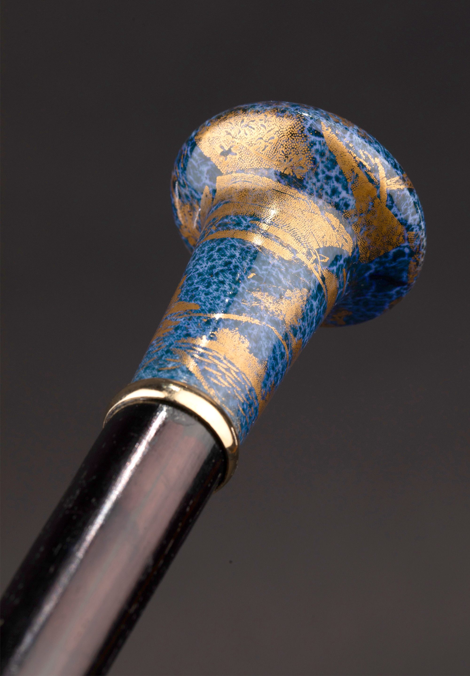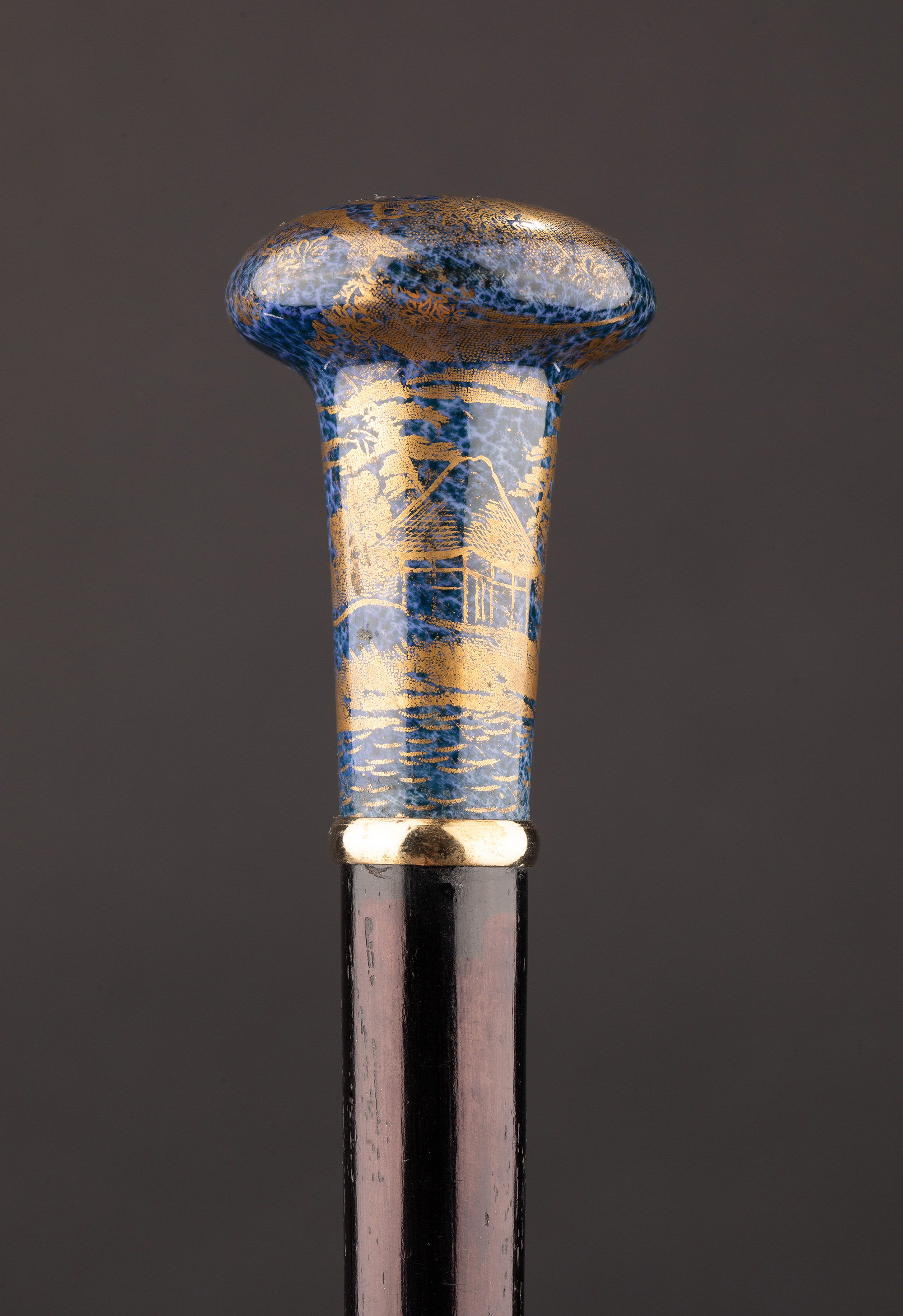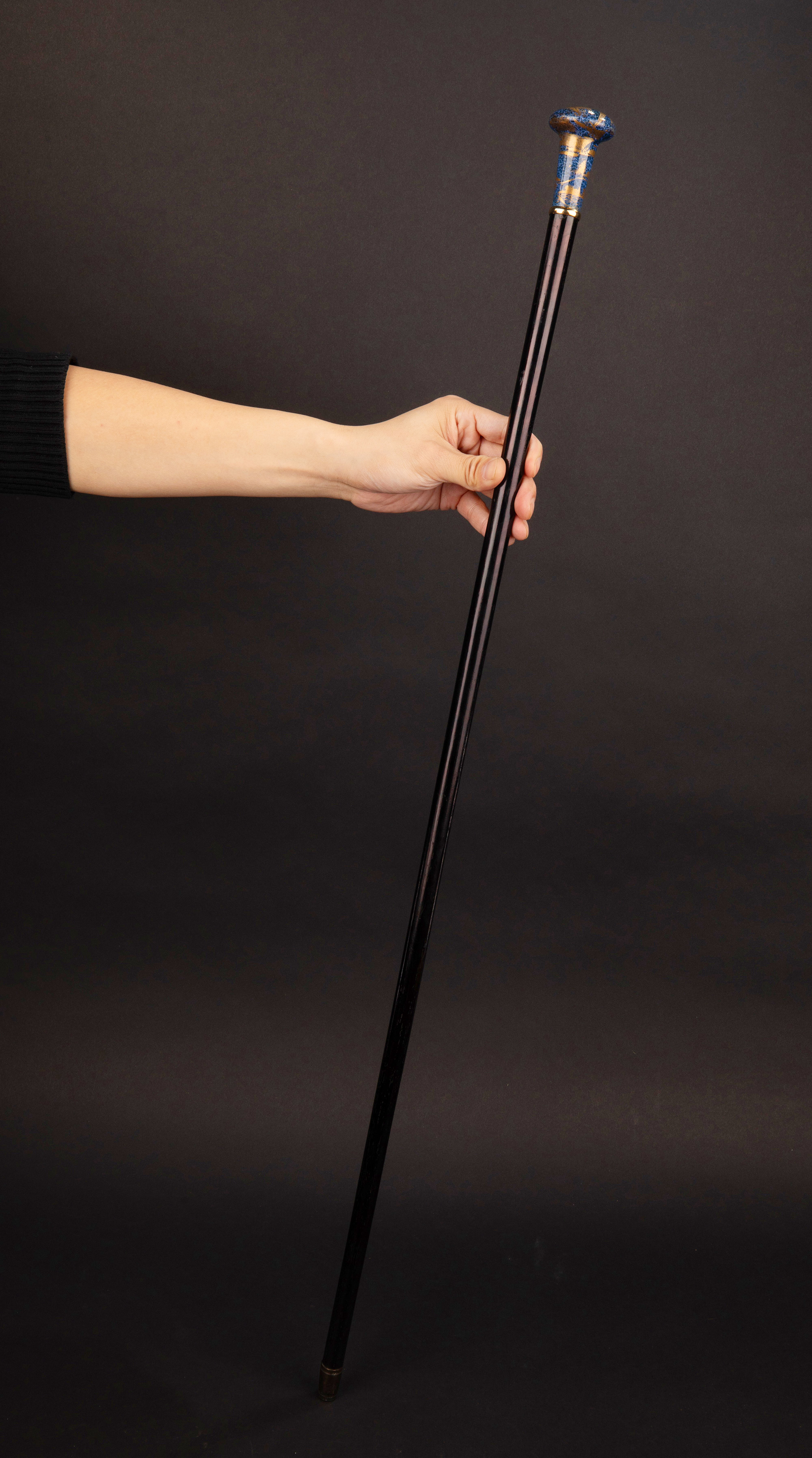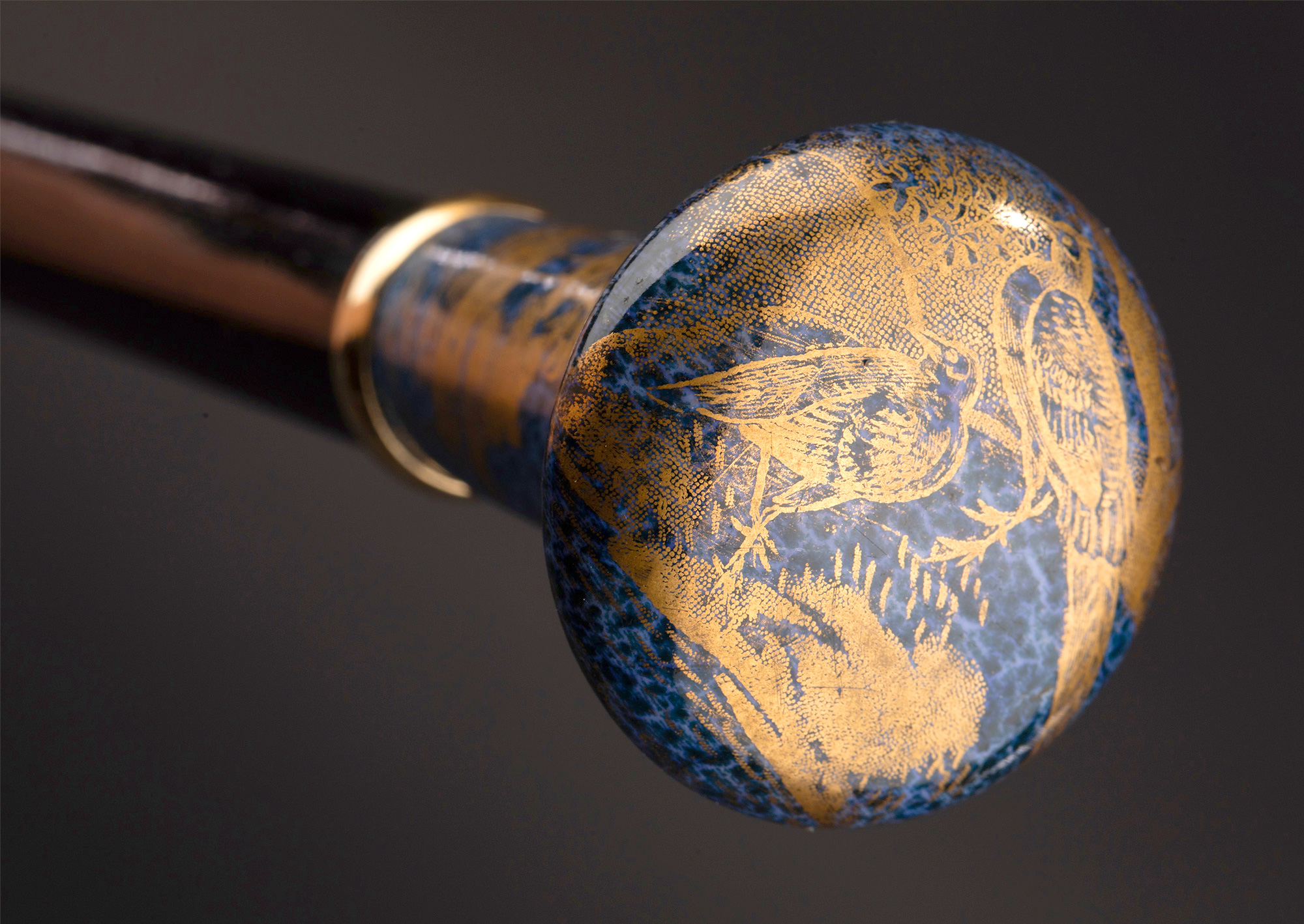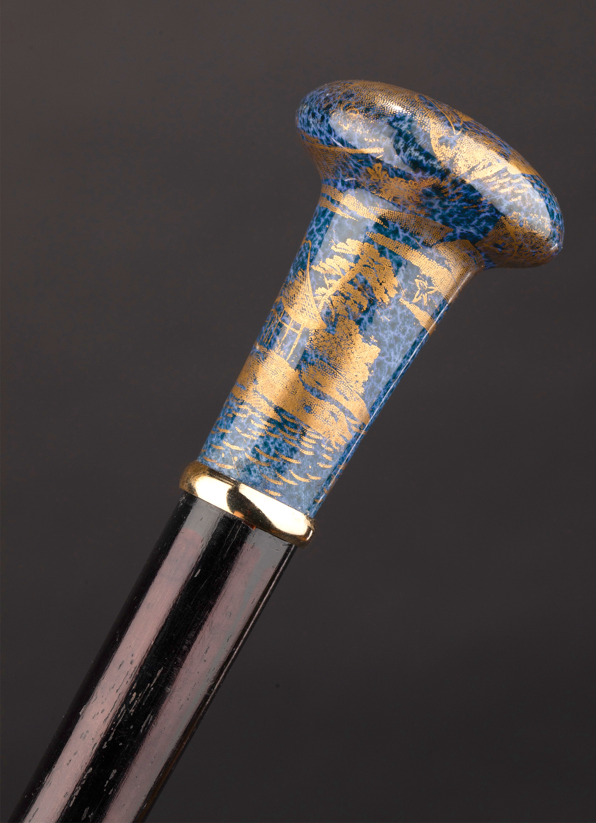 1910年代中国出品蓝地描金花鸟纹主题瓷手柄硬木手杖
