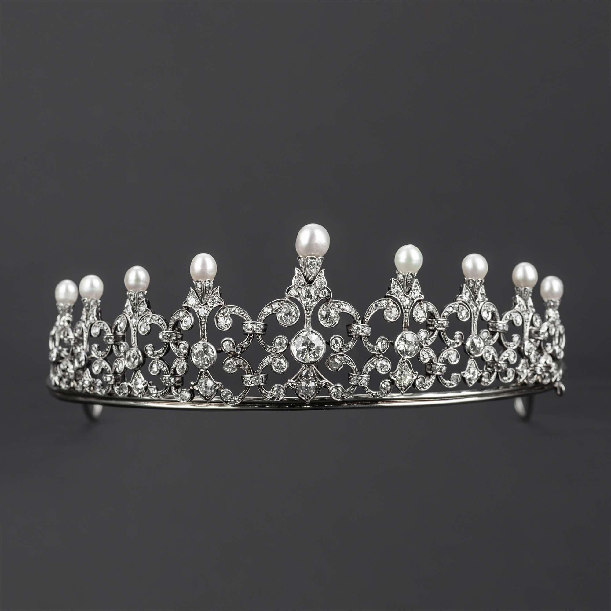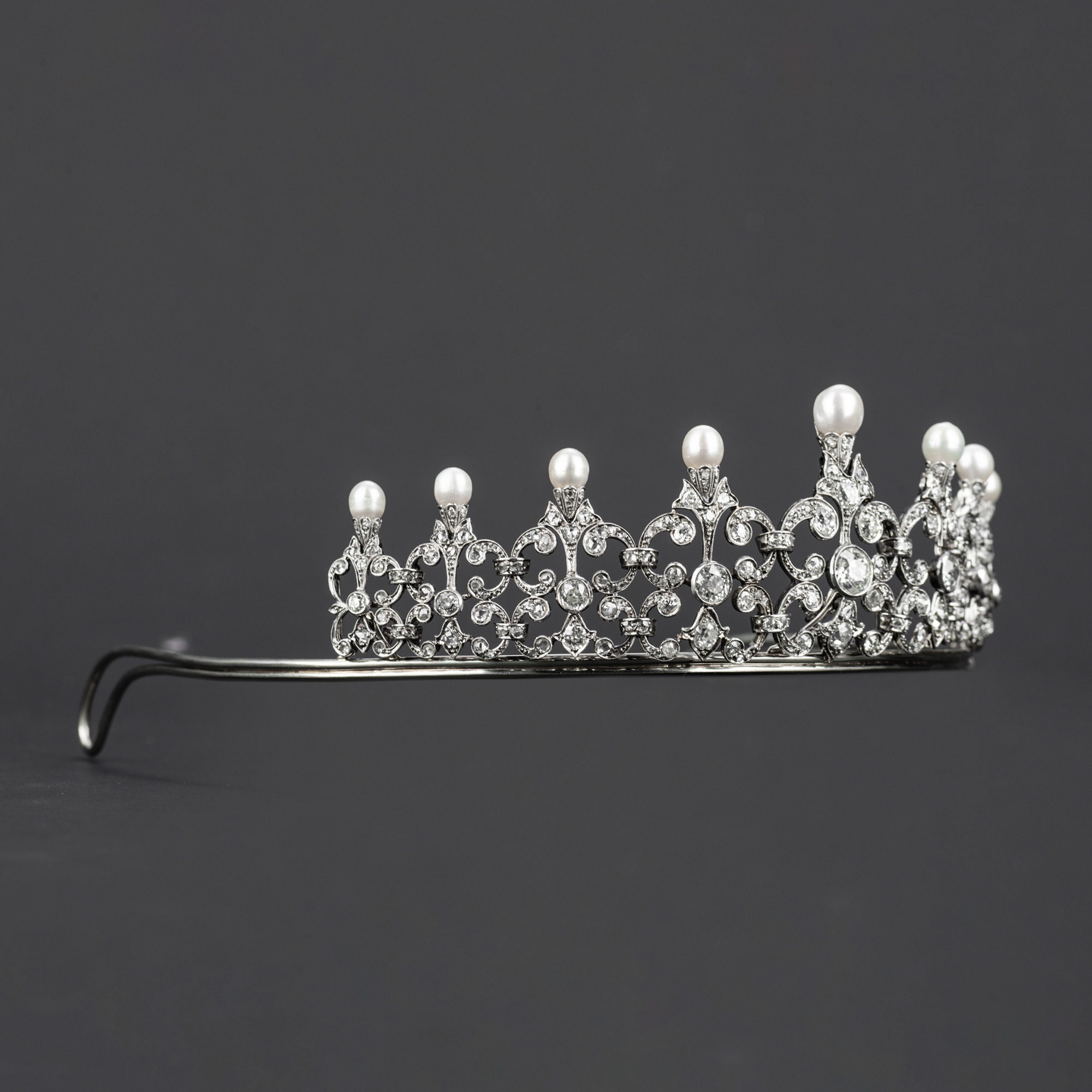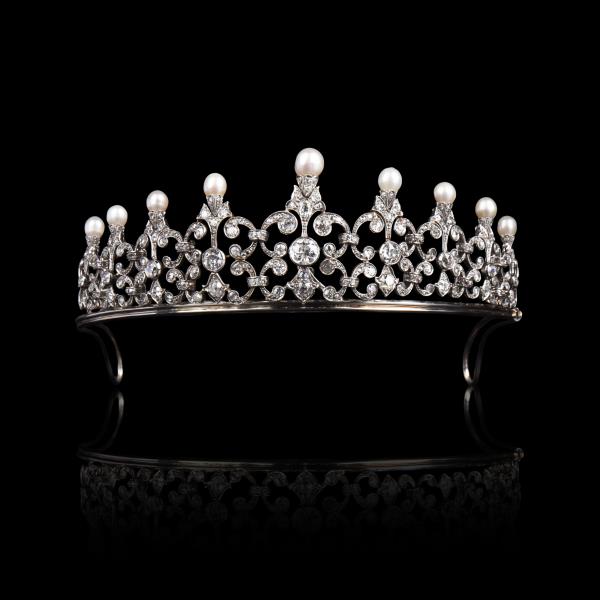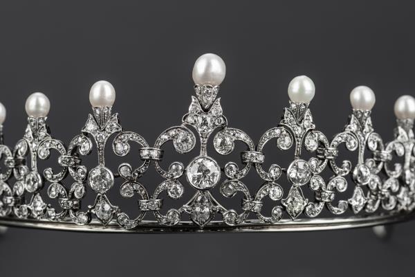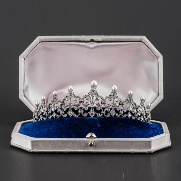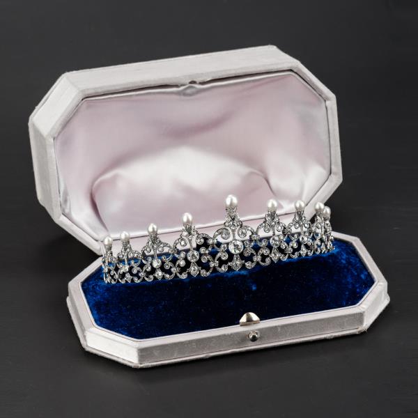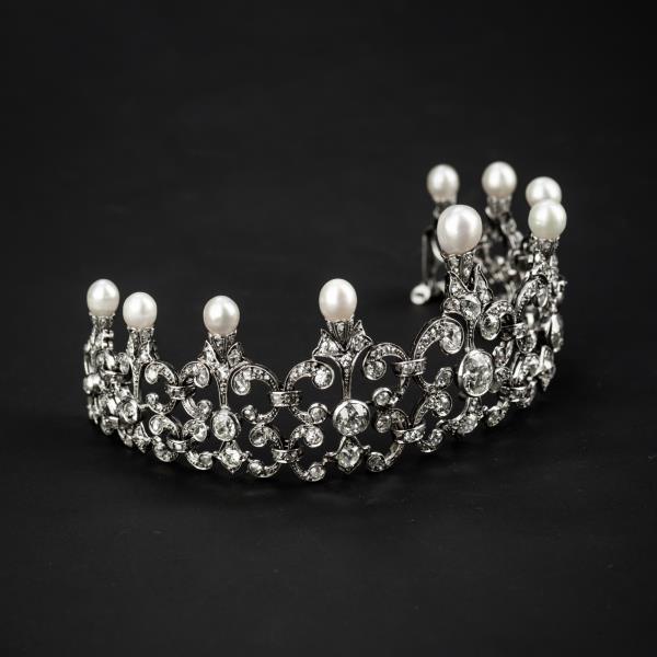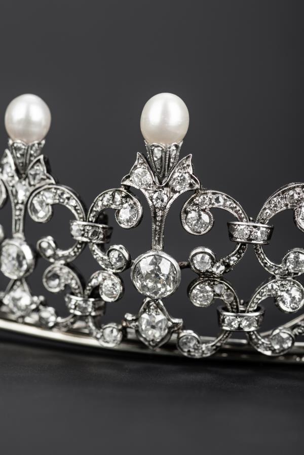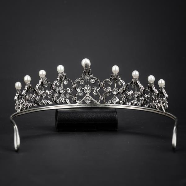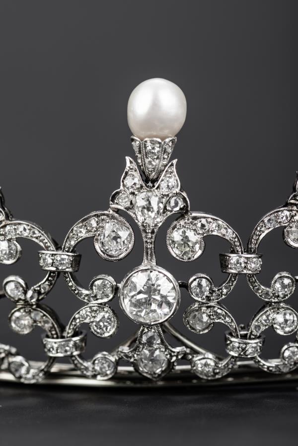 独角鹿西洋古董珠宝首饰1890年代欧洲金银叠打镶嵌钻石珍珠冠冕