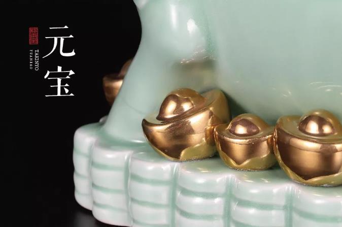 元宝以青瓷描金工艺制作,圆润晶亮。