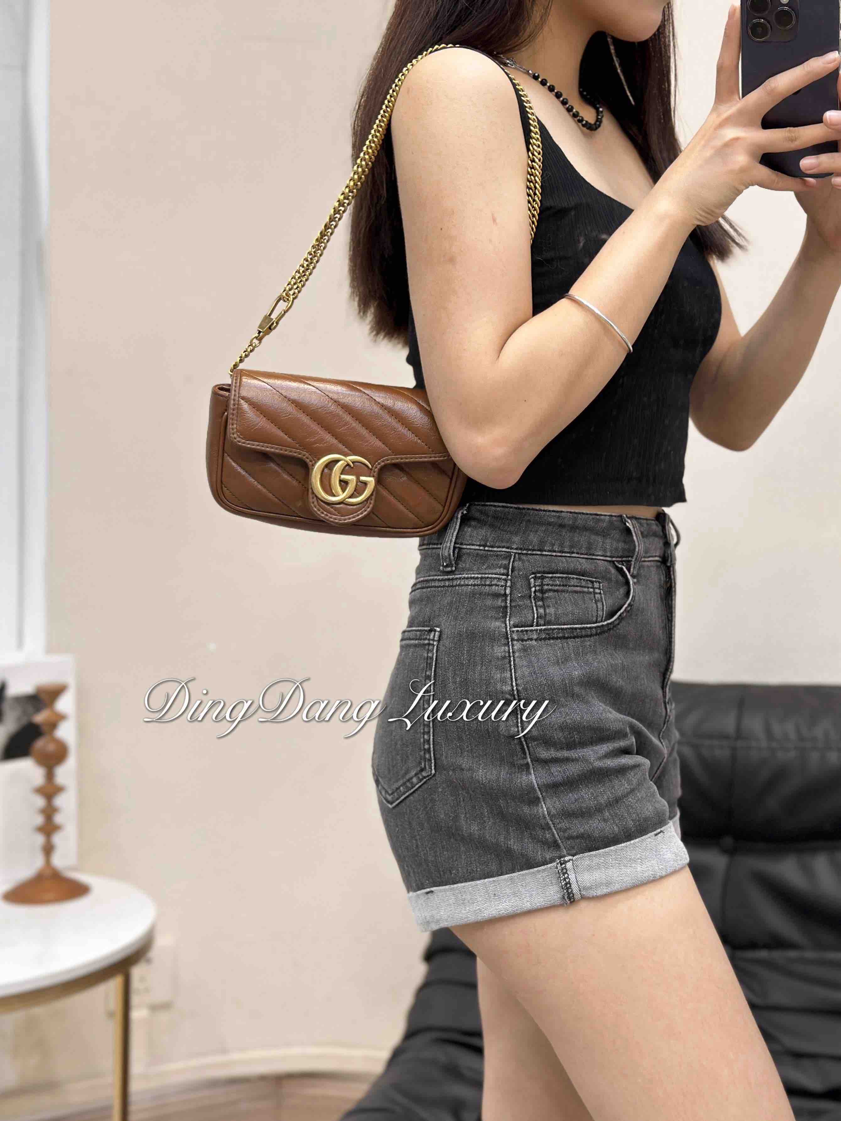 Gucci mini 棕色 牛皮 双g 马蒙 链条包