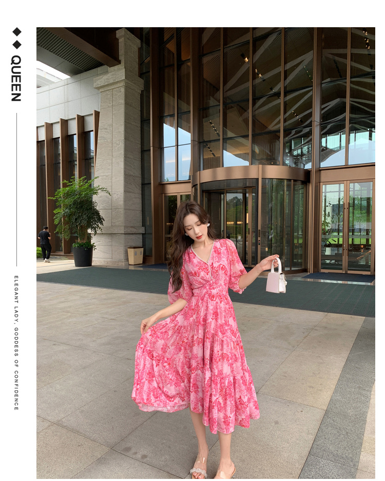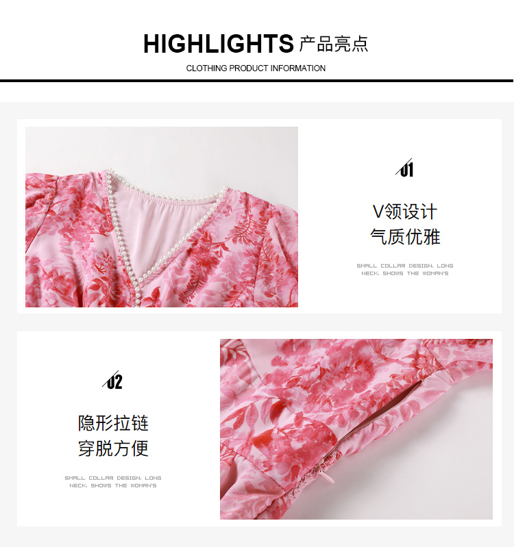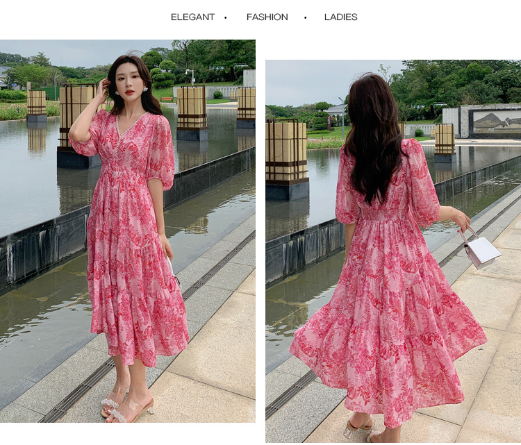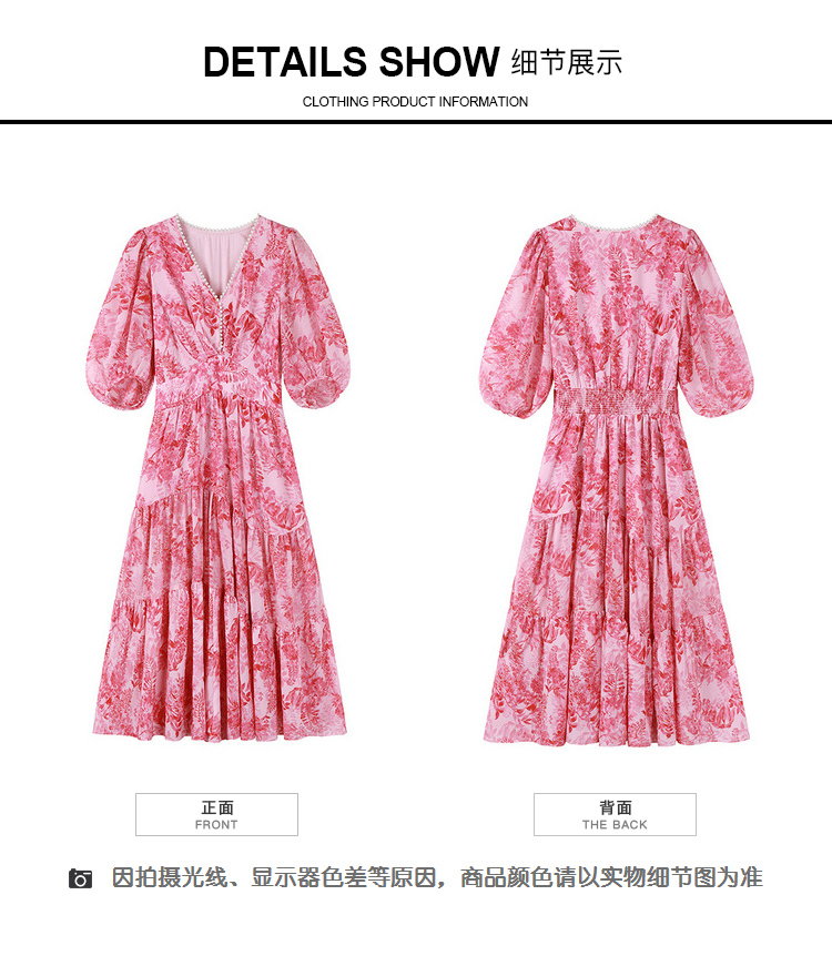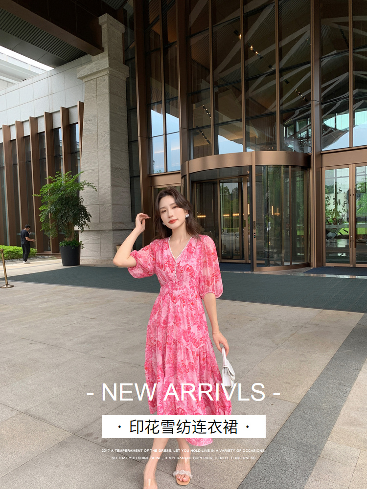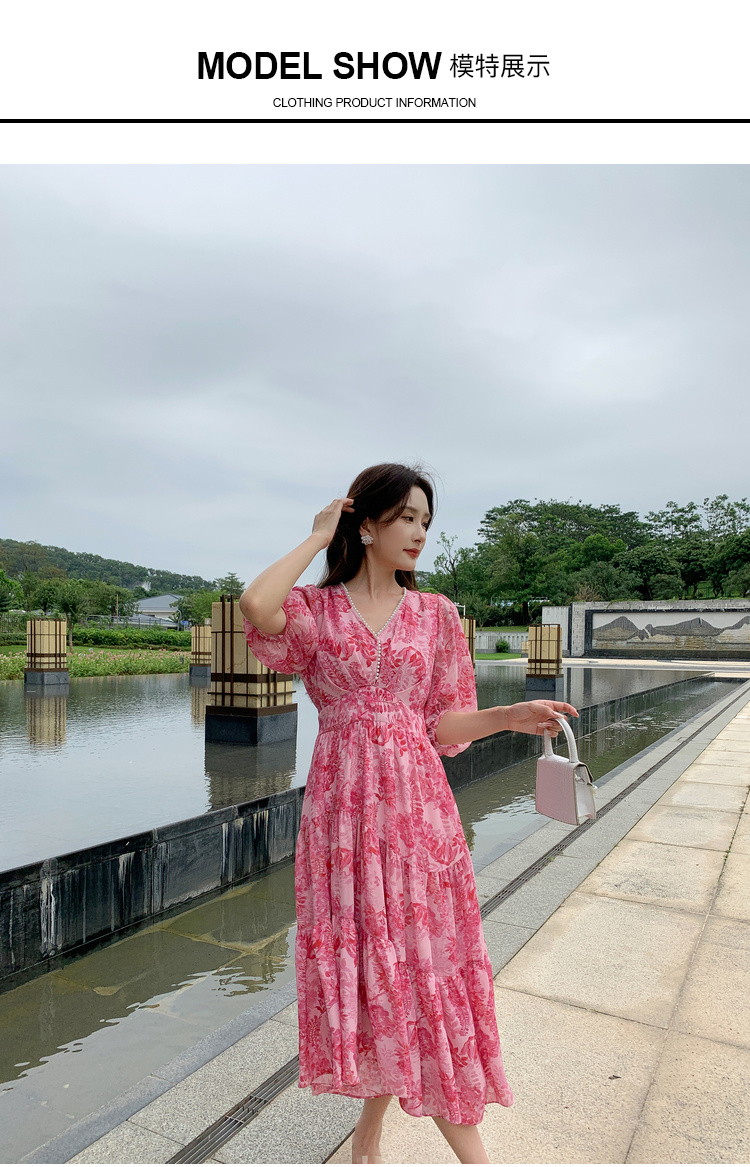 奢姿大码女装2024夏季减龄印花裙子胖妹妹雪纺V领七分袖连衣裙9942860156/