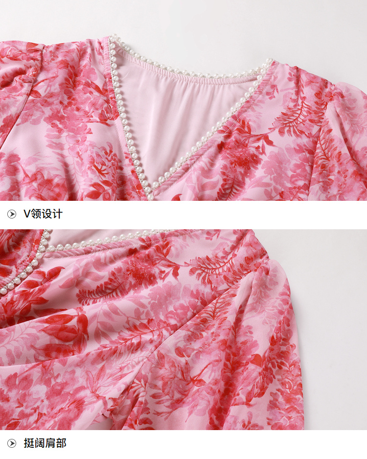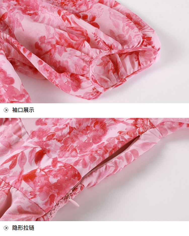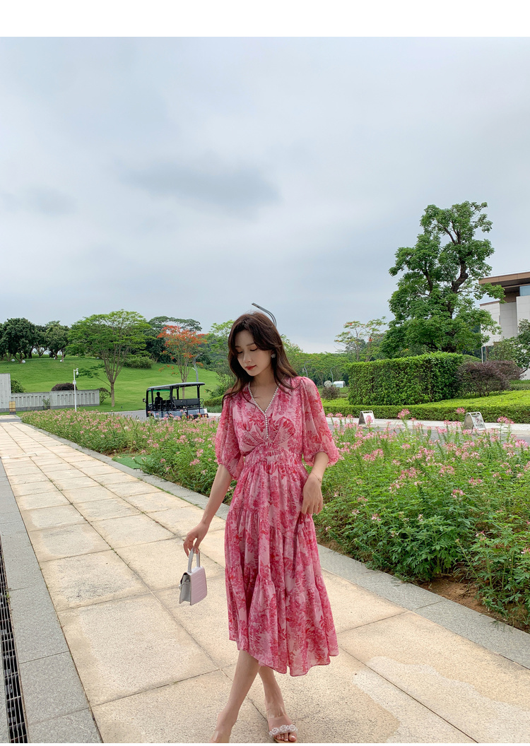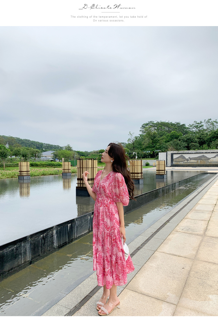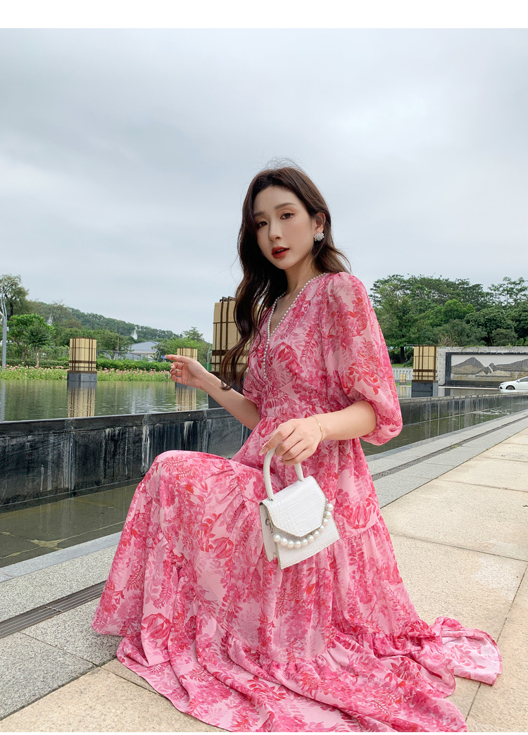 奢姿大码女装2024夏季减龄印花裙子胖妹妹雪纺V领七分袖连衣裙9942860156/