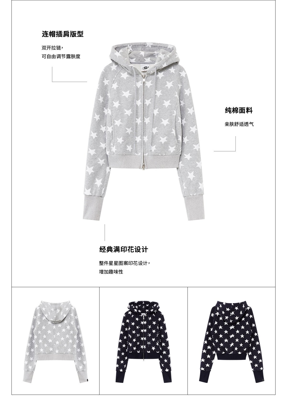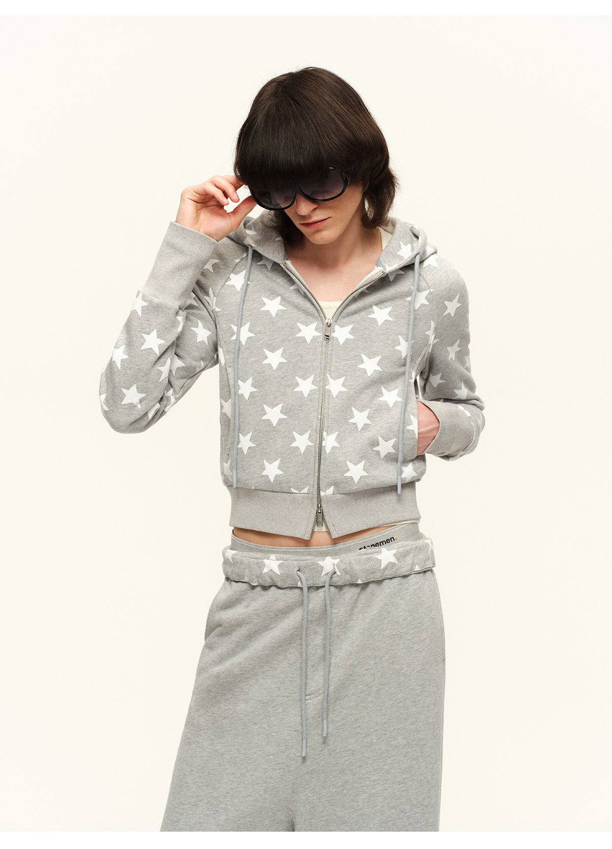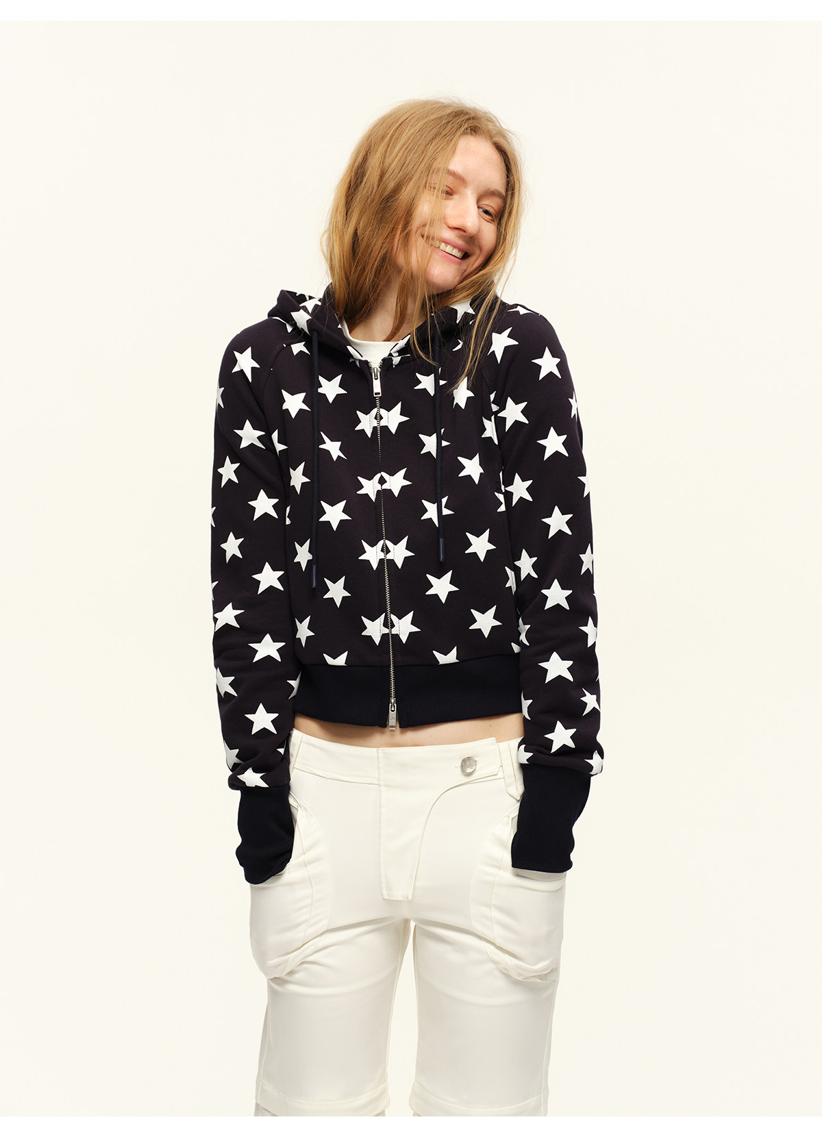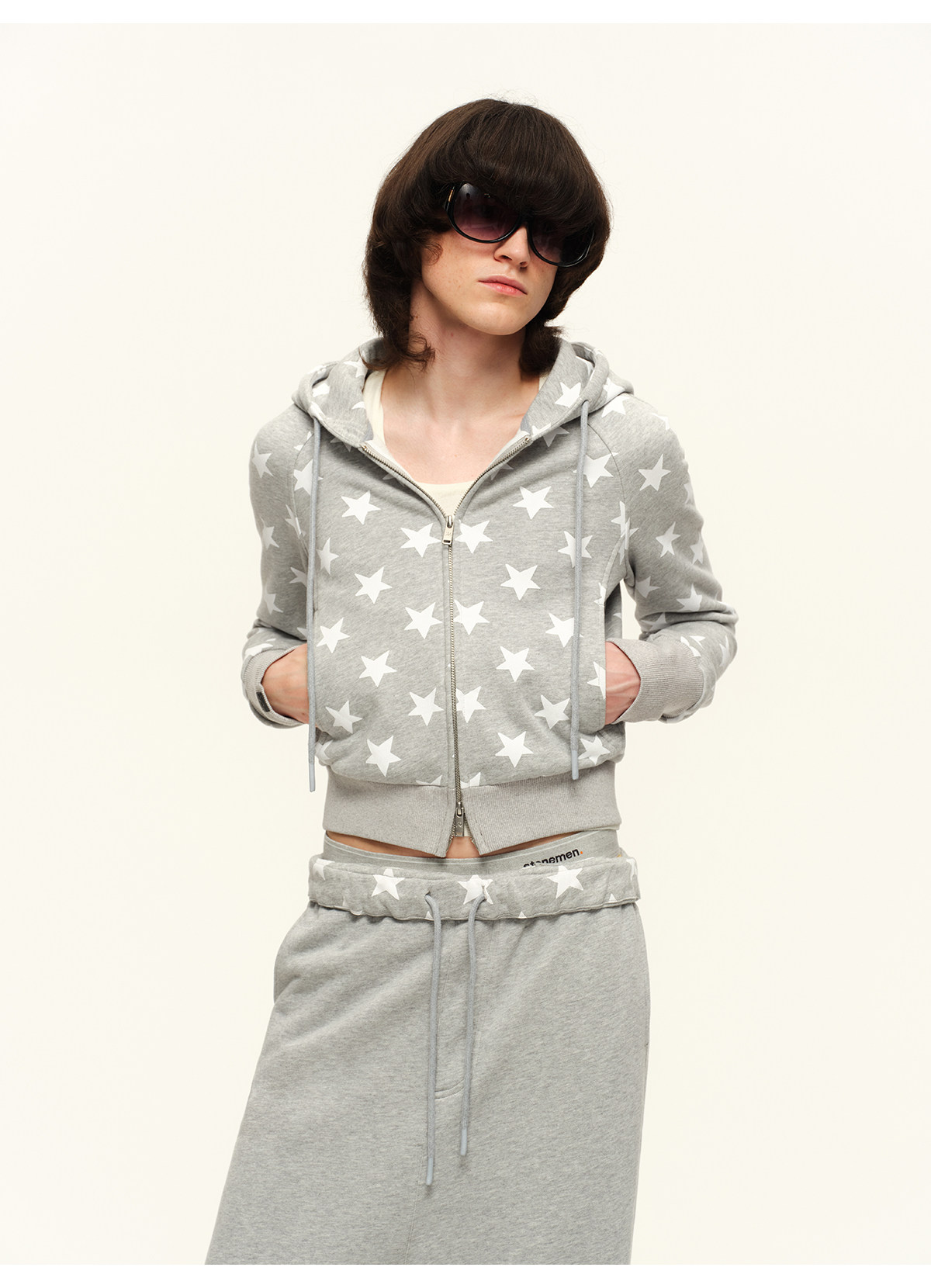出逃赤岗西/C26SSS021/双拉链星星印花全棉连帽卫衣
