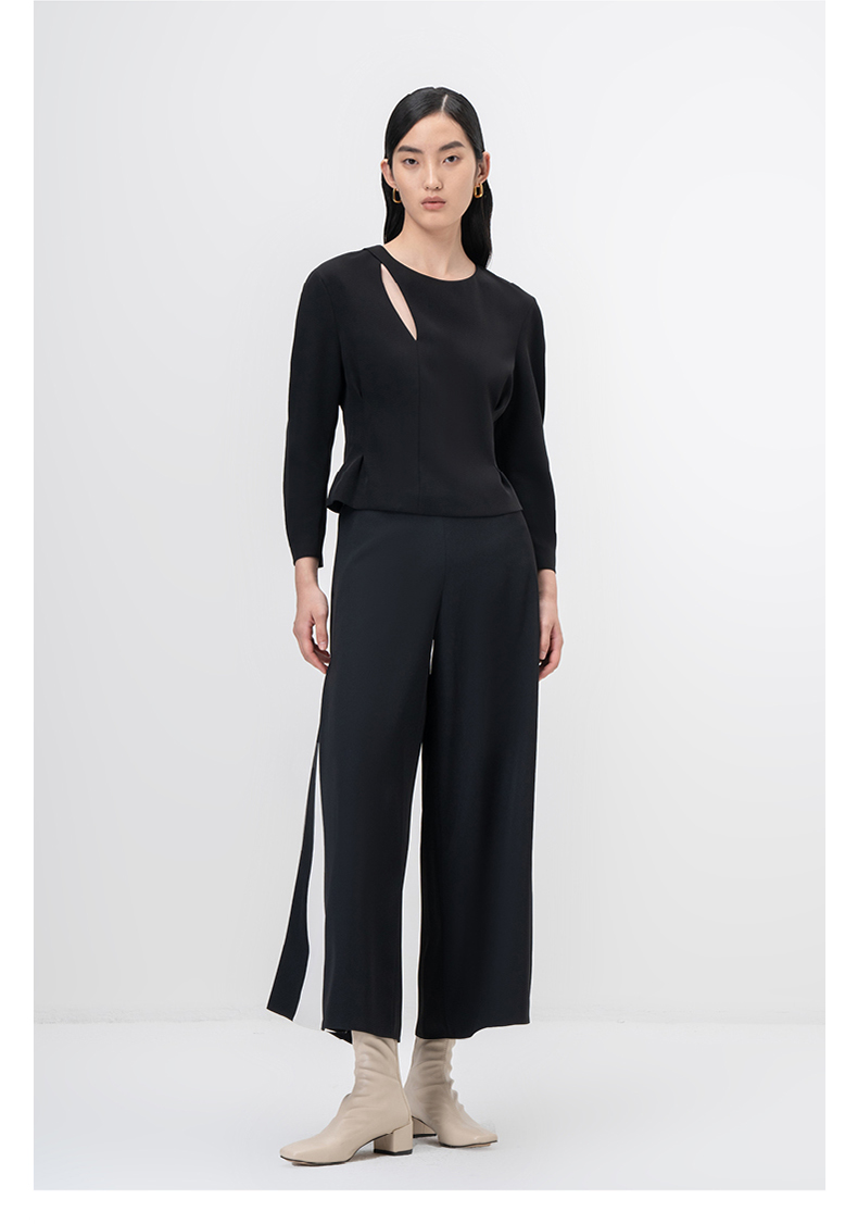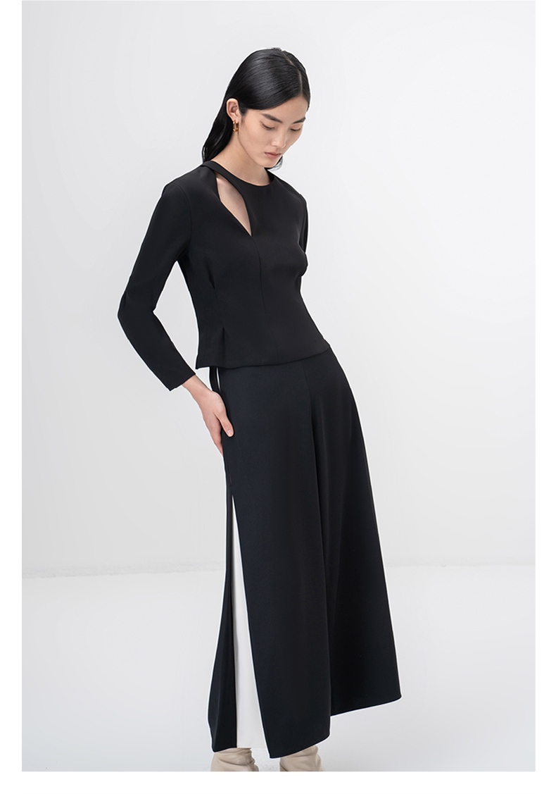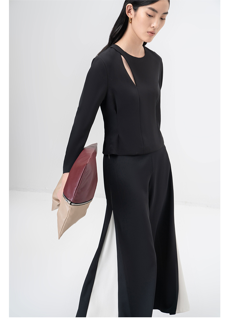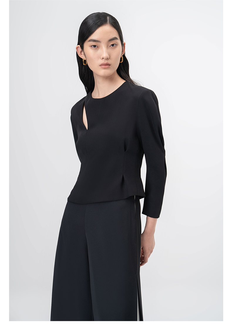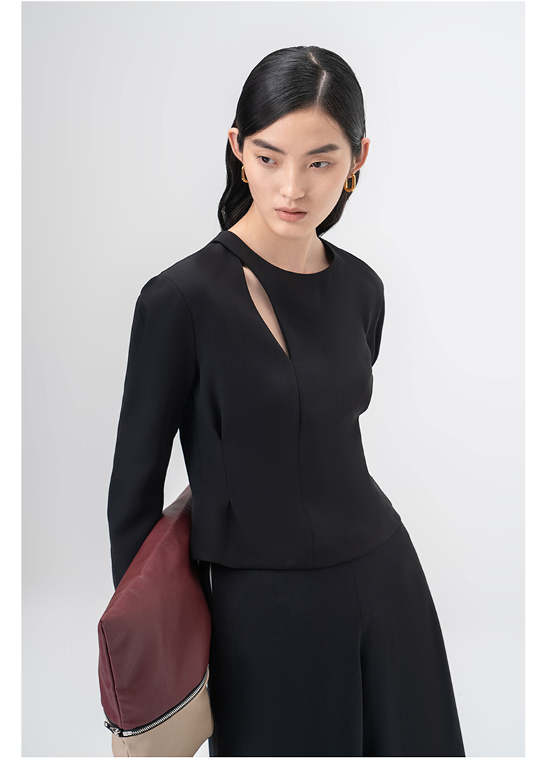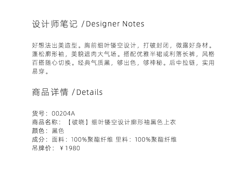 【破晓】细叶镂空拼接廓形袖黑色宽松上衣/00204A