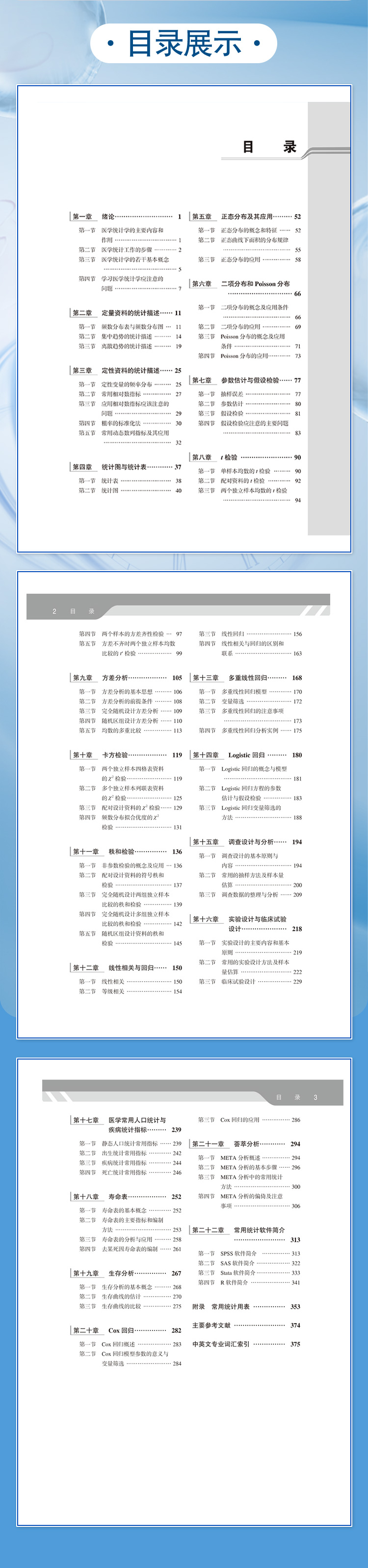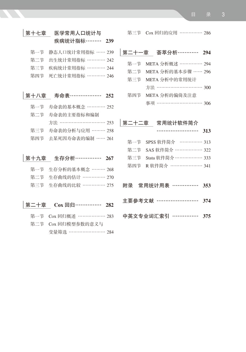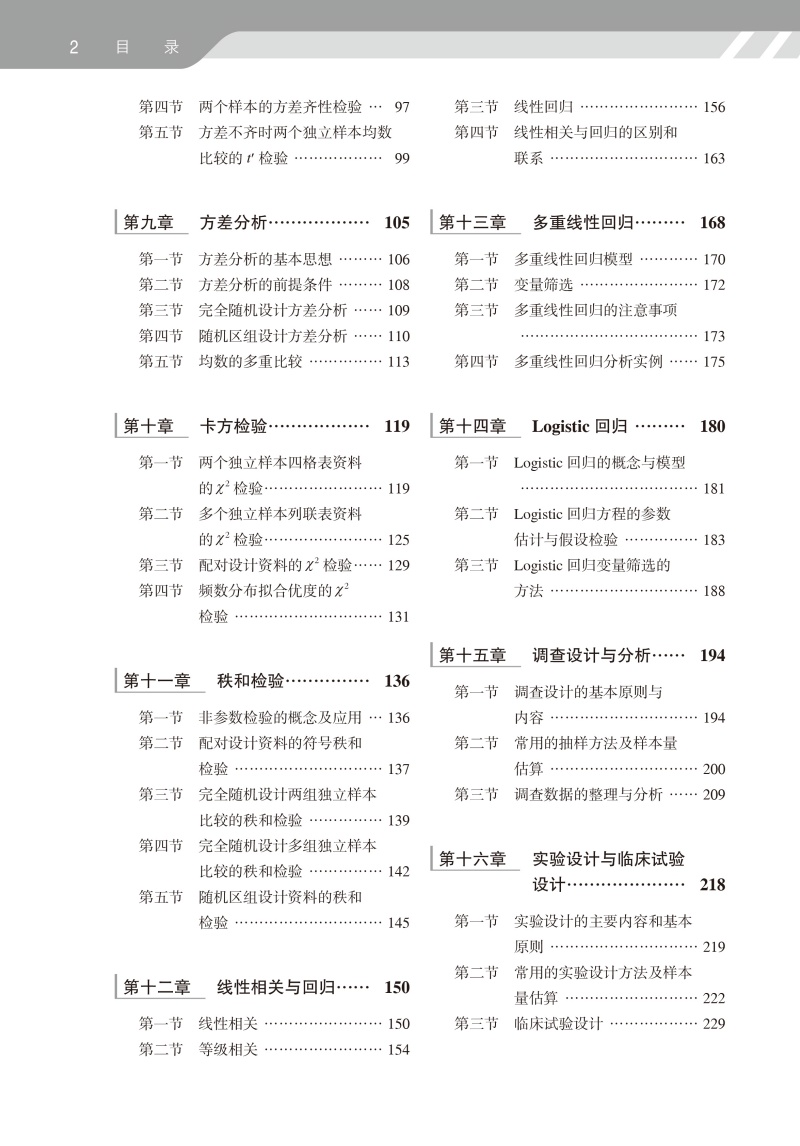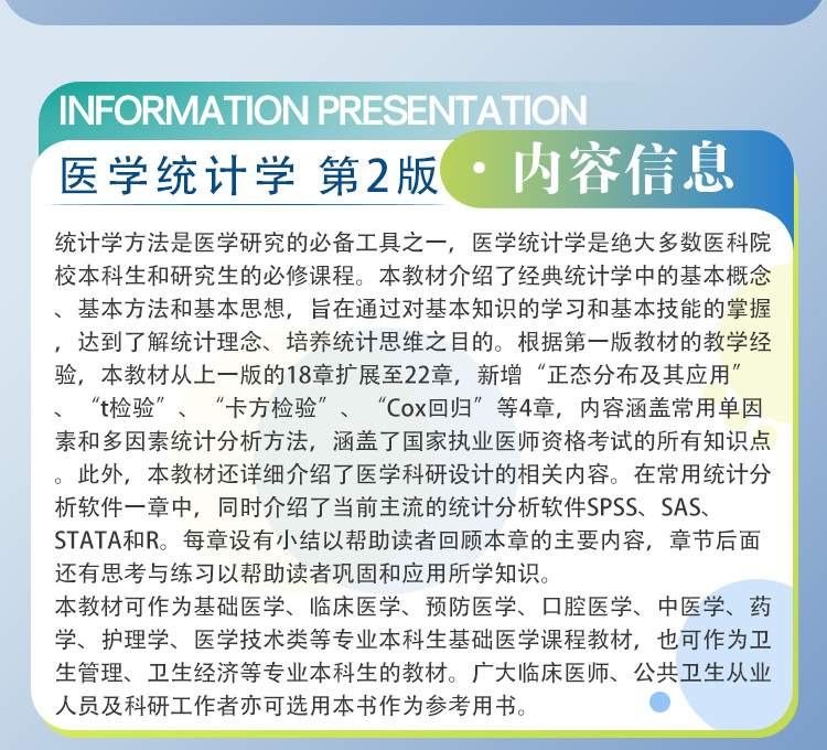统计学方法是医学研究的必备工具之一,医学统计学是绝大多数医科院校本科生和研究生的必修课程。本教材介绍了经典统计学中的基本概念、基本方法和基本思想,旨在通过对基本知识的学习和基本技能的掌握,达到了解统计理念、培养统计思维之目的。根据第一版教材的教学经验,本教材从上一版的18章扩展至22章,新增“正态分布及其应用”、“t检验”、“卡方检验”、“Cox回归”等4章,内容涵盖常用单因素和多因素统计分析方法,涵盖了国家执业医师资格考试的所有知识点。此外,本教材还详细介绍了医学科研设计的相关内容。在常用统计分析软件一章中,同时介绍了当前主流的统计分析软件SPSS、SAS、STATA和R。每章设有小结以帮助读者回顾本章的主要内容,章节后面还有思考与练习以帮助读者巩固和应用所学知识。