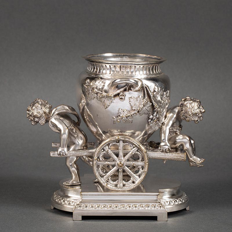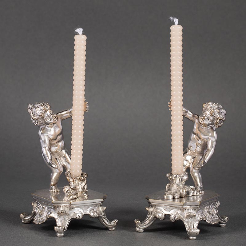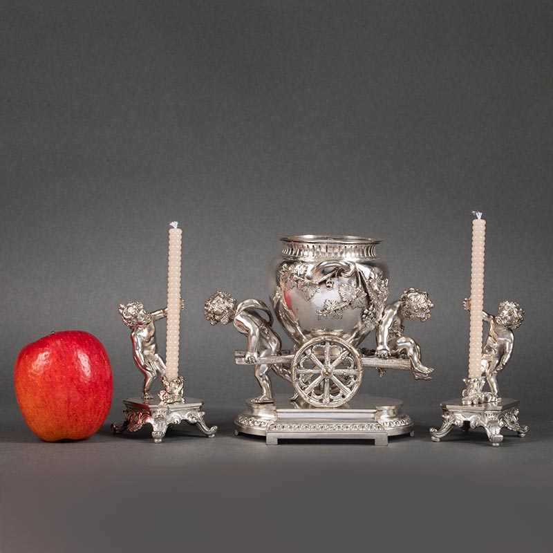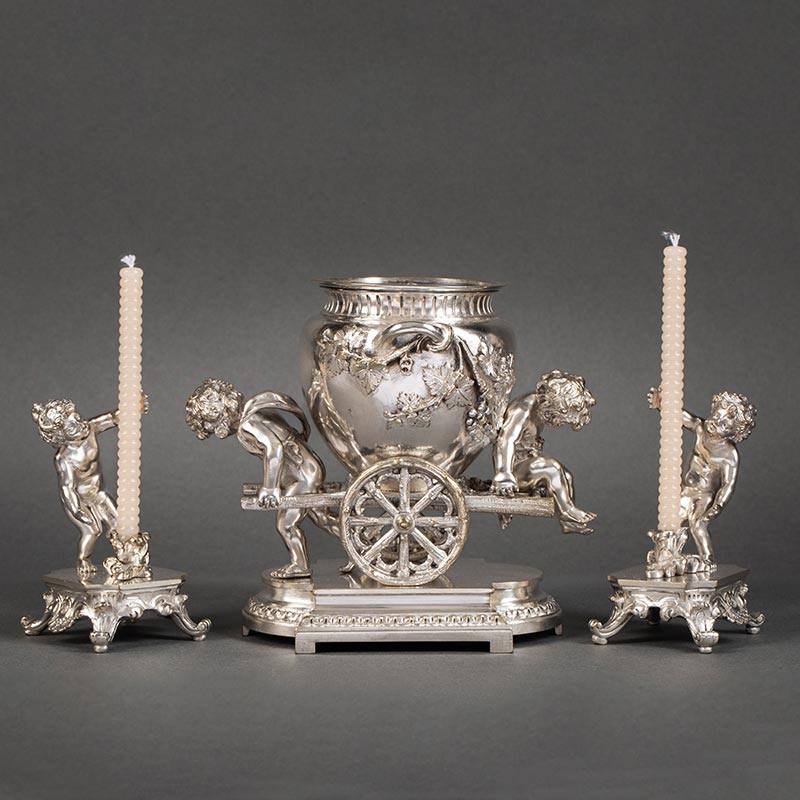 19世纪法国出品洛可可风格小天使葡萄藤叶主题铜镀银精雕烛台花瓶三件套
