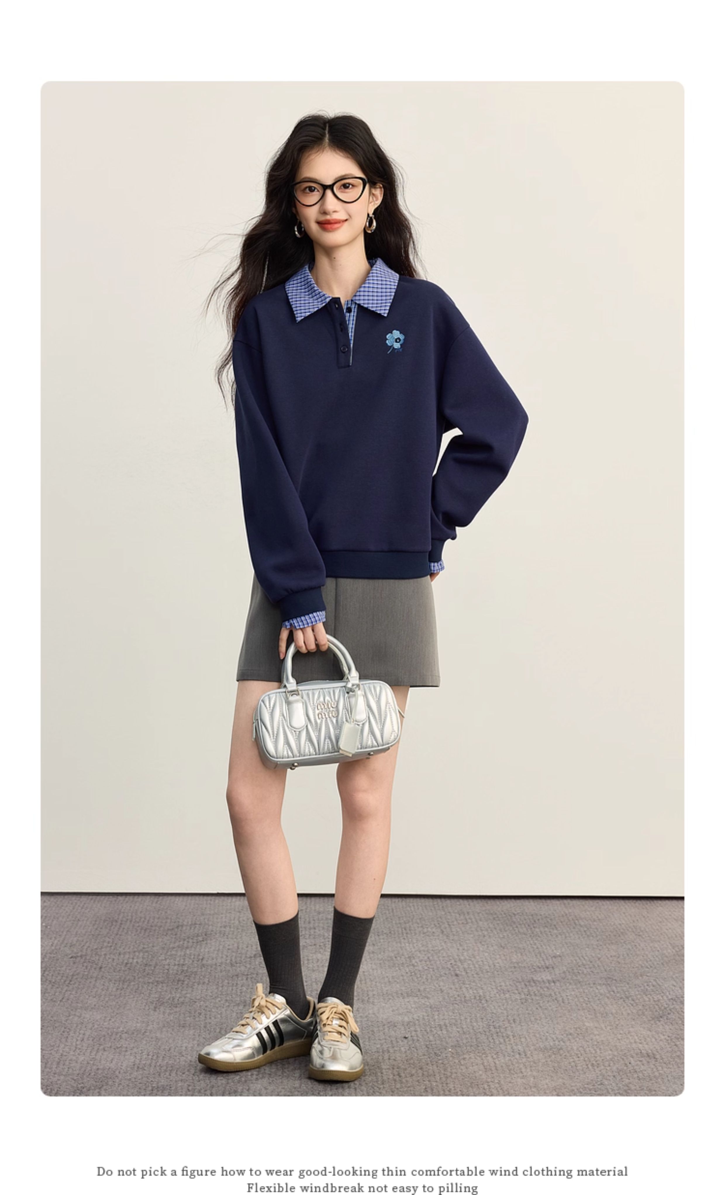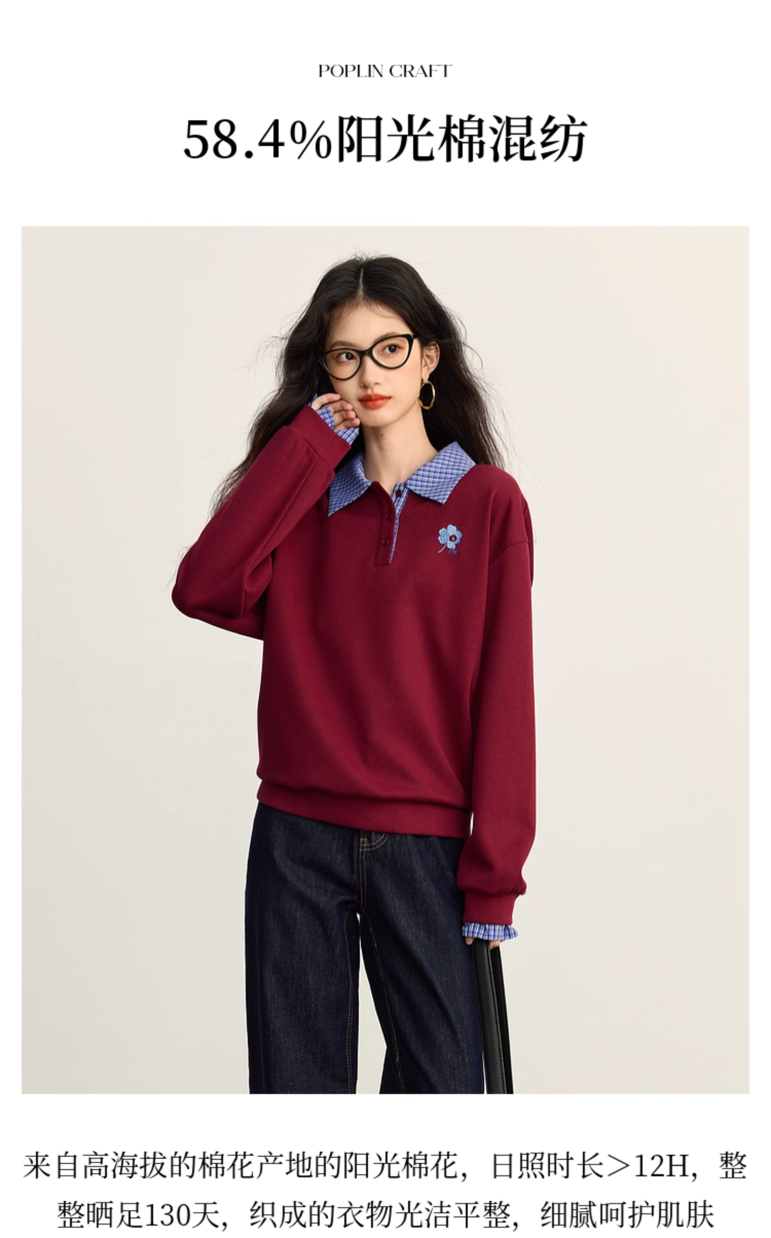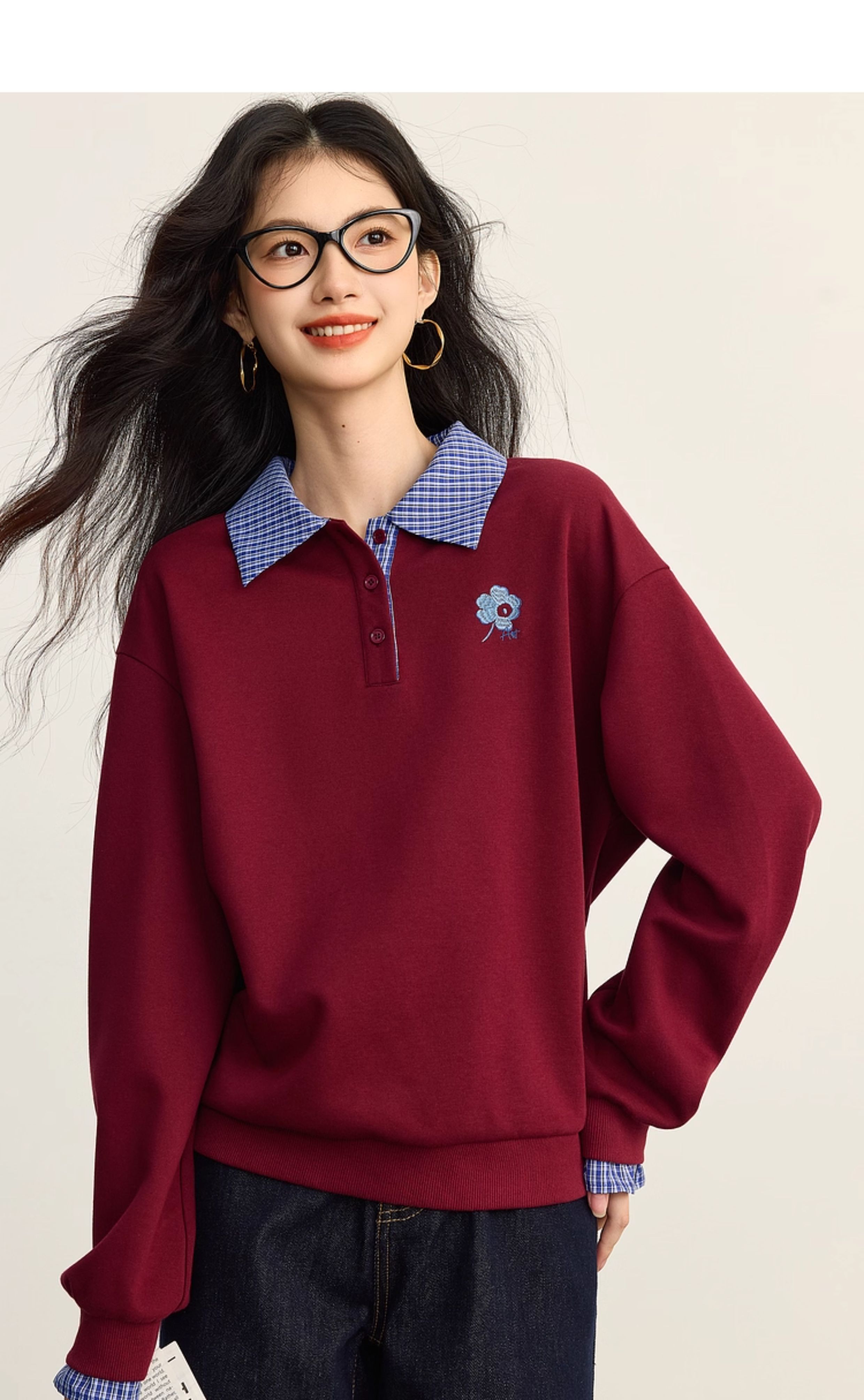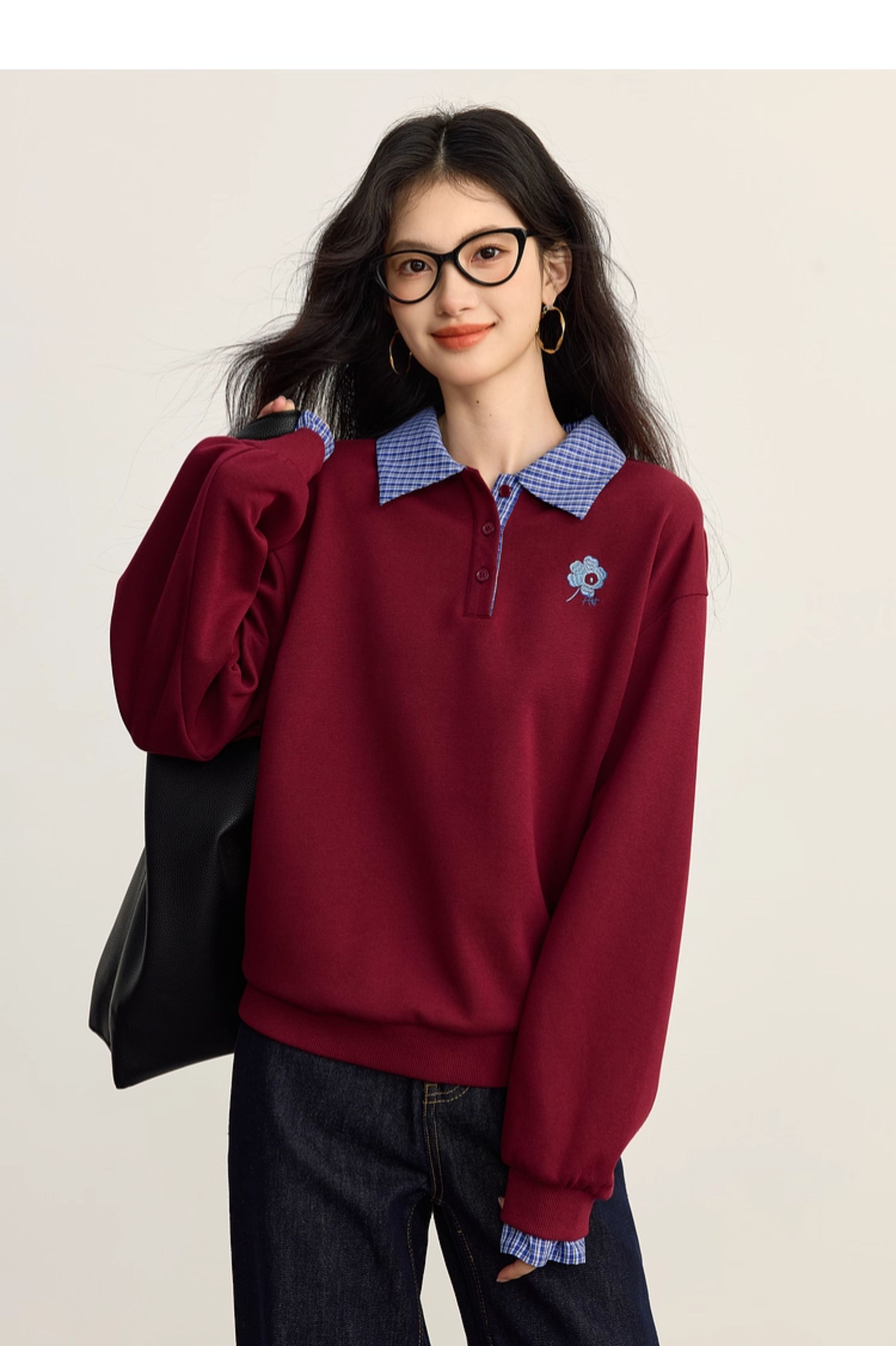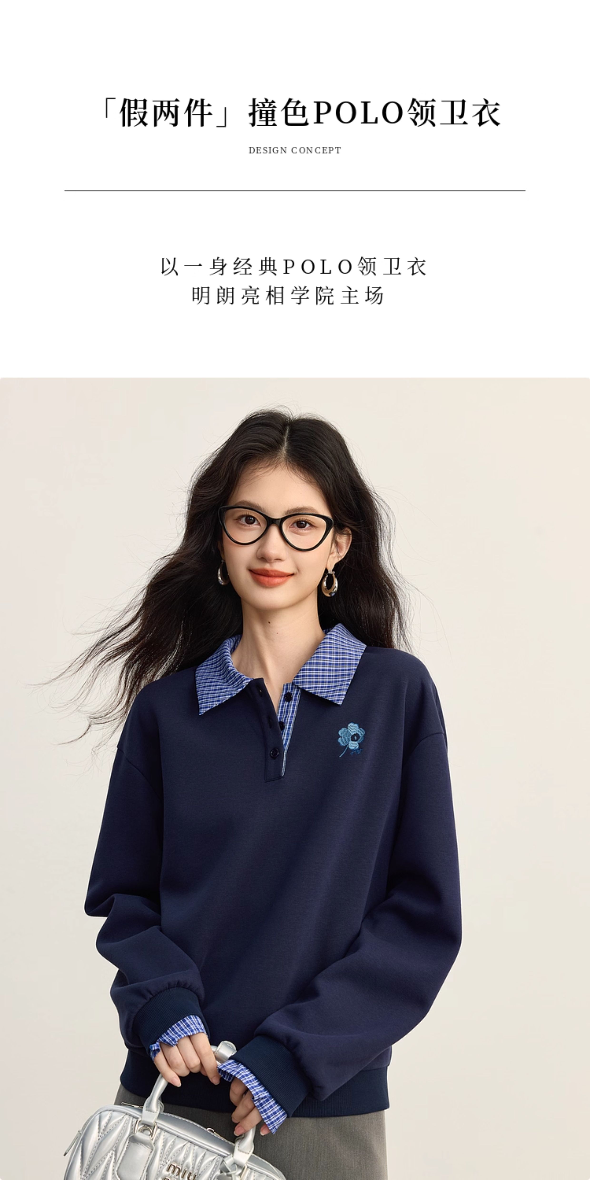 【09/10新品】熙世界学院风撞色格纹拼接POLO领上衣女士假两件卫衣2025秋装新款