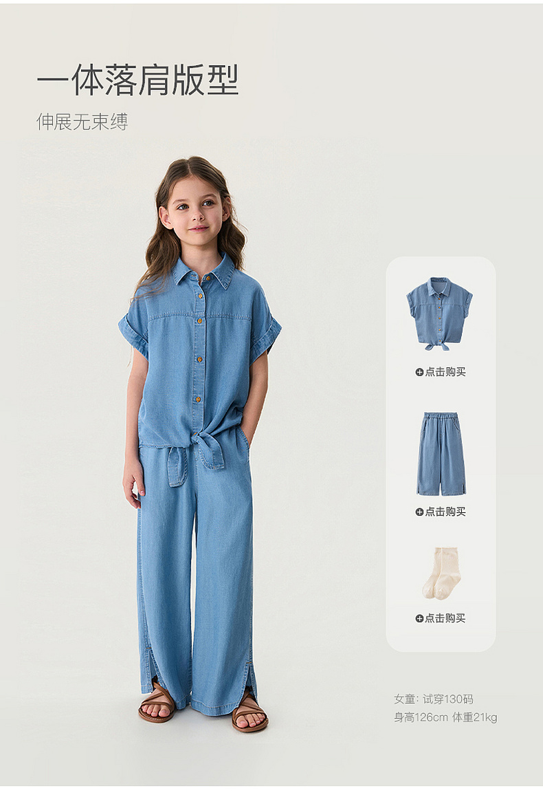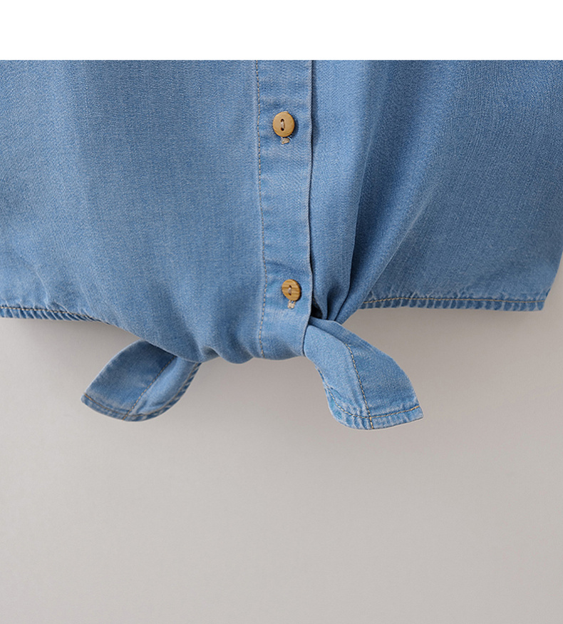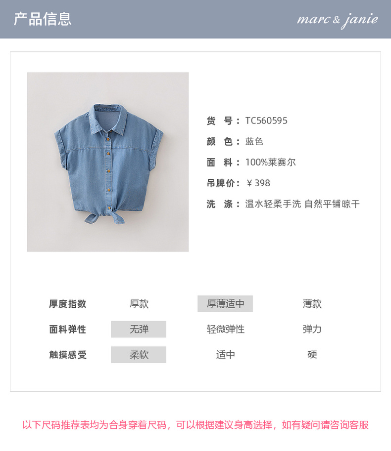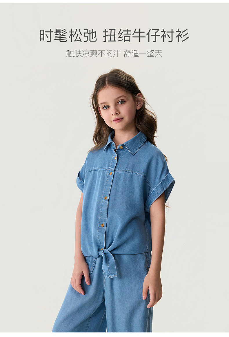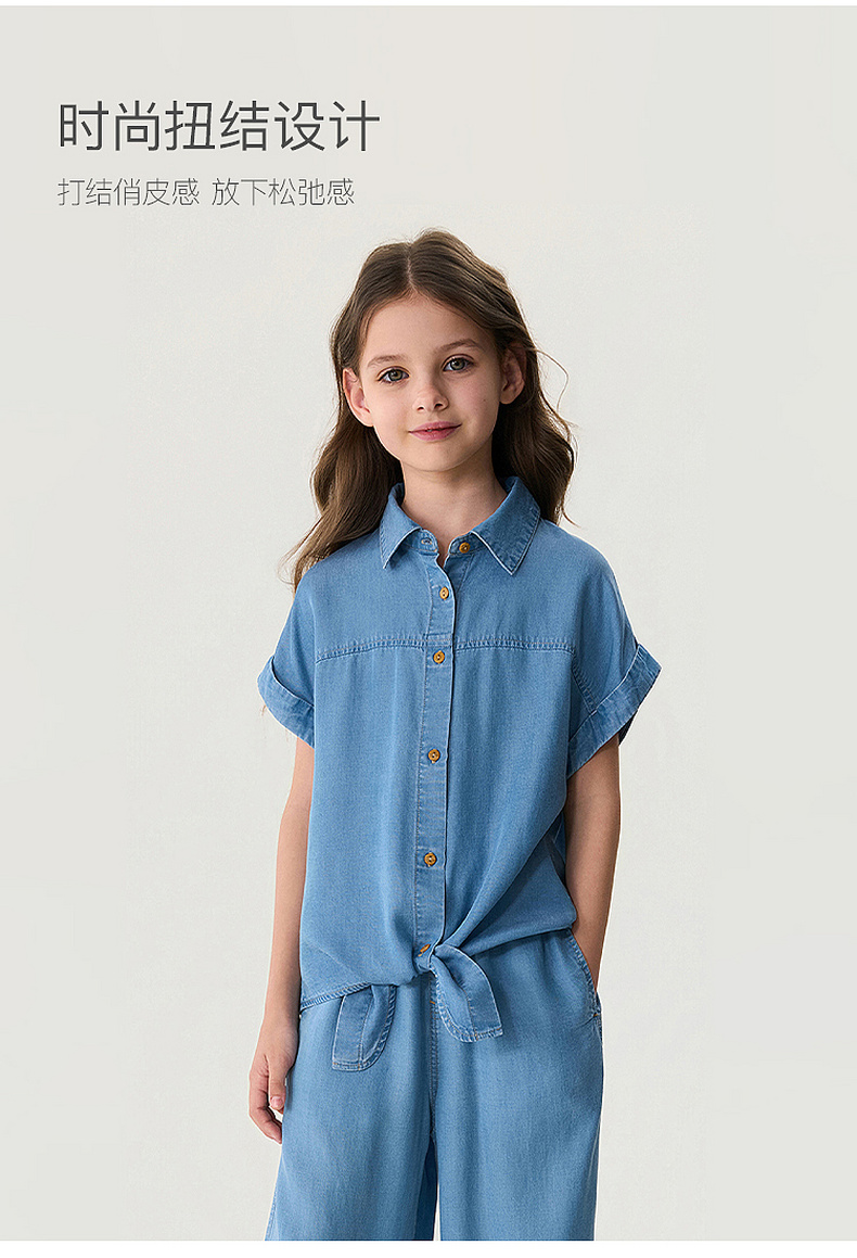 马克珍妮时髦松弛女童扭结牛仔衬衫2026年夏装新款560595