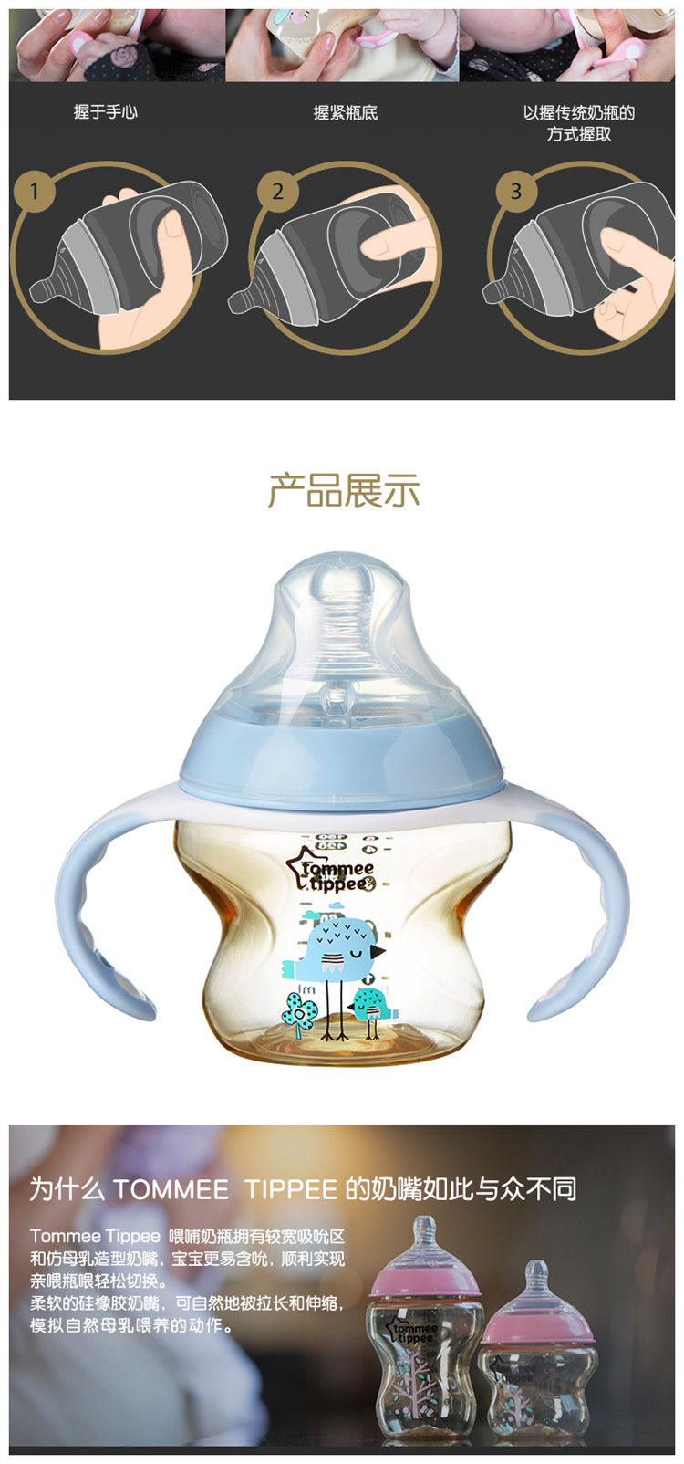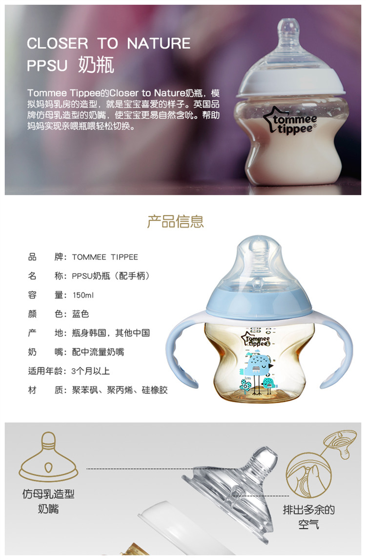 汤美星150毫升PPSU奶瓶蓝色配手柄和中流量奶嘴 3个月以上3瓶JPY带授权招加盟代理