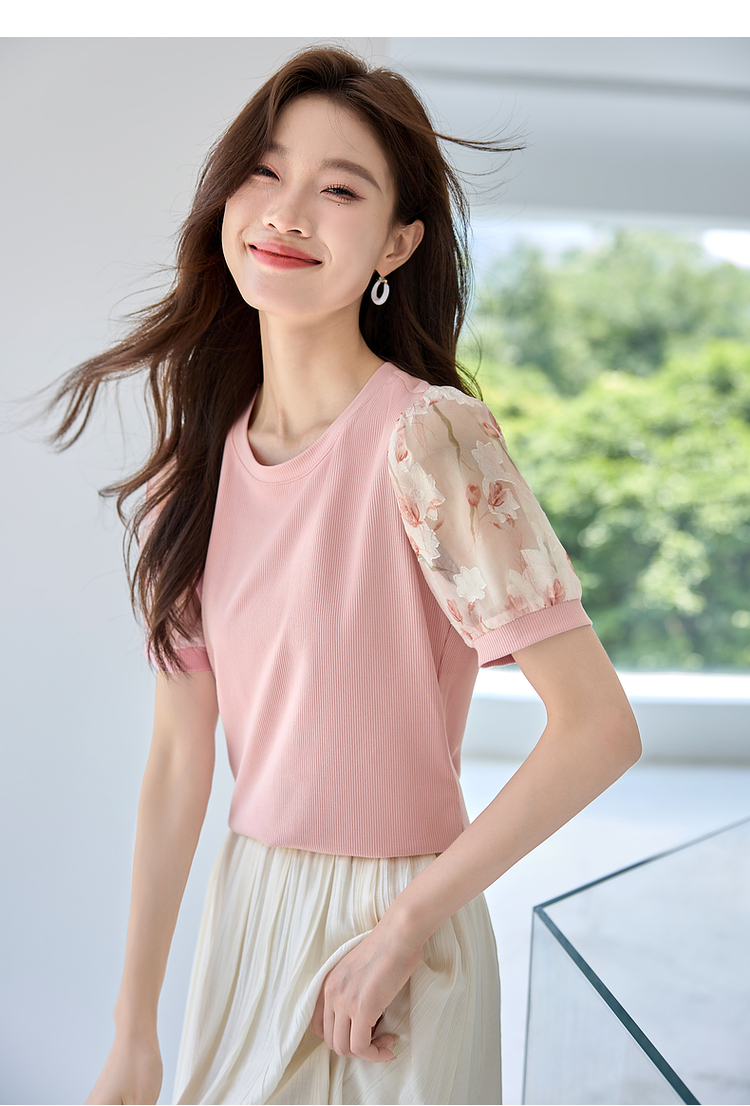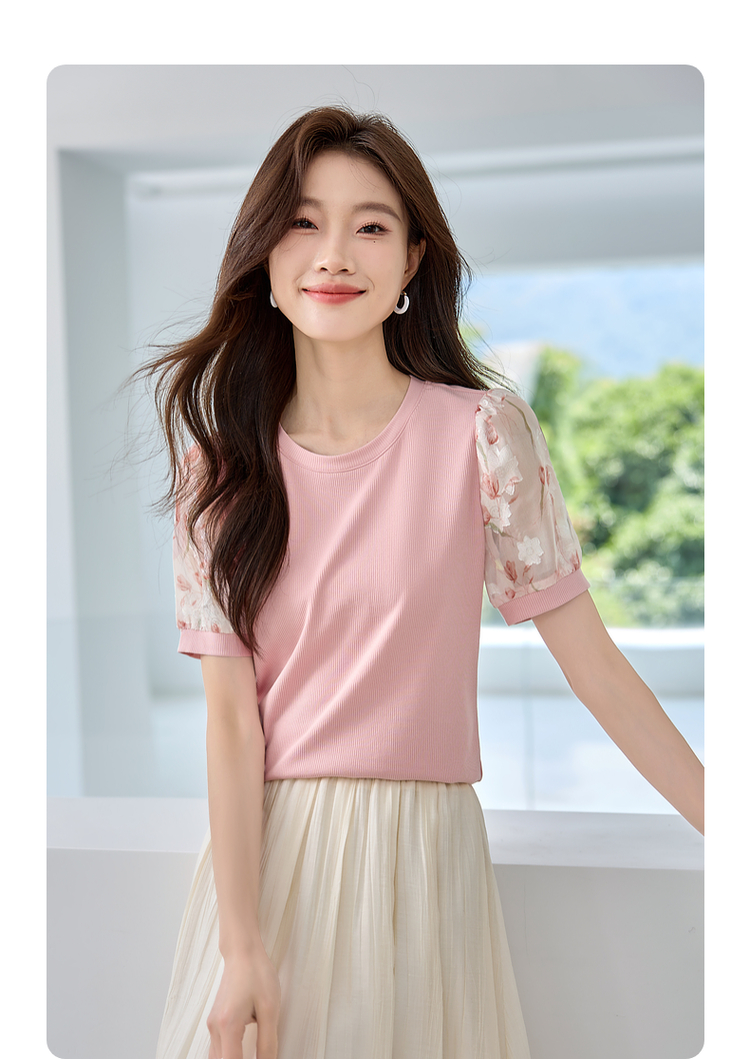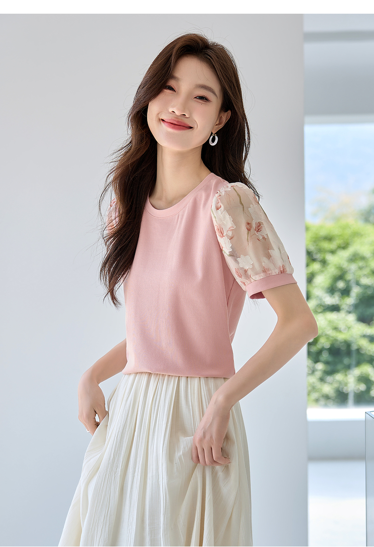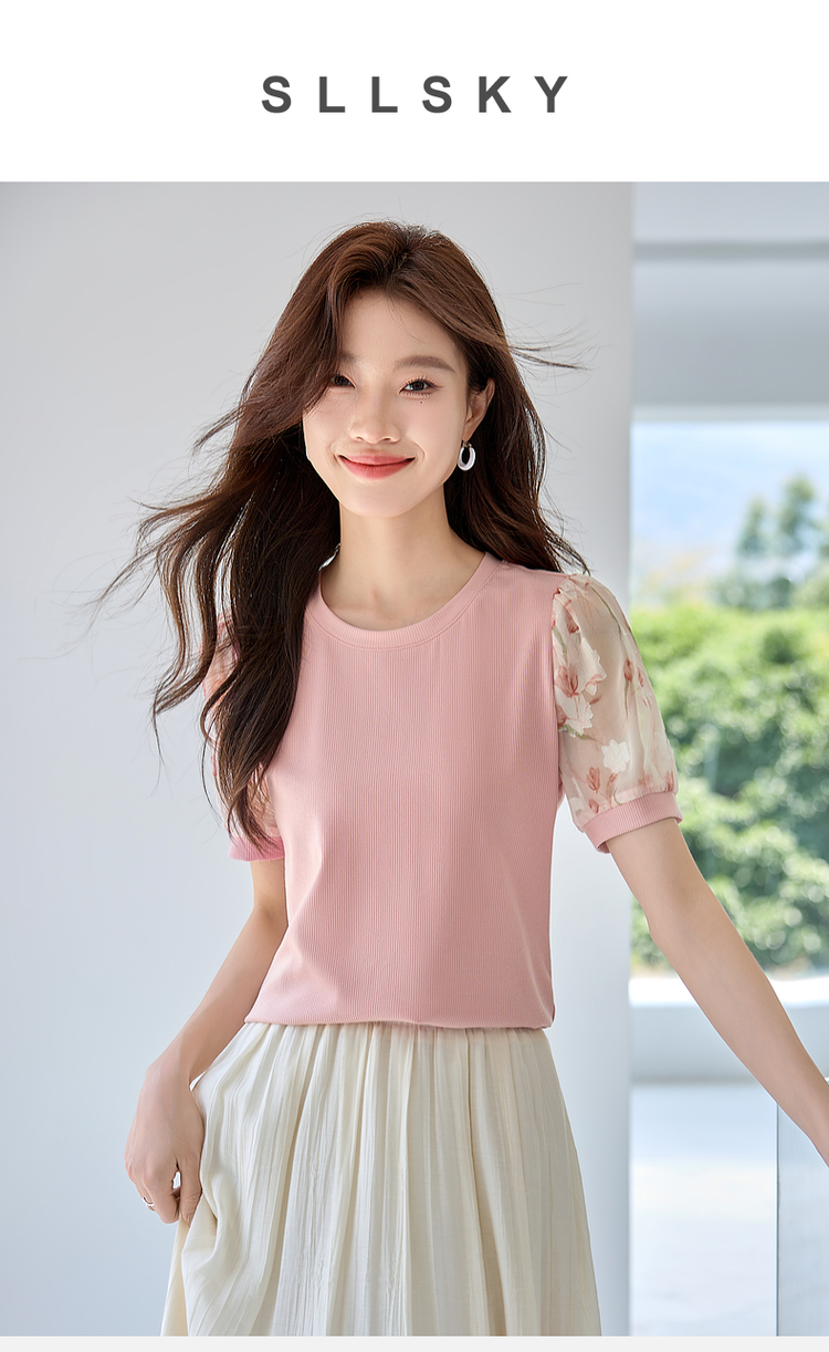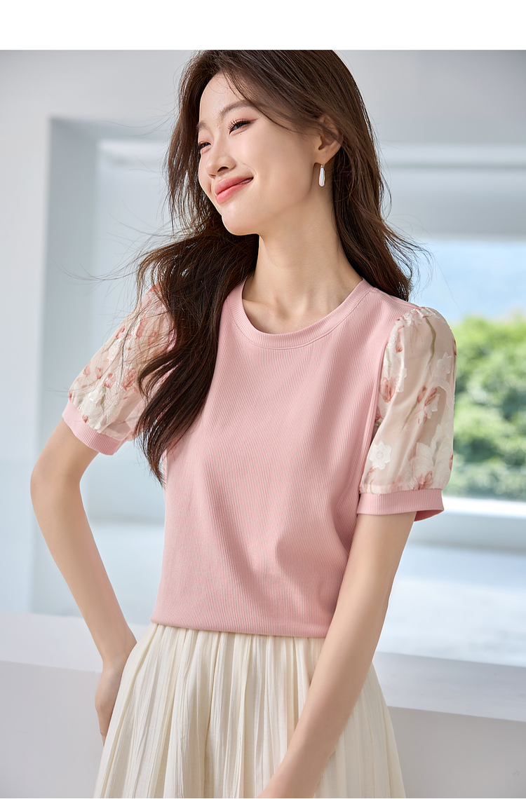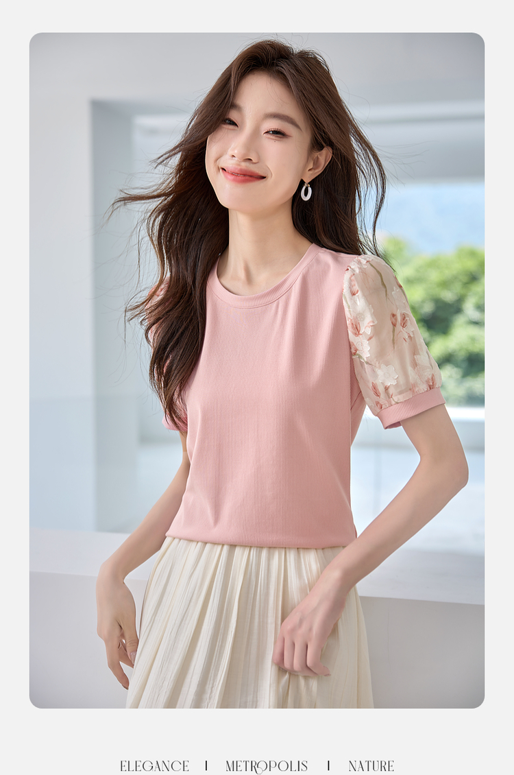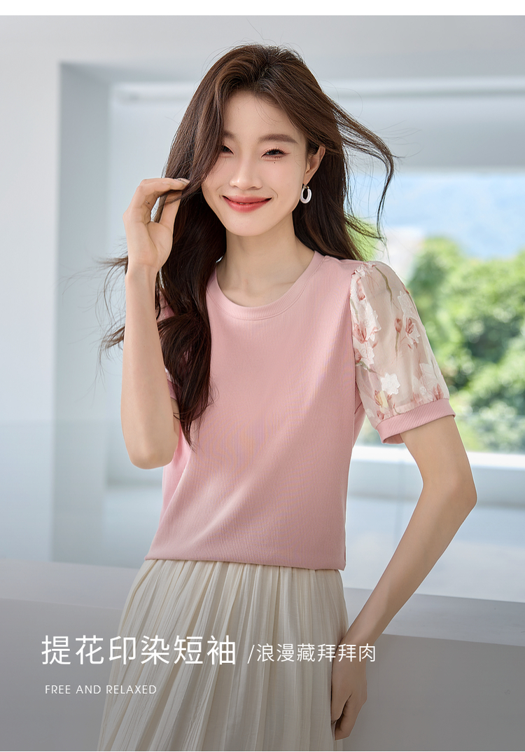 【专属特价】熙世界假两件时尚印花泡泡袖拼接圆领针织T恤上衣2025夏季新款
