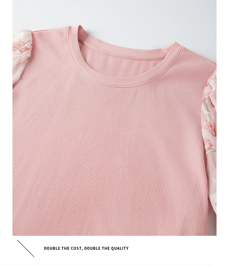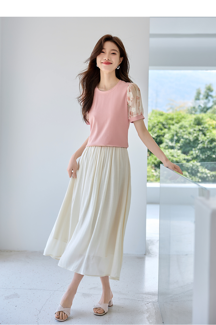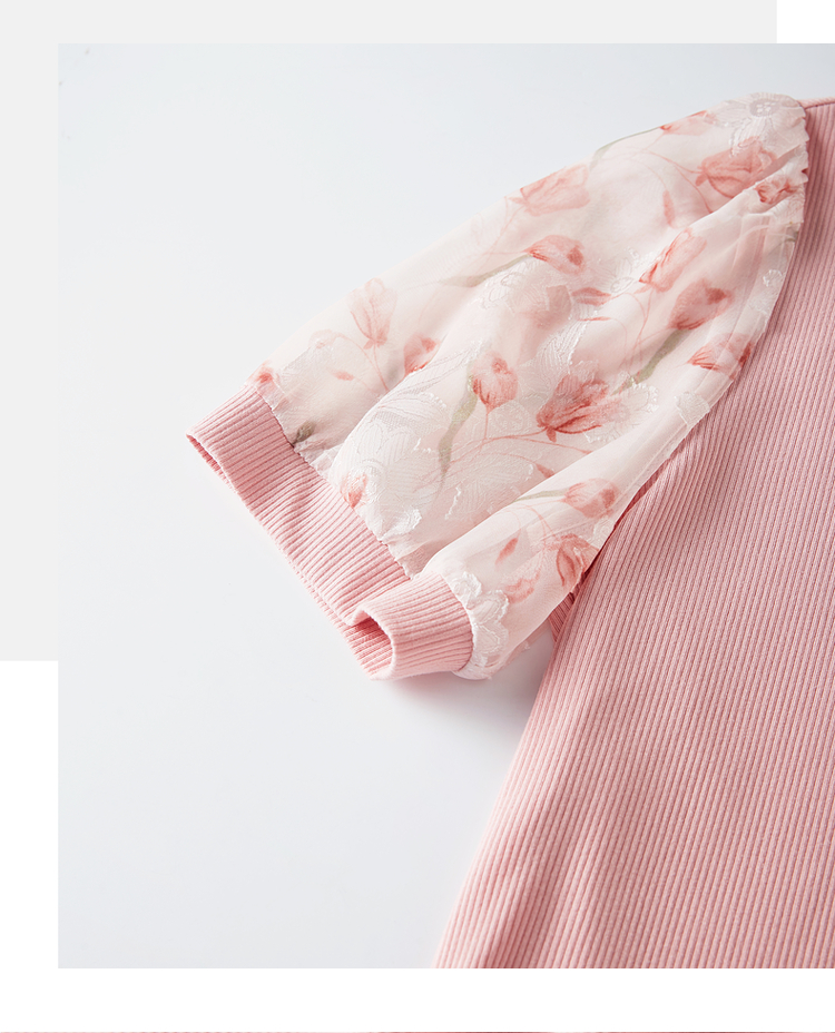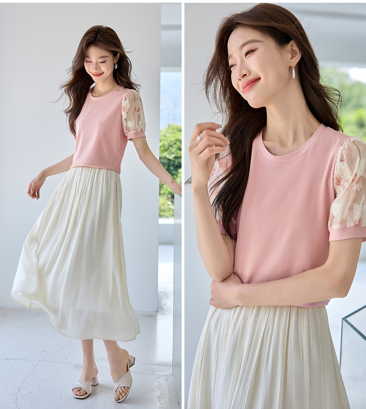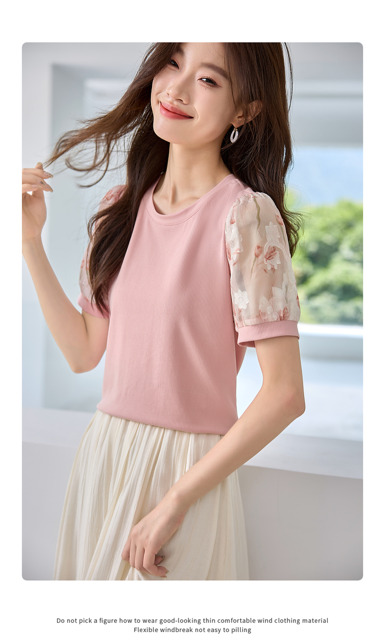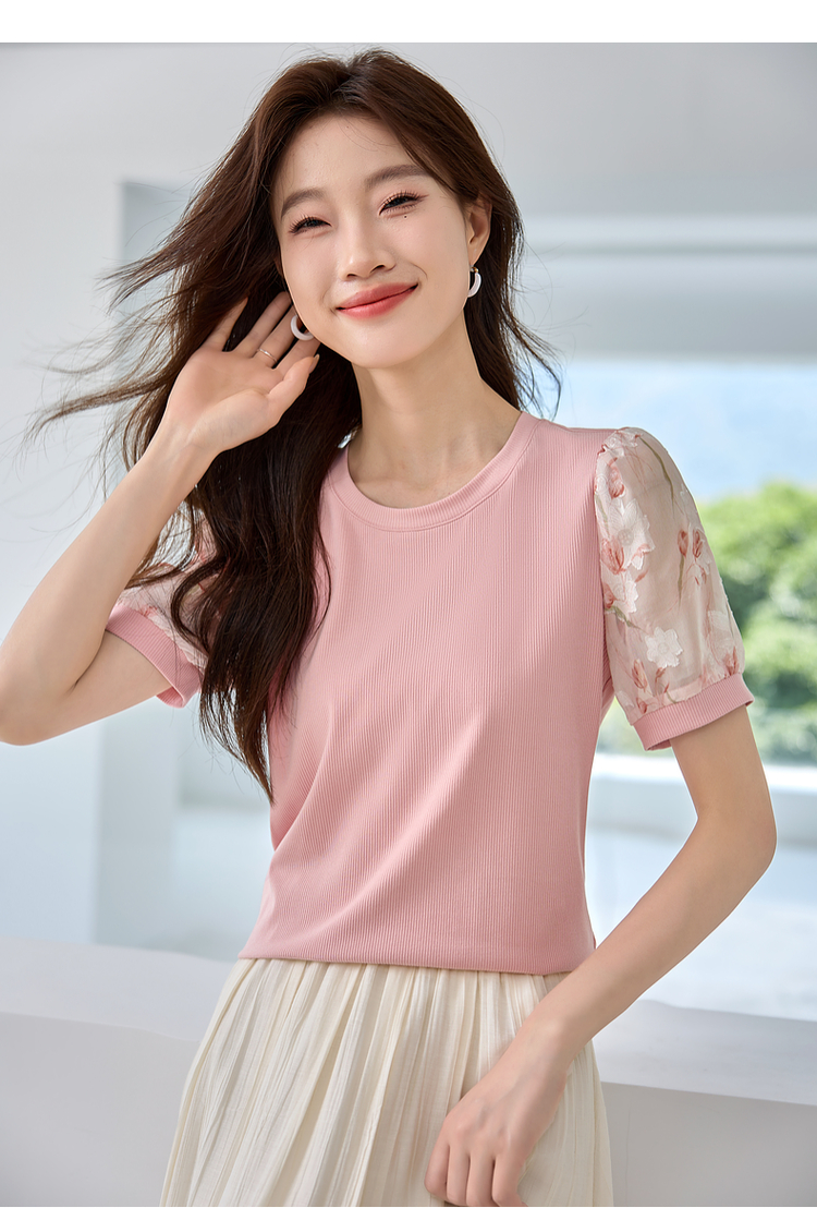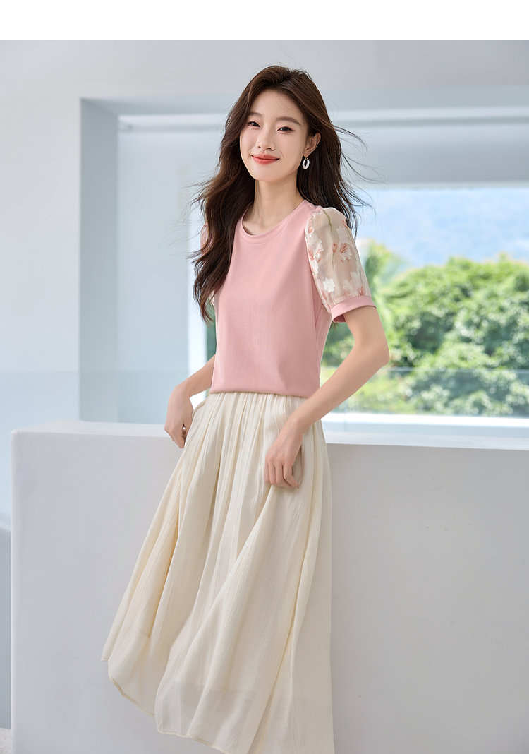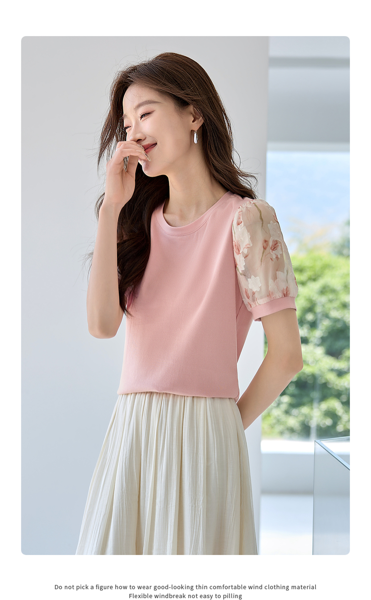 【专属特价】熙世界假两件时尚印花泡泡袖拼接圆领针织T恤上衣2025夏季新款