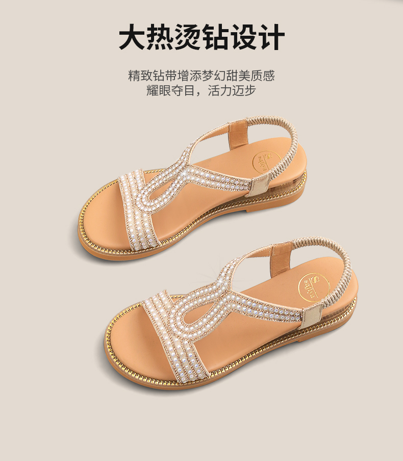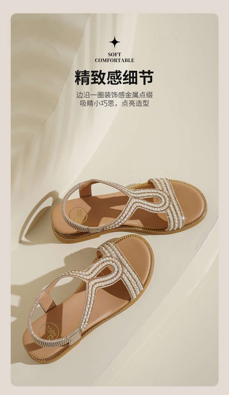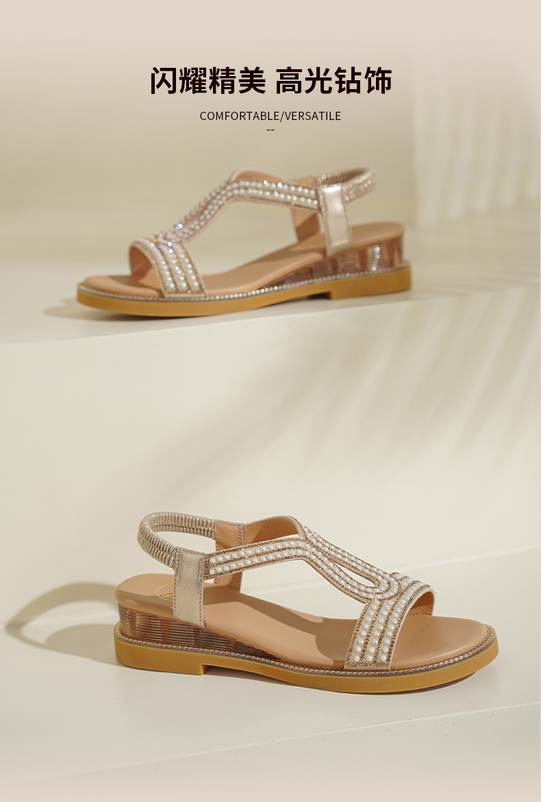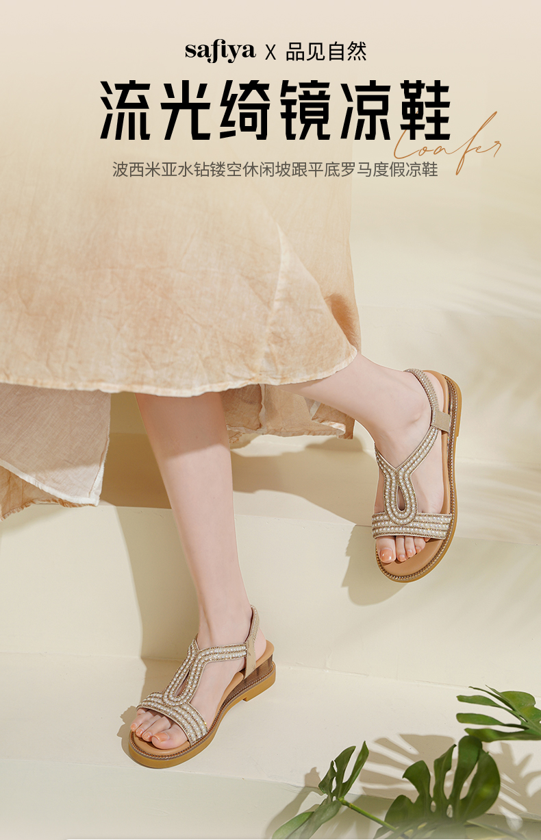 Safiya/索菲娅2025波西米亚闪钻珍珠露趾休闲坡跟罗马仙女鞋SFD2115349