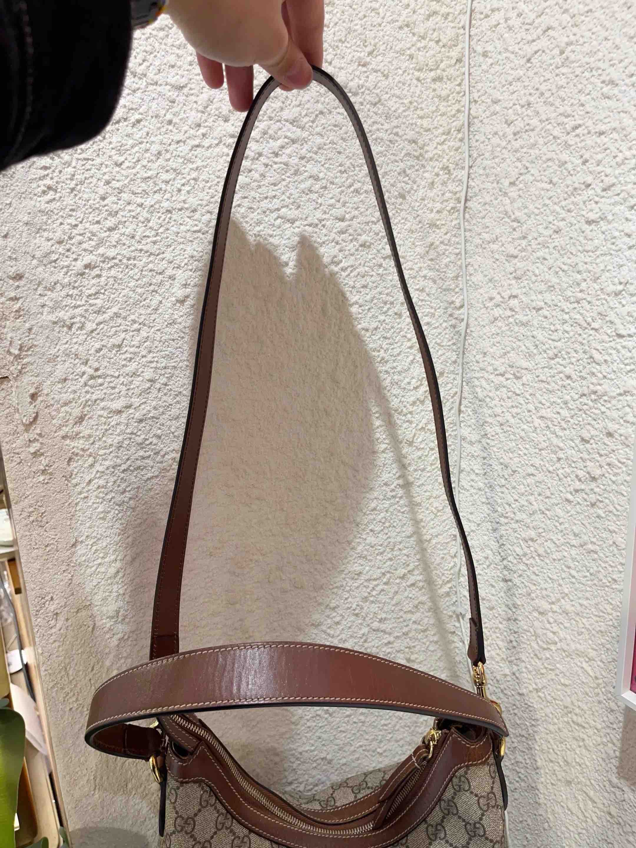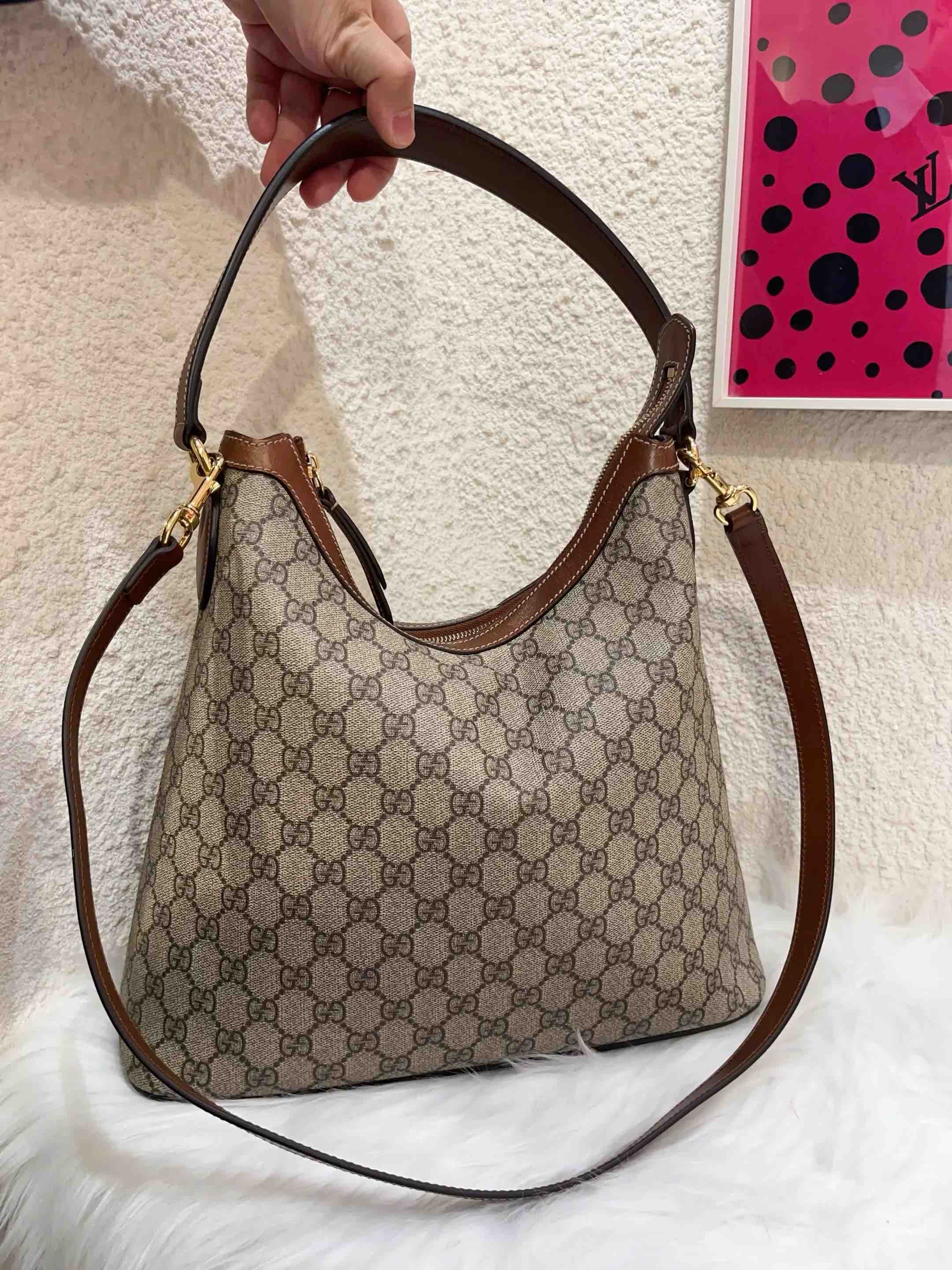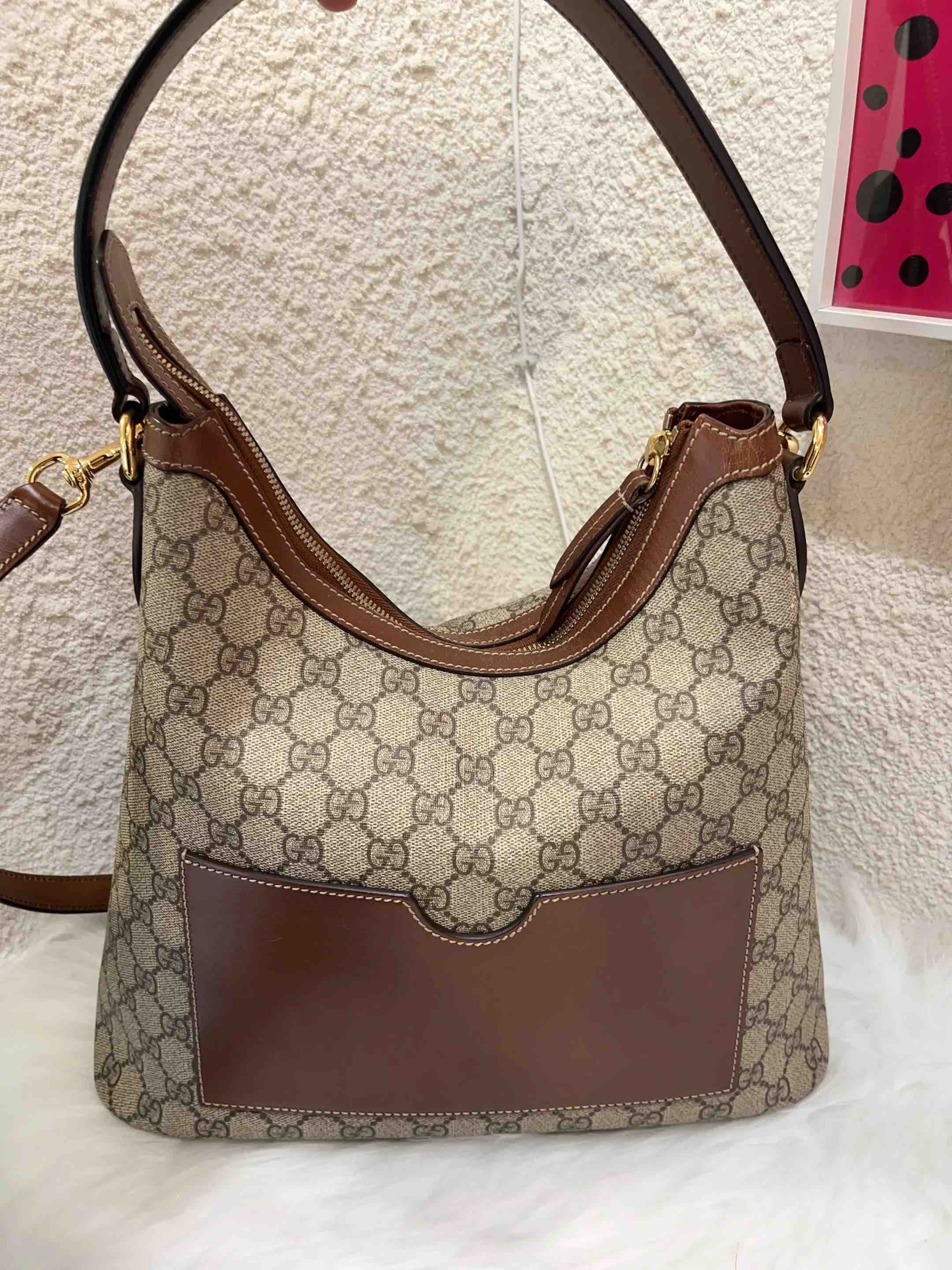 【商品详情】正品二手 Gucci Hobo 老花拼皮 棕色 中号 单肩包🍎95新 33×25 配件:肩带。包口配皮正常使用感。复古百搭 容量充足