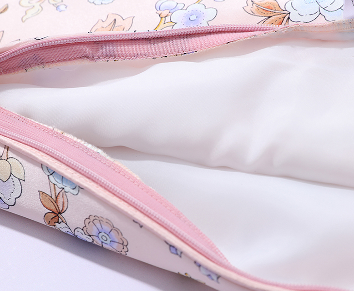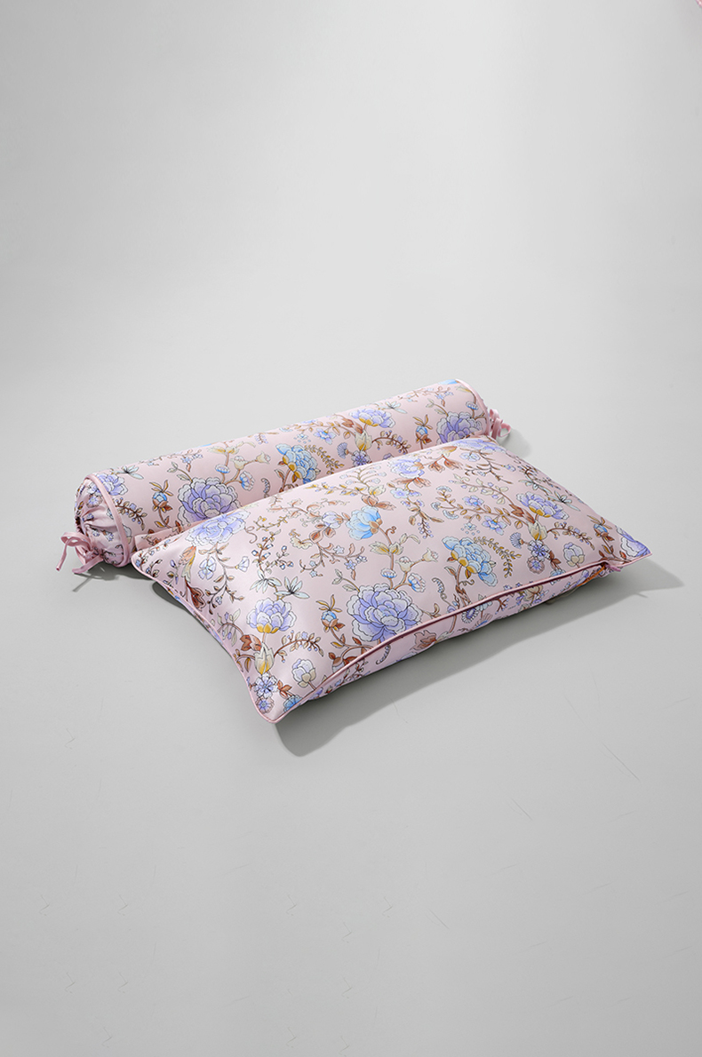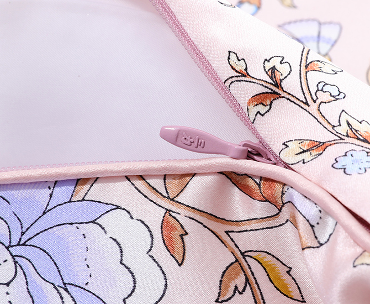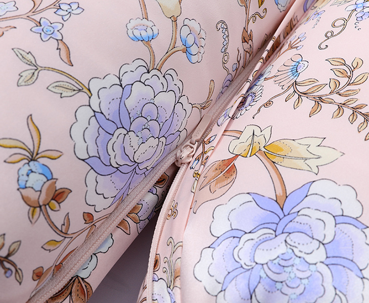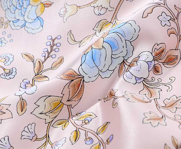 采用柔滑轻盈的桑蚕丝面料,搭配繁花似锦印花,整体布局均衡大气,寓意美好。