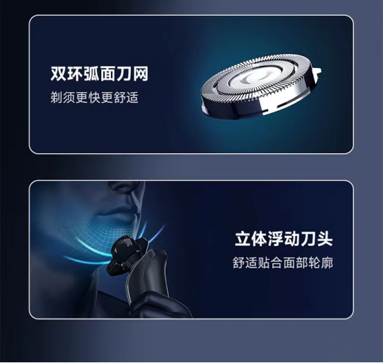 刀网刀片均为双环弧面刀网,增加刀网与面部接触面积, 不怕刮久了刀片生锈变钝。3W大功率,动力强进, 剃须快、准、狠,无惧粗硬胡茬!