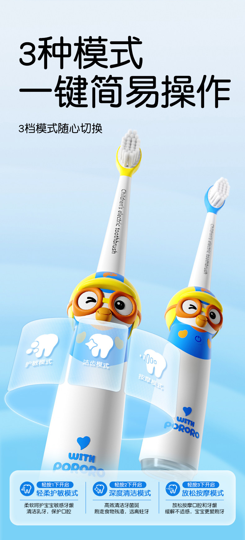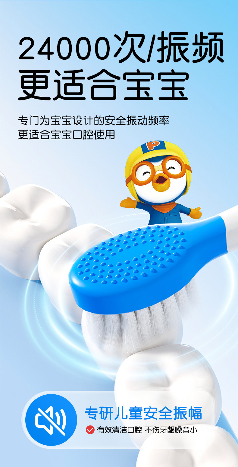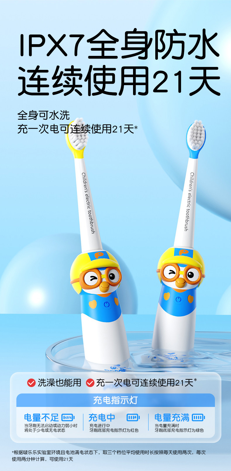 新款!【适合3-12岁儿童充1次电可连用21天】韩国啵乐乐PORORO儿童电动牙刷卡通形象可充电长待机防水替换刷头