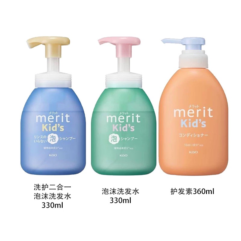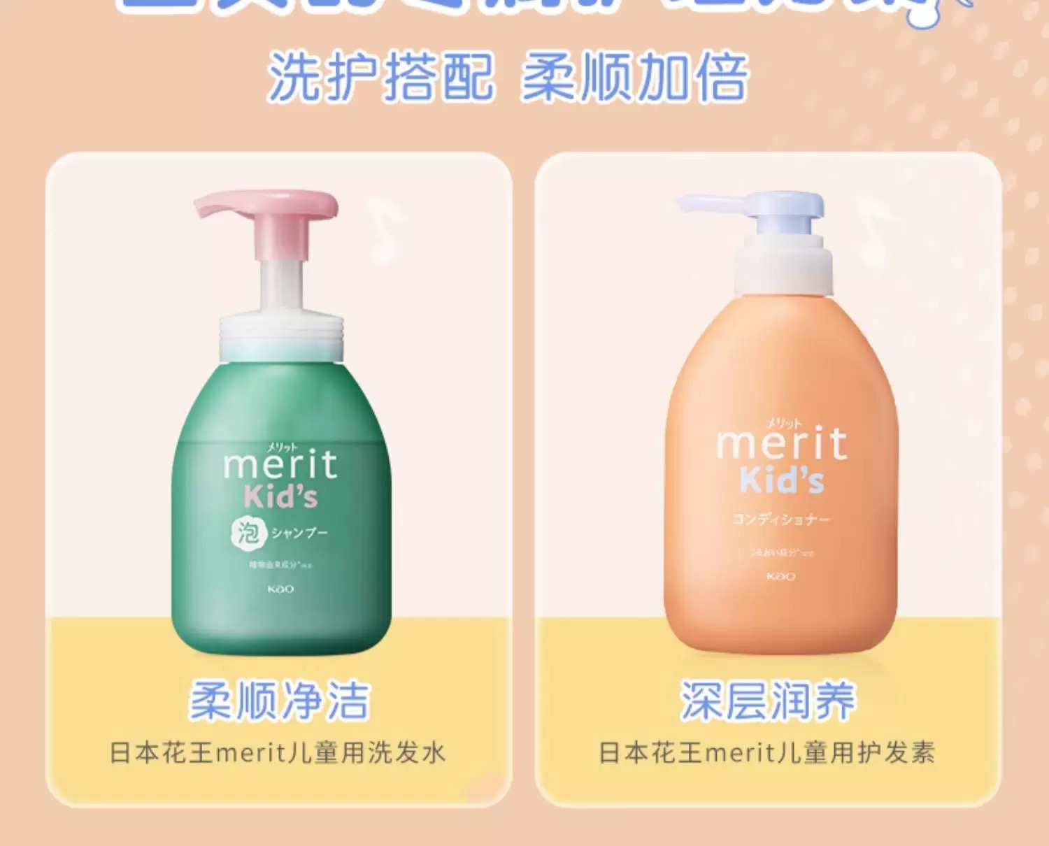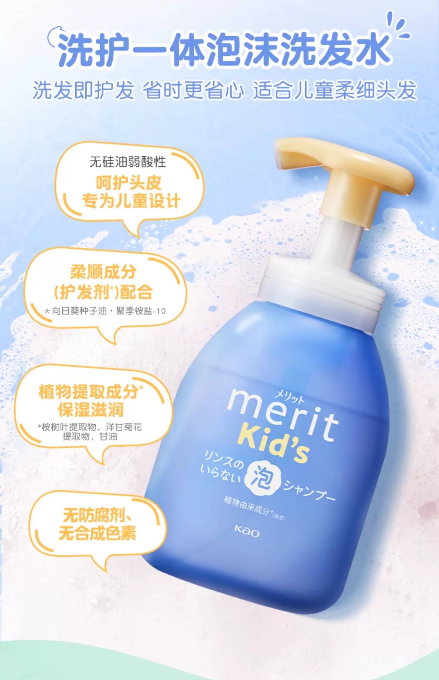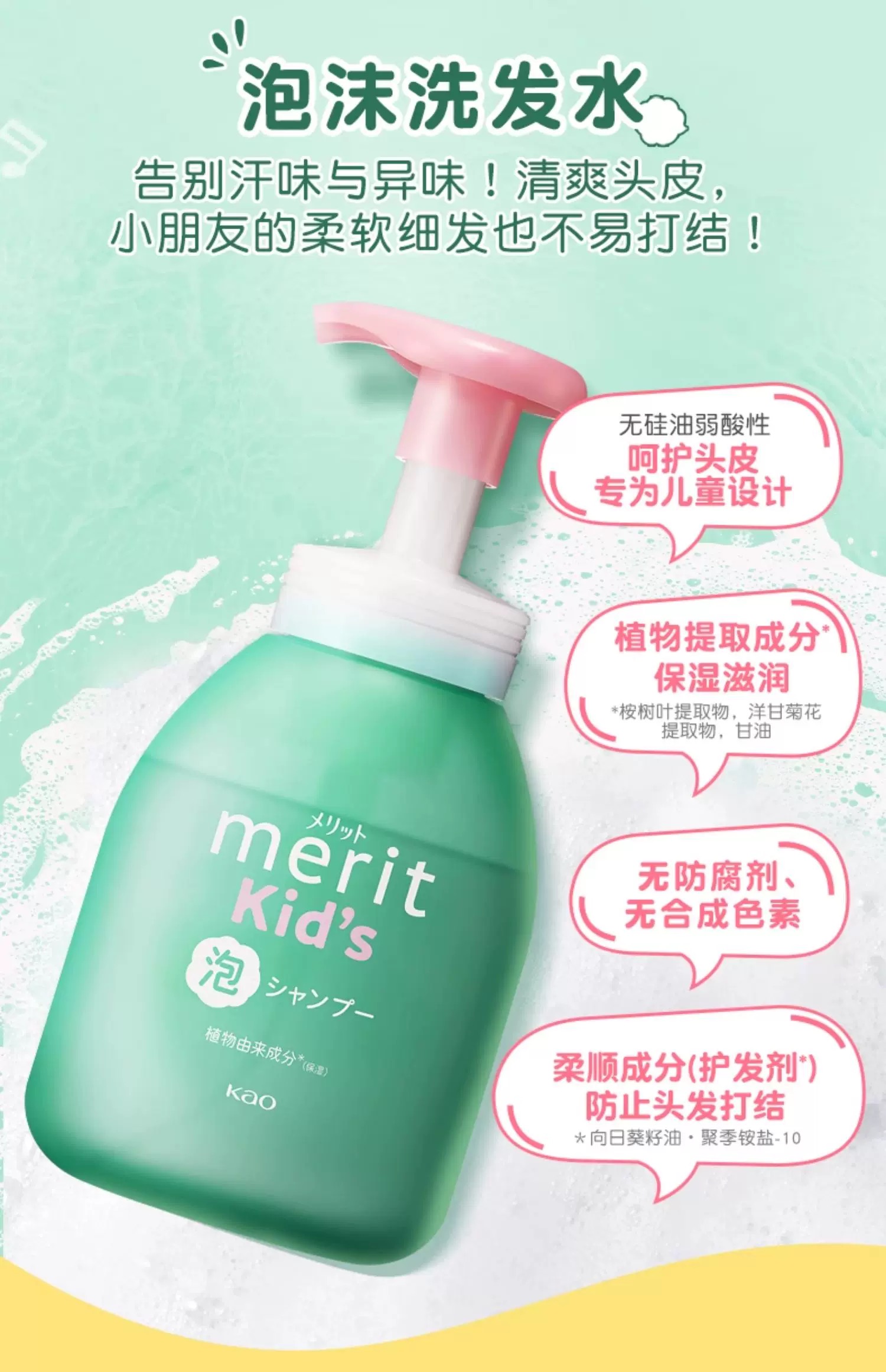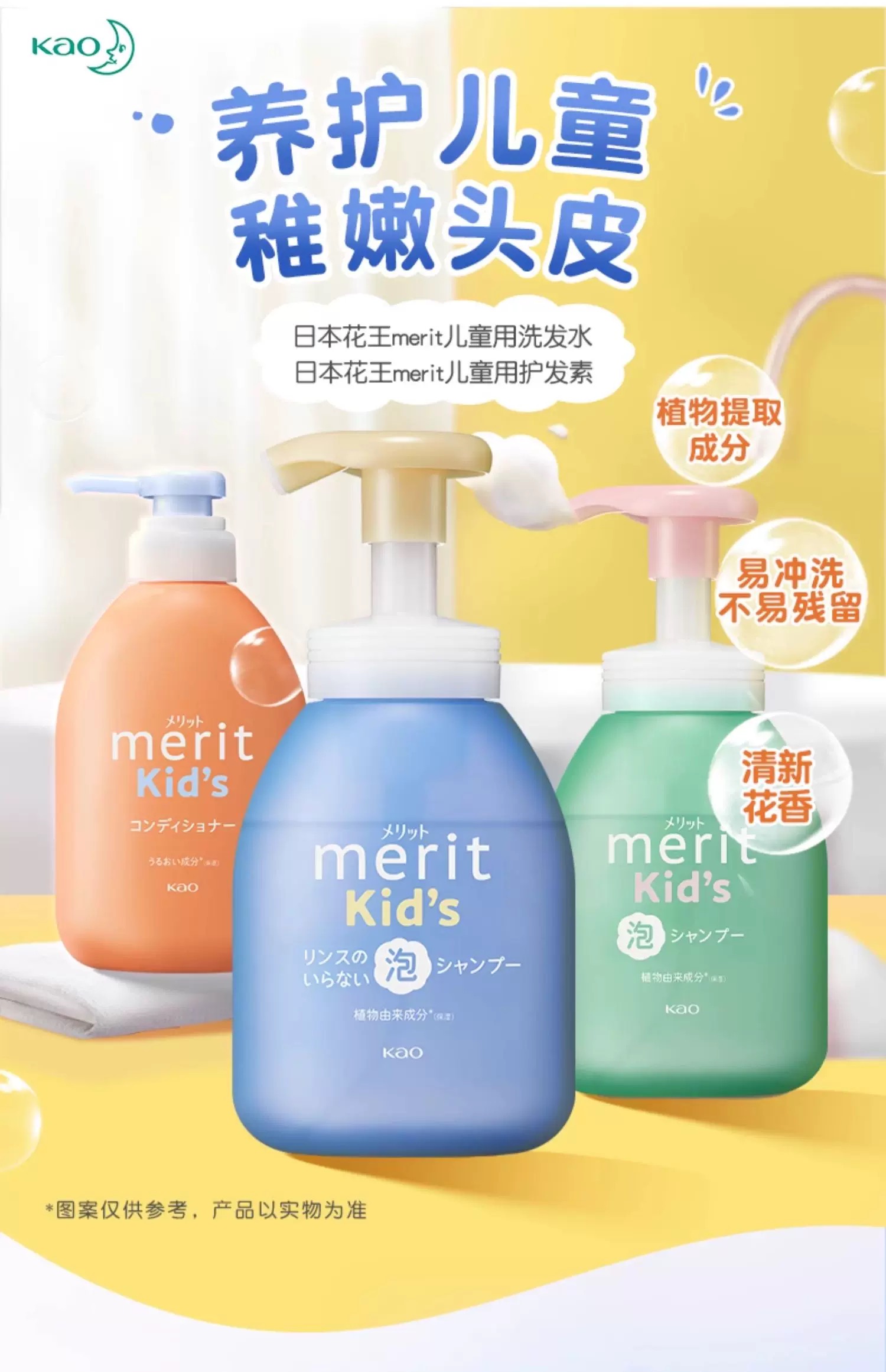 日本KAO花王Merit儿童泡沫洗发水护发素新款 婴幼儿宝宝弱酸性无硅油柔顺女孩男孩成人