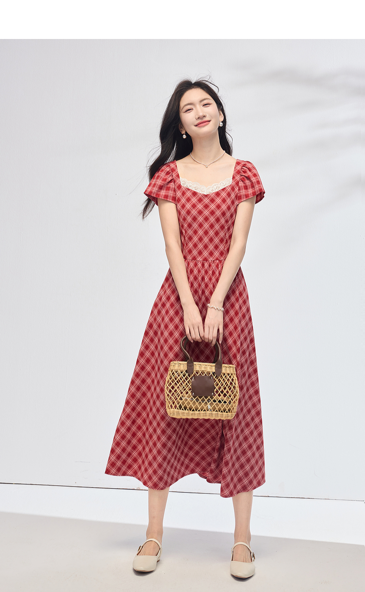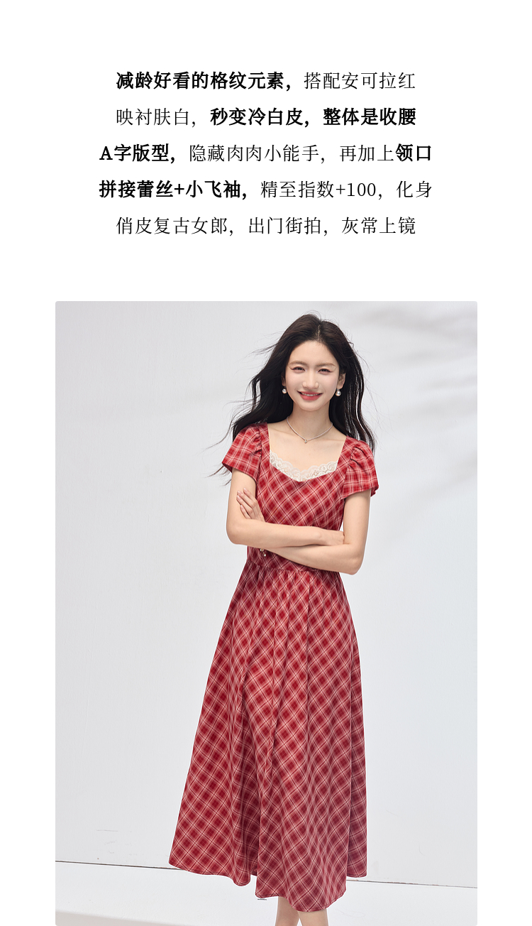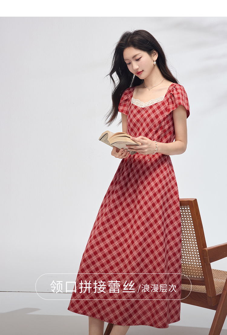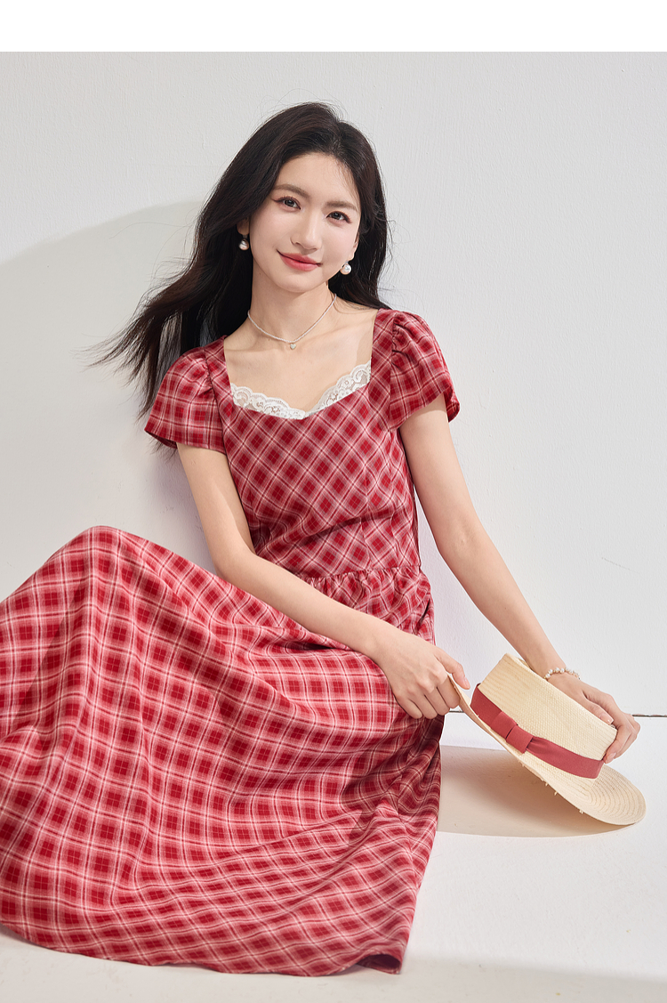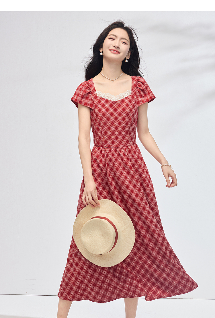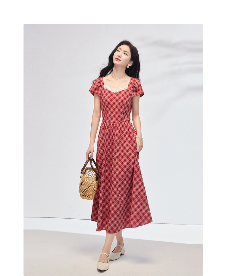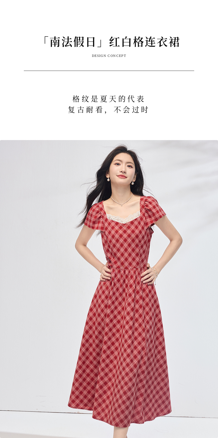 【专属特价】熙世界红色格子连衣裙女高级感夏新款法式收腰蕾丝方领飞飞袖裙子