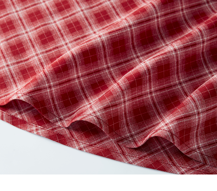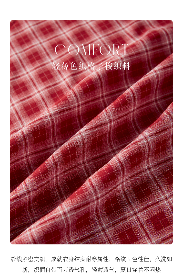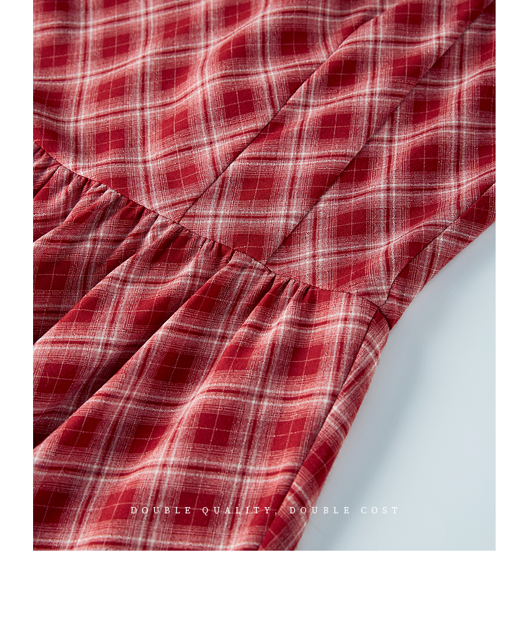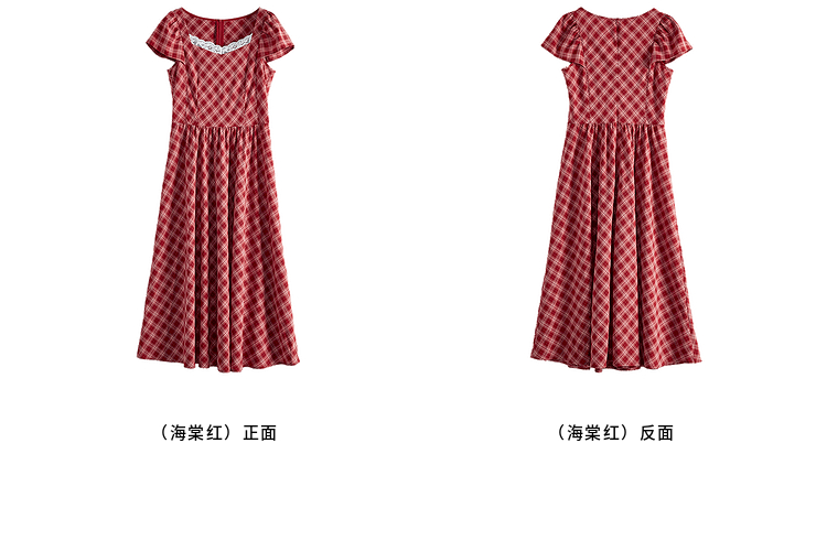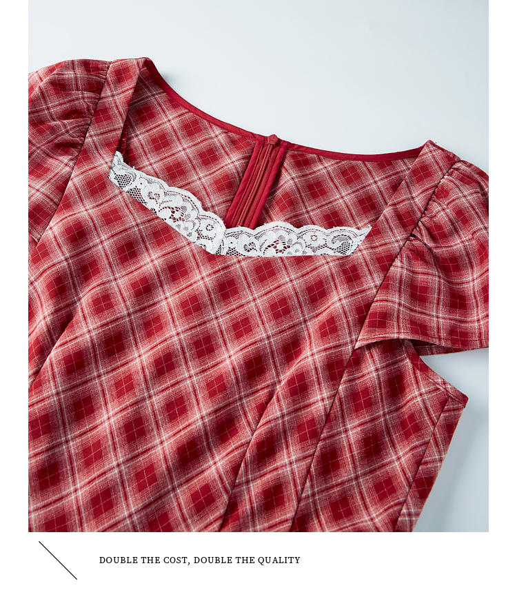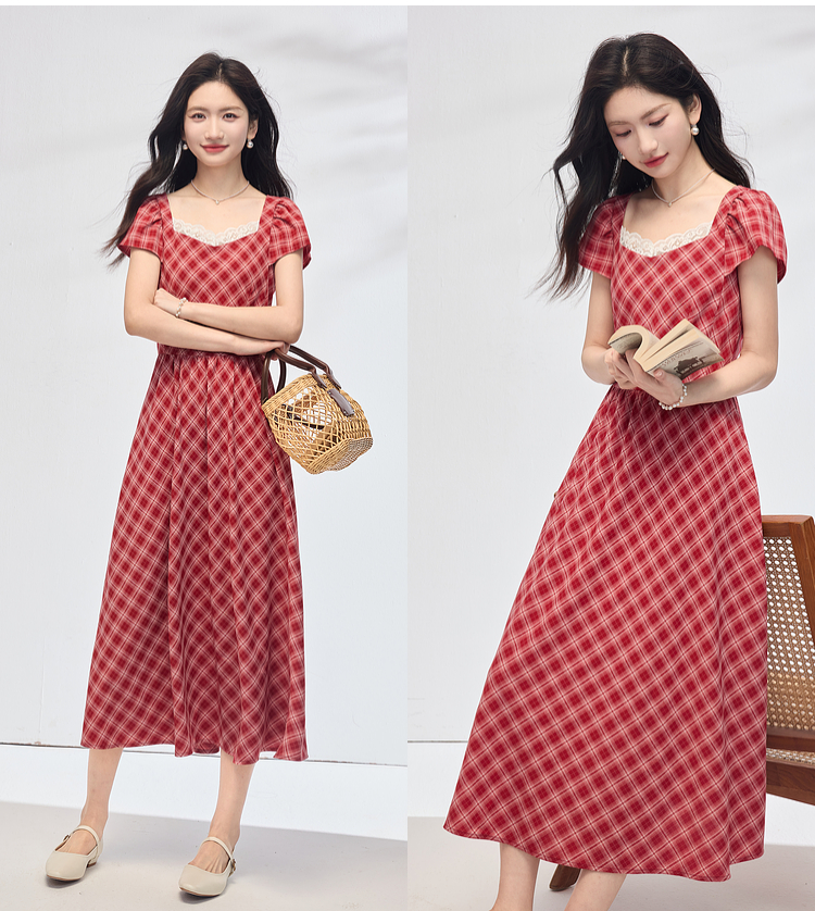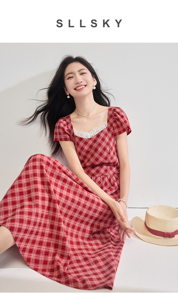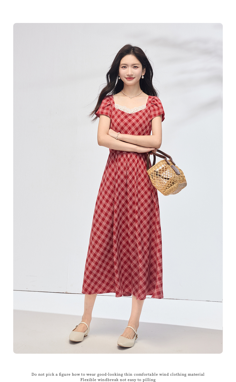 【专属特价】熙世界红色格子连衣裙女高级感夏新款法式收腰蕾丝方领飞飞袖裙子