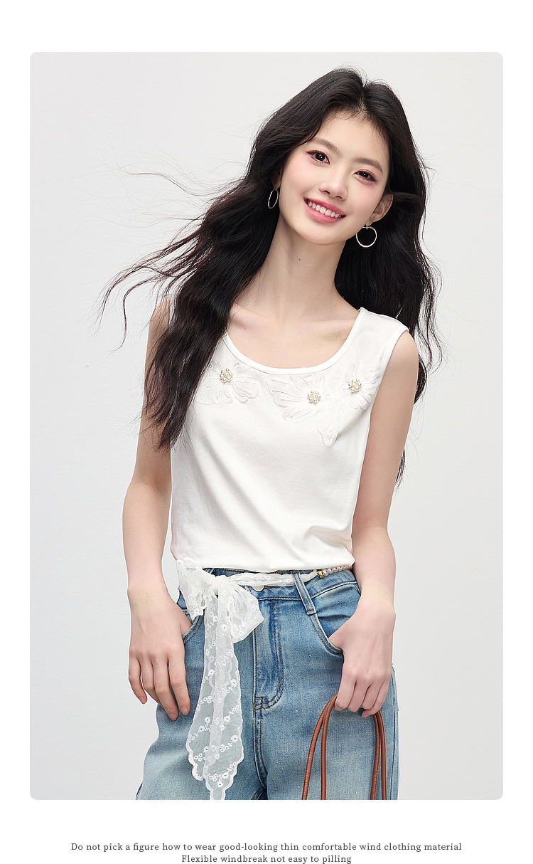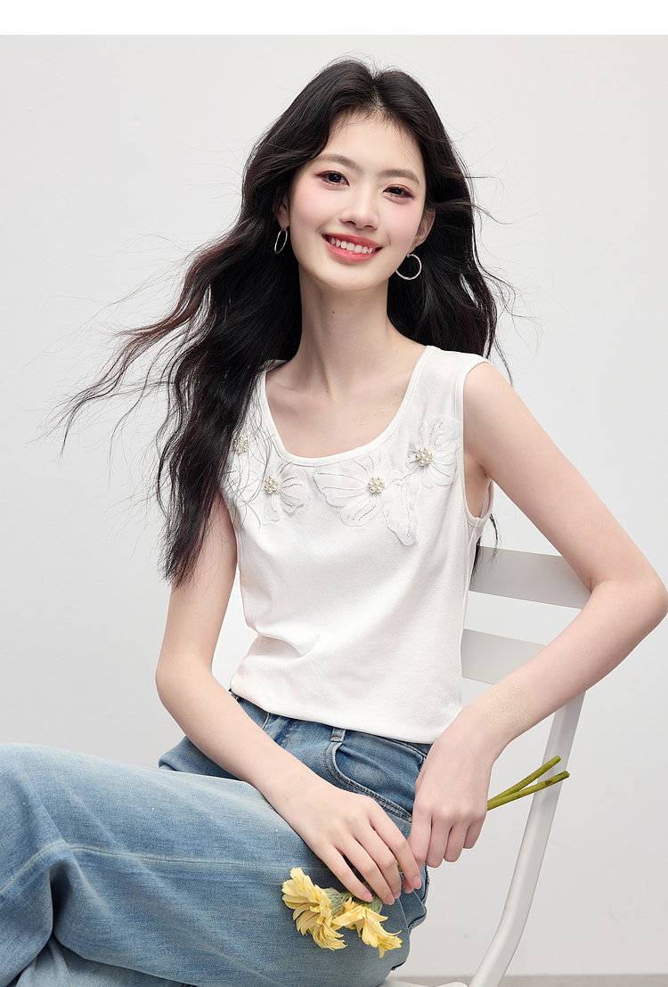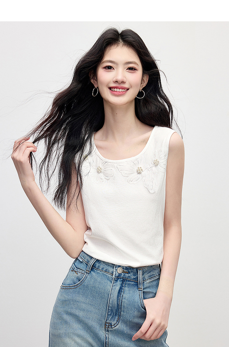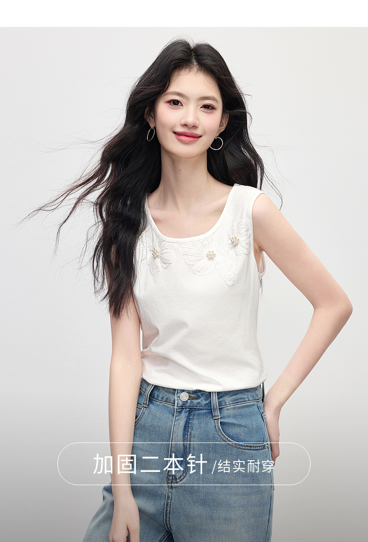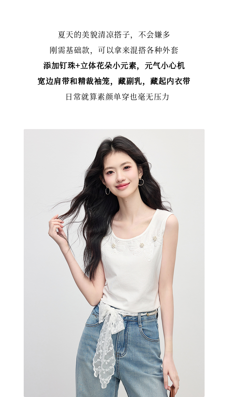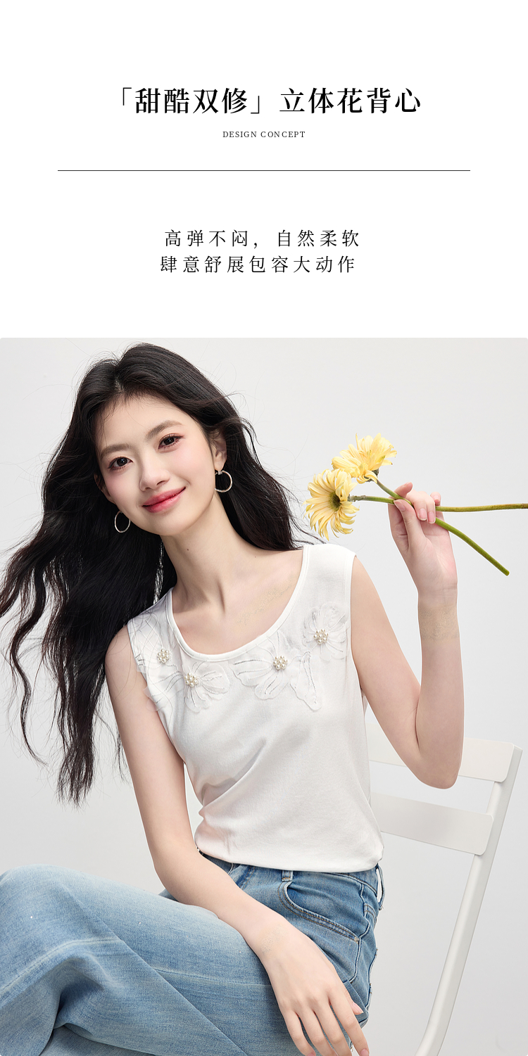 【专属特价】熙世界白色钉珠立体花朵无袖背心外穿绝美短款上衣女2025夏季新款