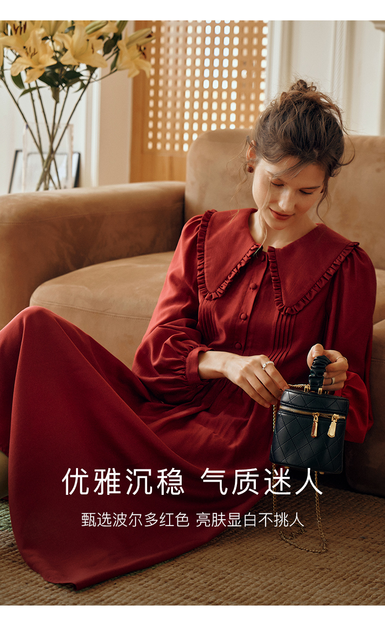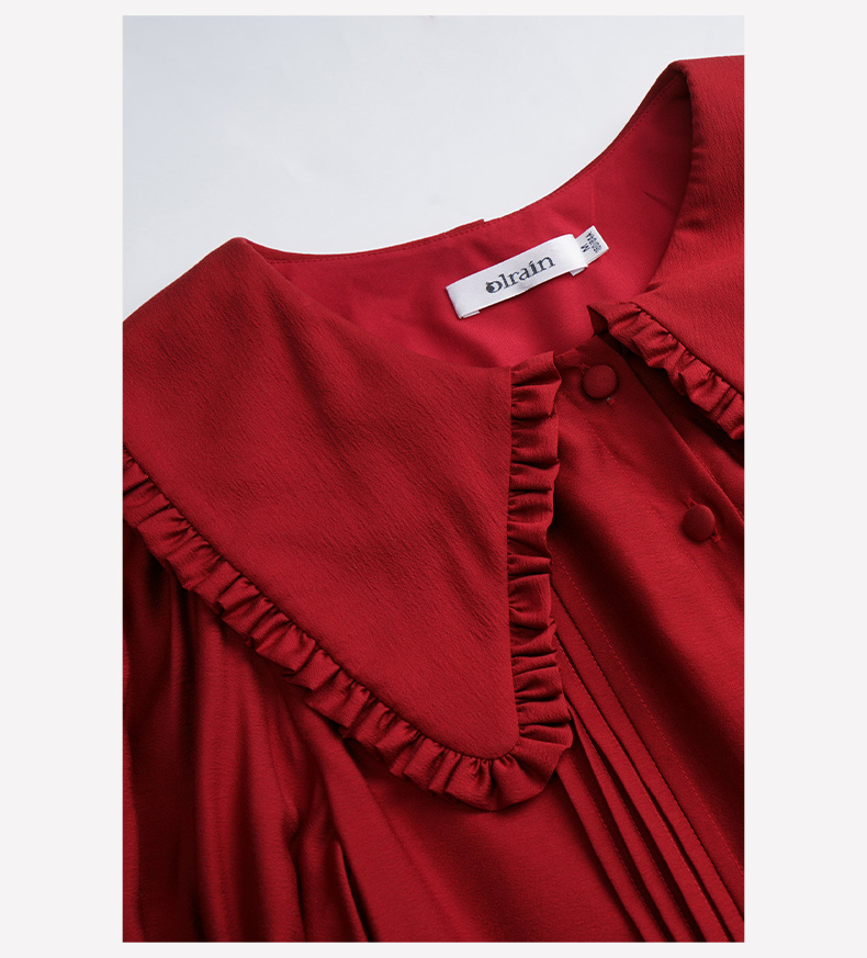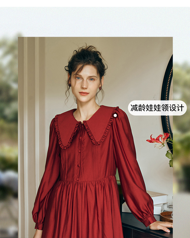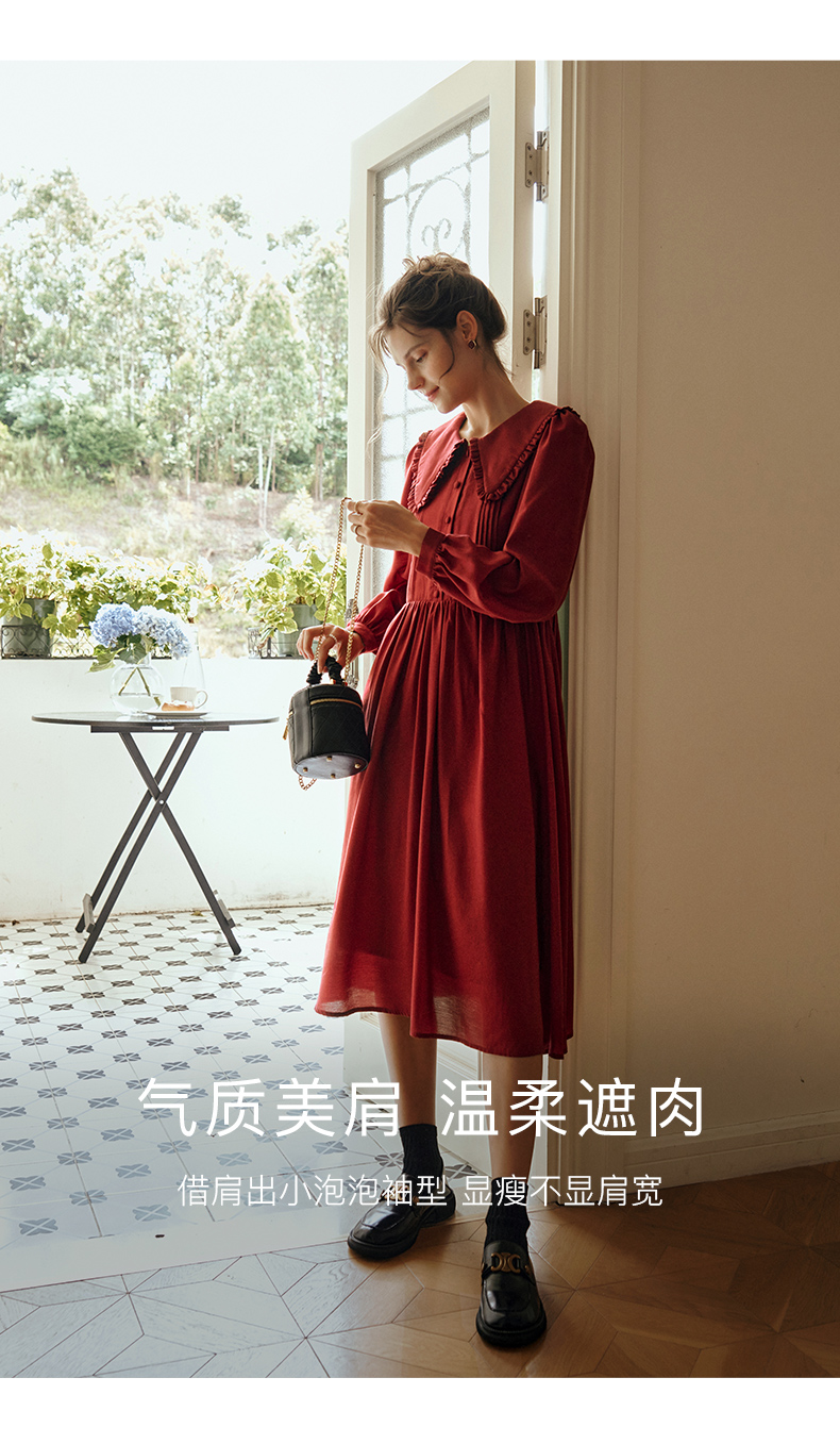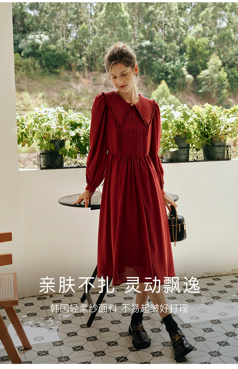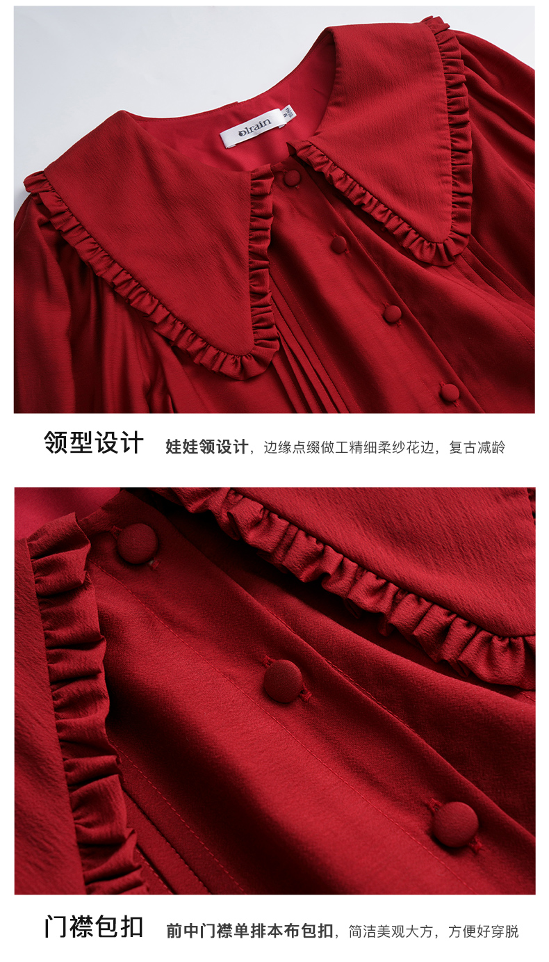 OLrain欧芮儿红色连衣裙女初秋2023年新款收腰法式气质娃娃领裙子
