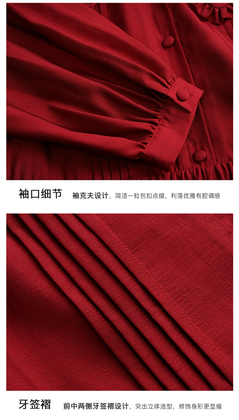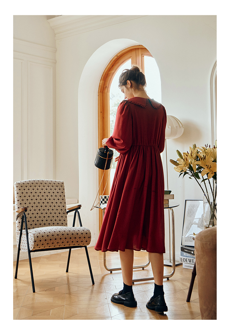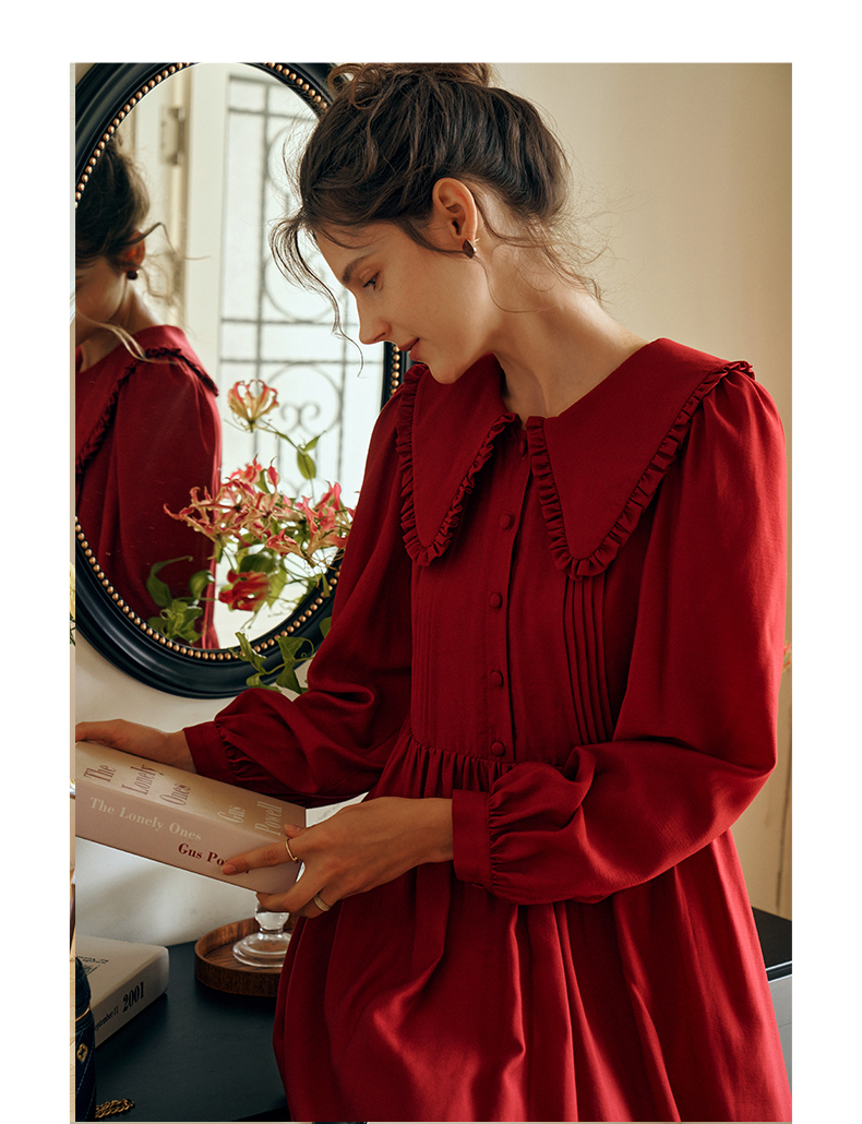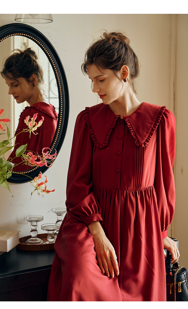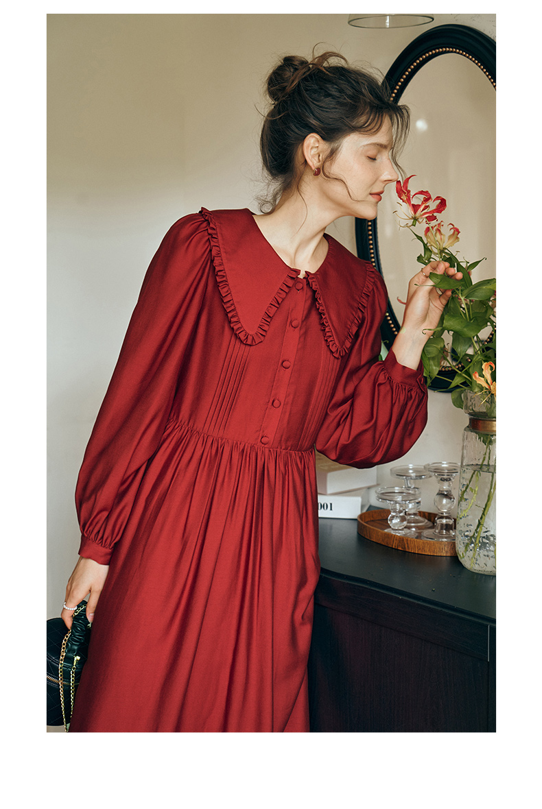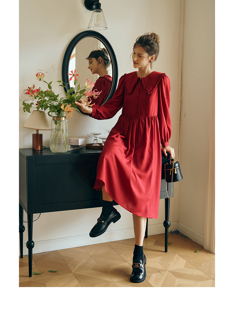 OLrain欧芮儿红色连衣裙女初秋2023年新款收腰法式气质娃娃领裙子