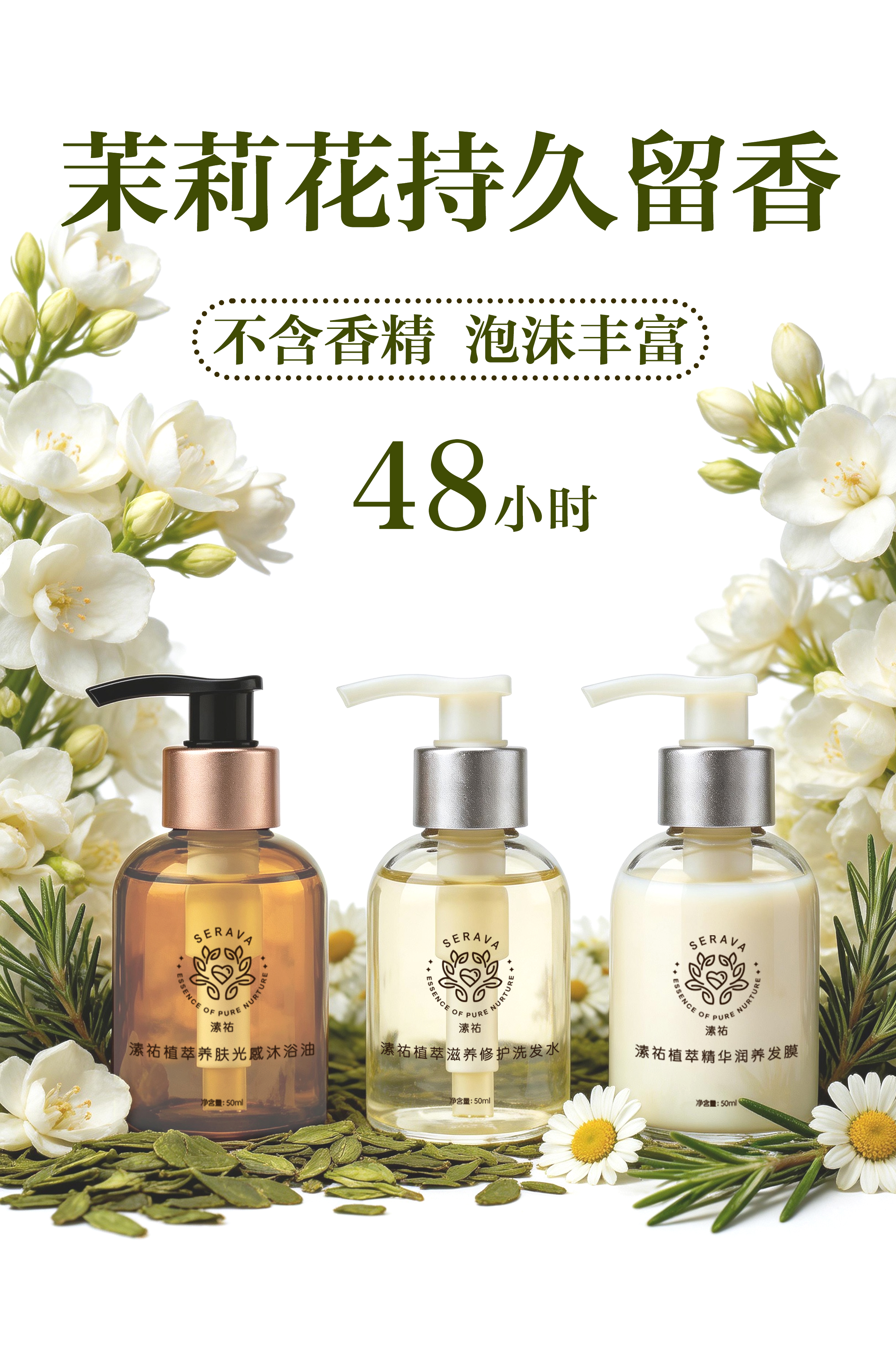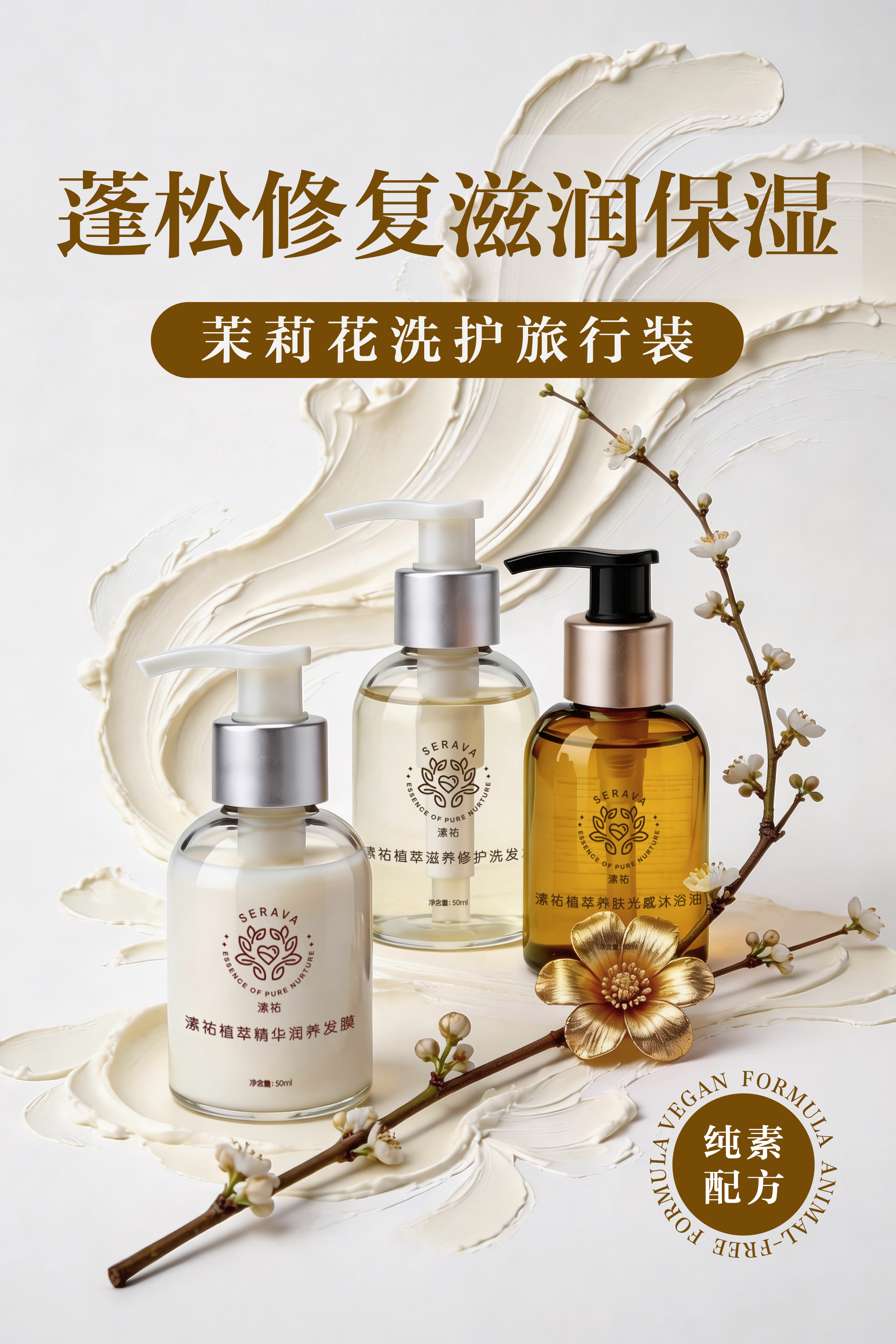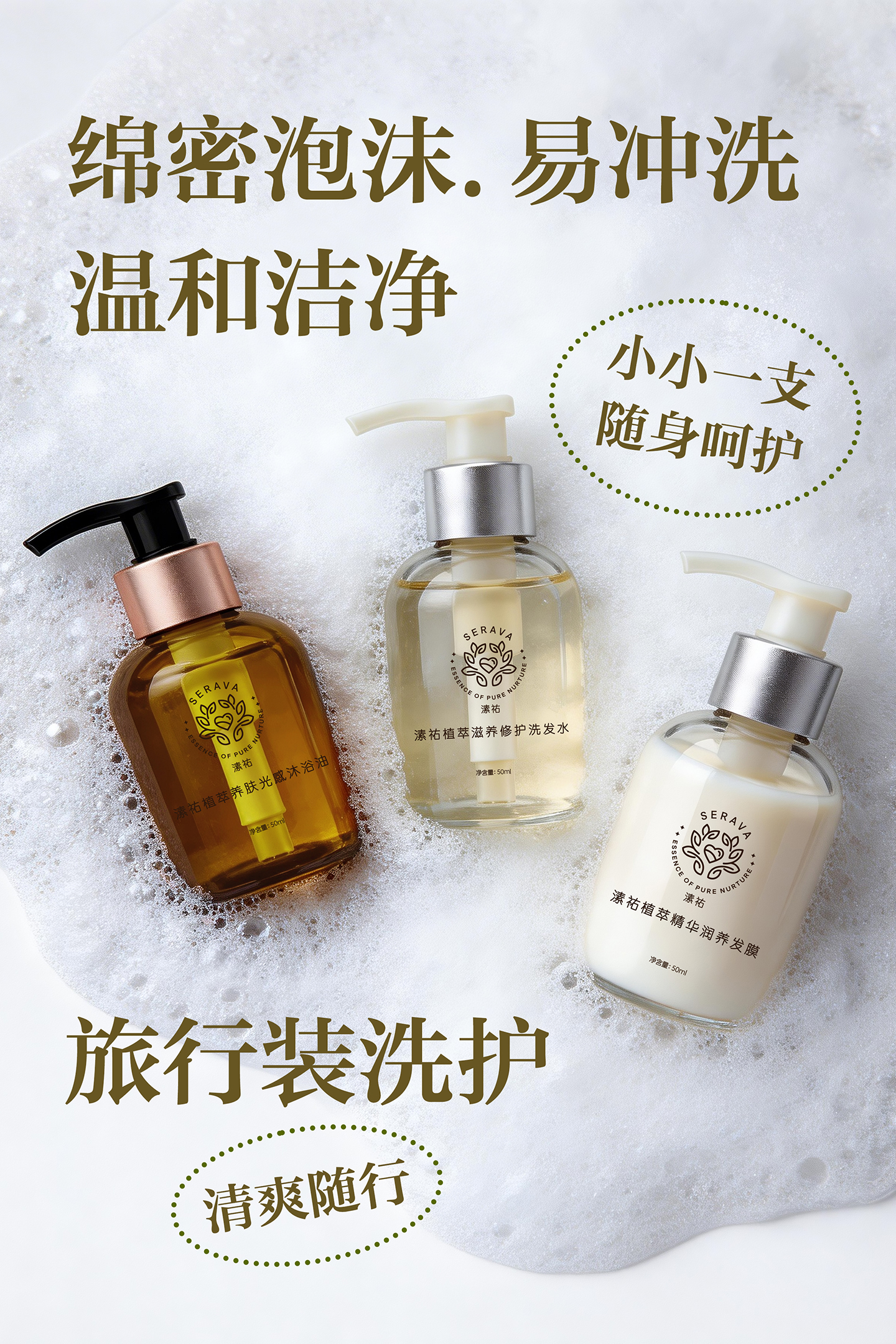 纯素洗护滋养系列 旅行装套装 蓬松洗发水 润养发膜 精油沐浴油 50ml 纯素自研专利配方 天然植物矿物来源 Serava溸祐纯素洗护
