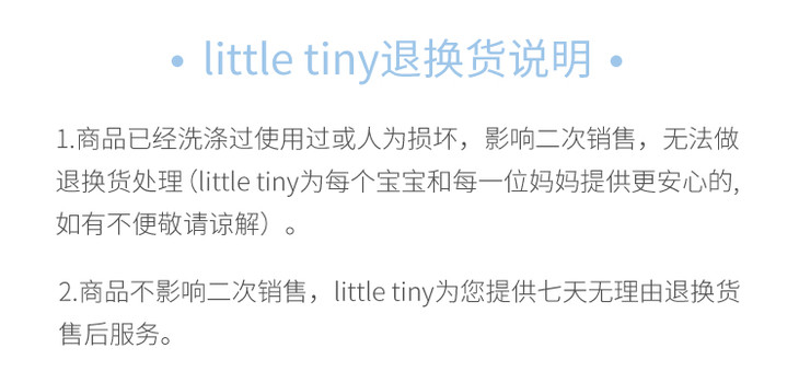 七天无理由退换货政策:签收之日算起7日内可办理无理由退换货服务,需在产品不影响二次销售的前提下,即产品未穿过/未清洗/吊牌未取/包装完好。