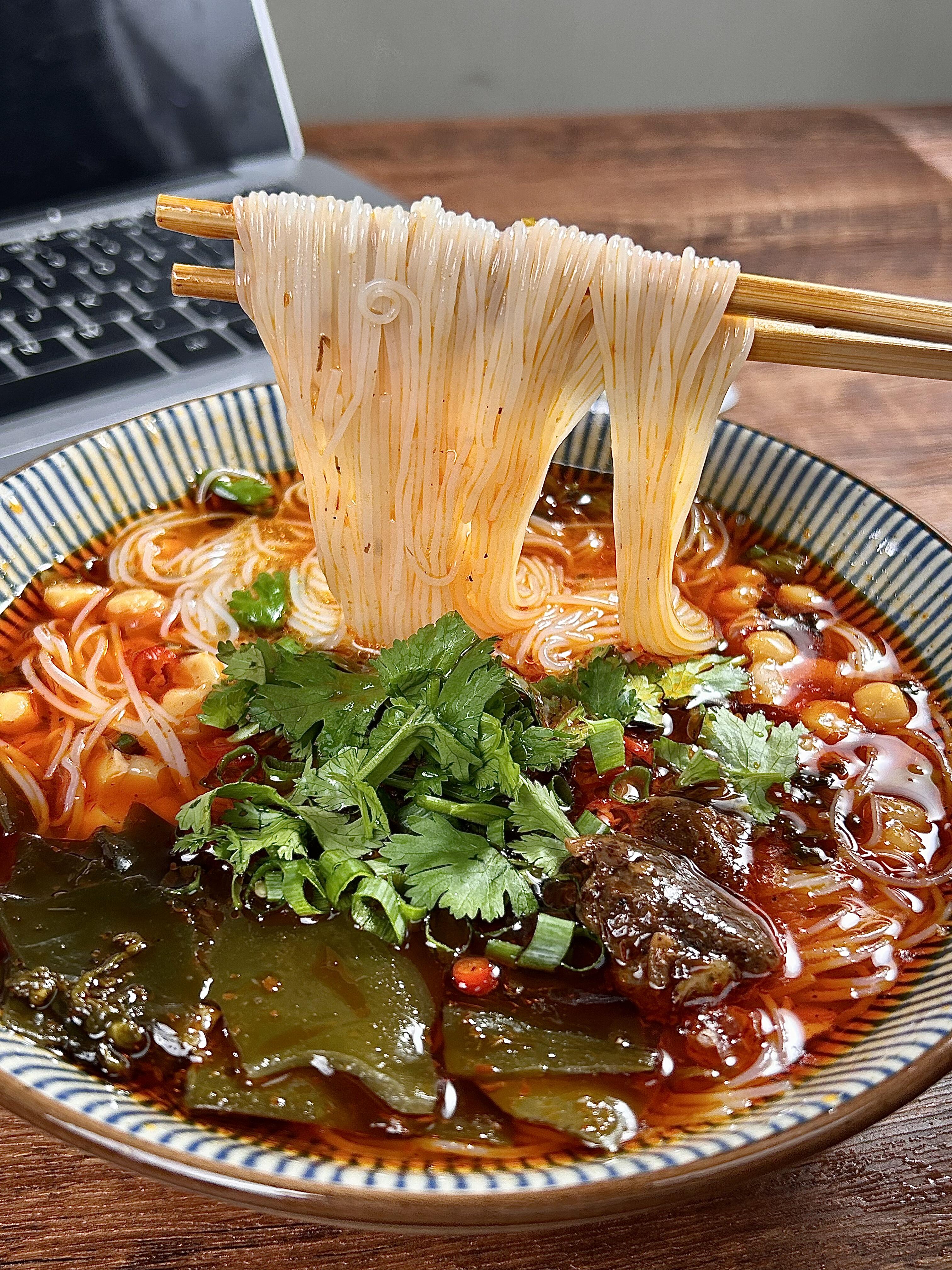 细如发丝的米粉,滑溜溜裹满汤汁,