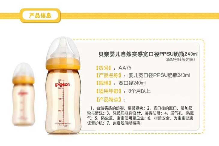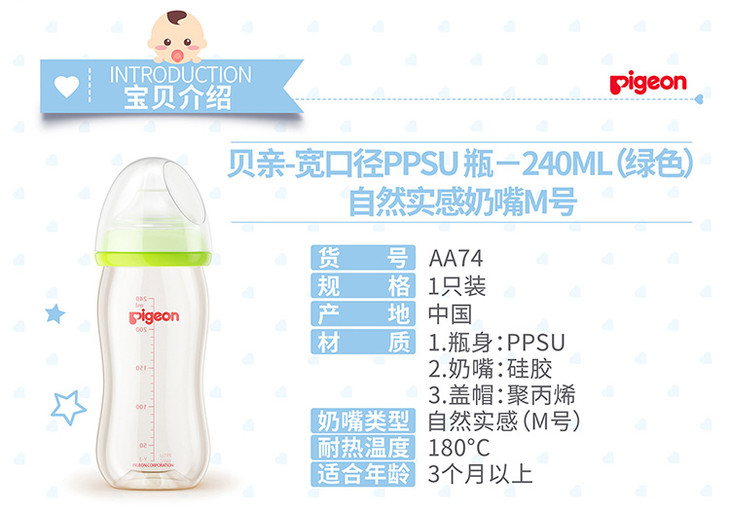 【一般贸易】贝亲—宽口径PPSU奶瓶240ml(绿色) / (黄色)AA74+AA75