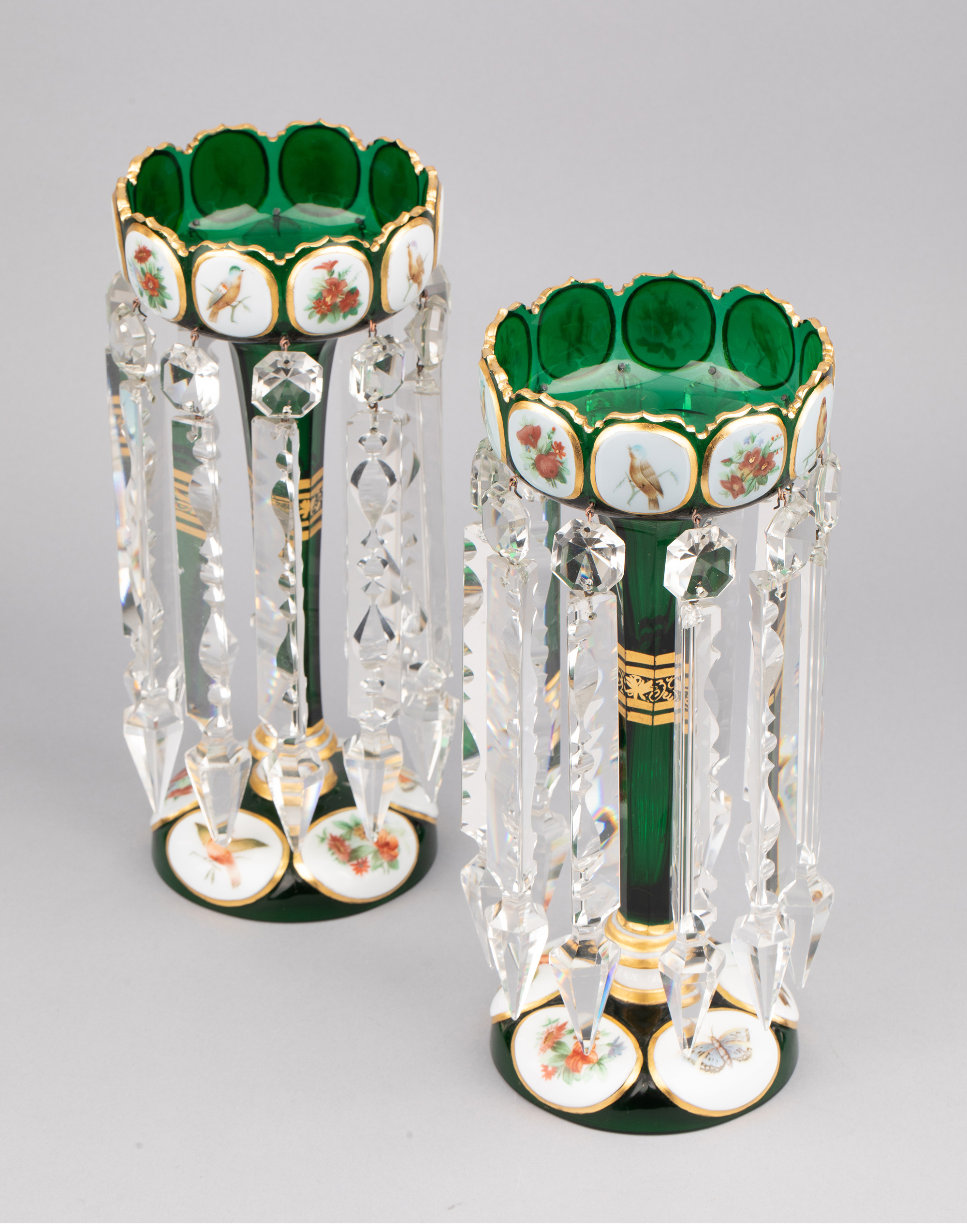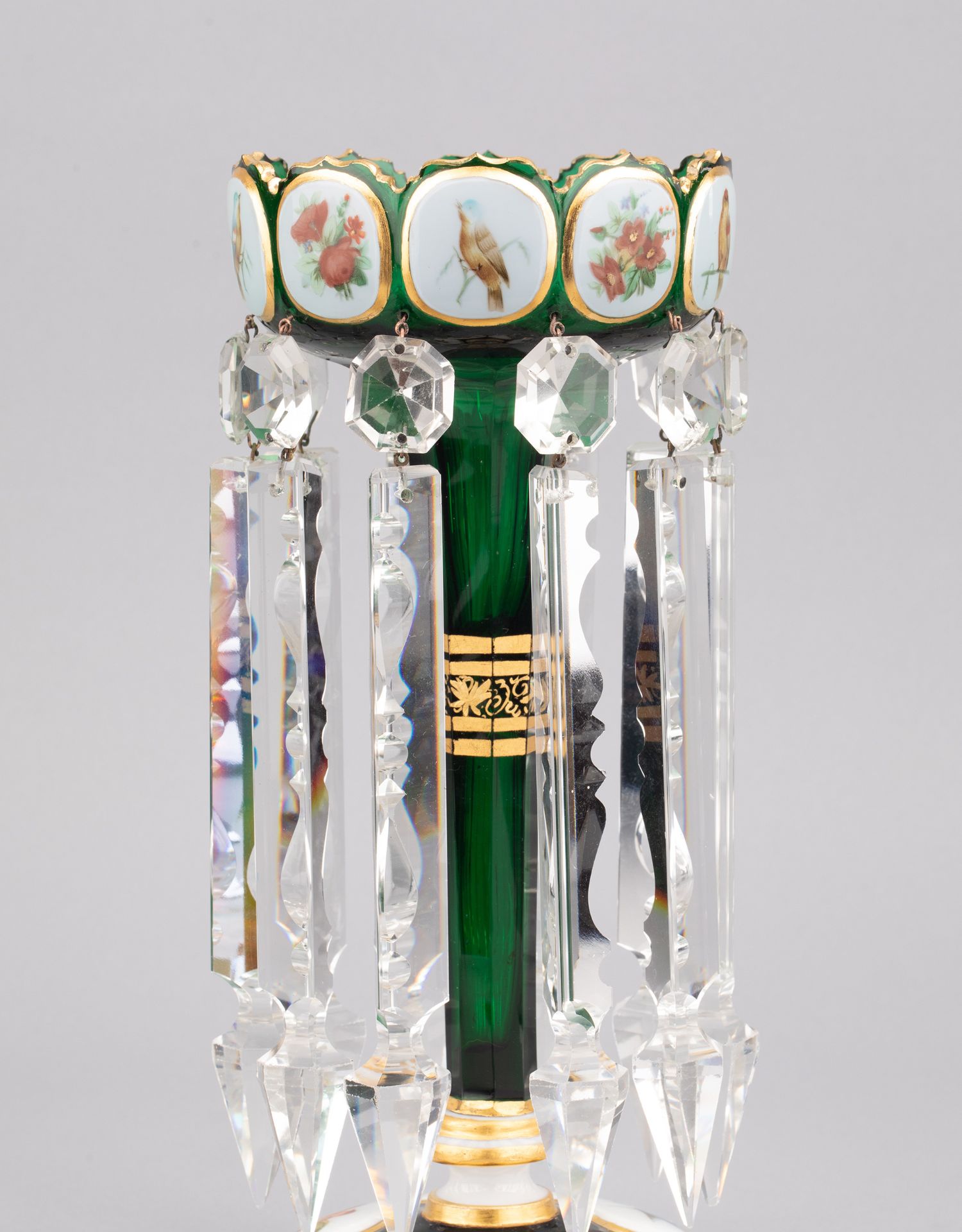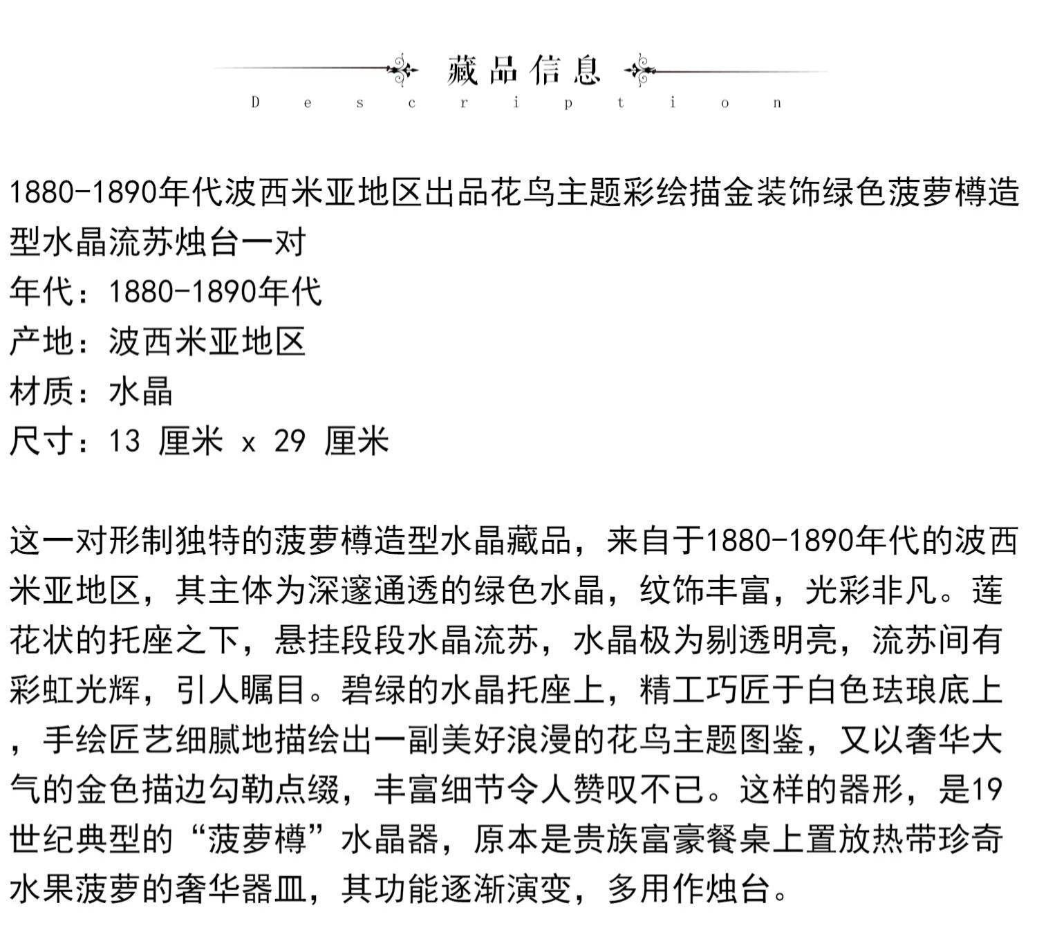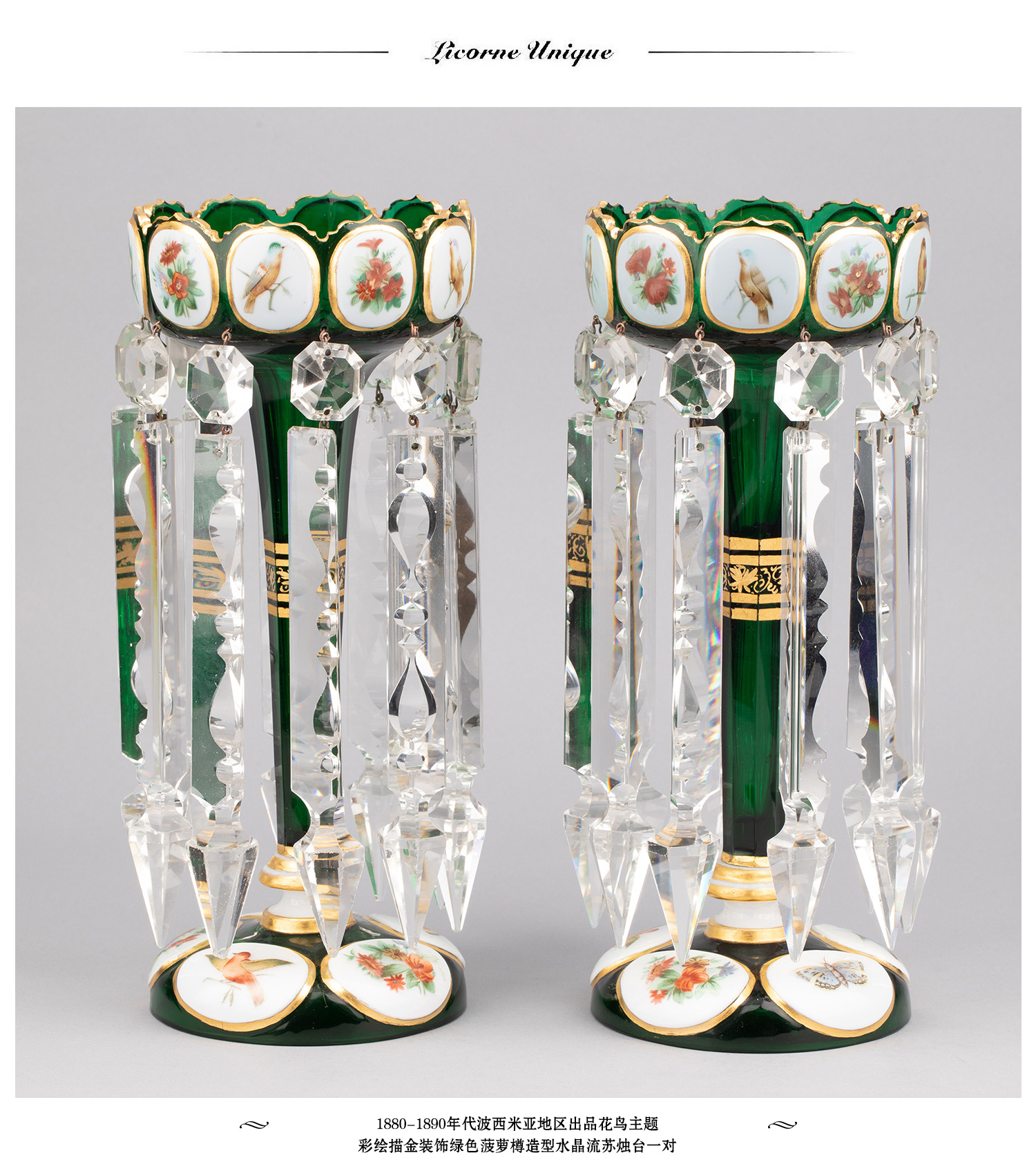 独角鹿西洋古董波西米亚花鸟主题彩绘描金菠萝樽水晶流苏烛台一对