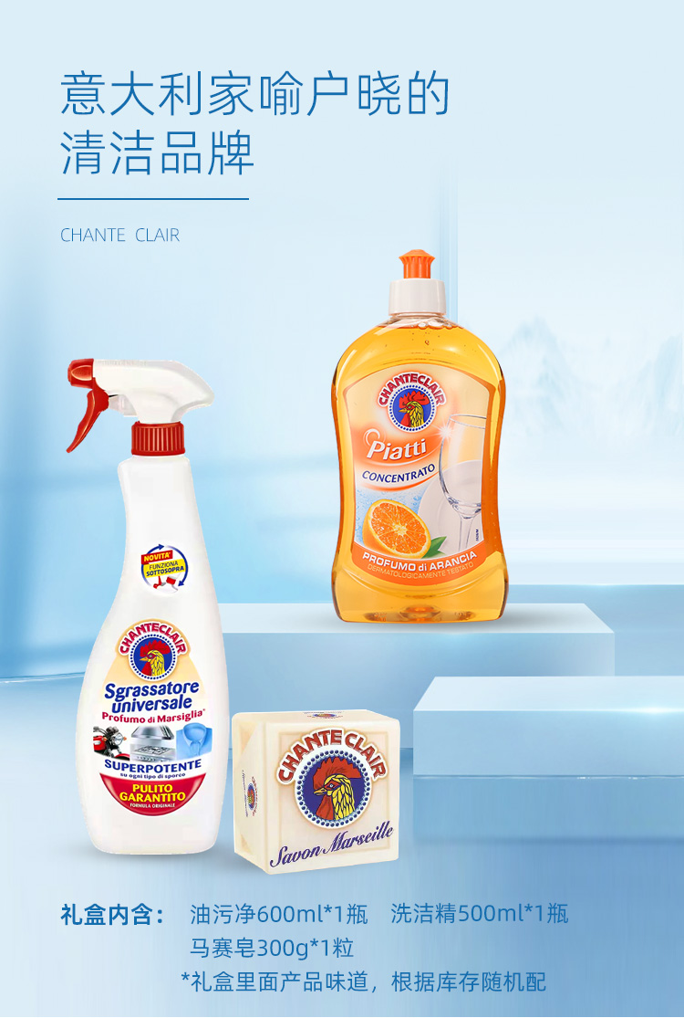意大利大公鸡 礼盒三件套(大公鸡油污净600ml +洗洁精500ml+马赛皂300g)
