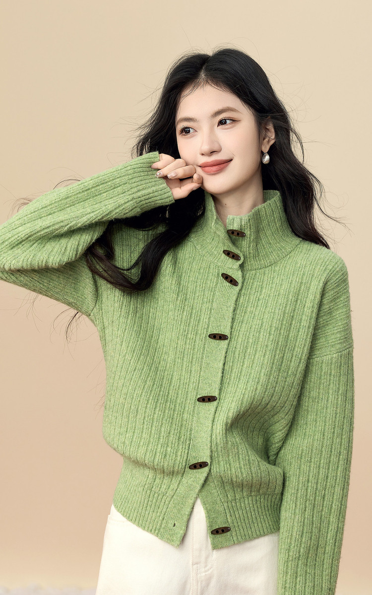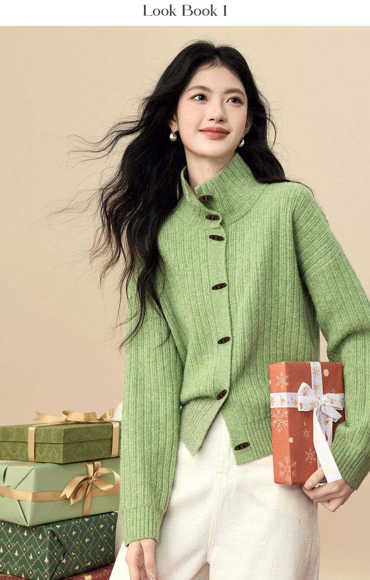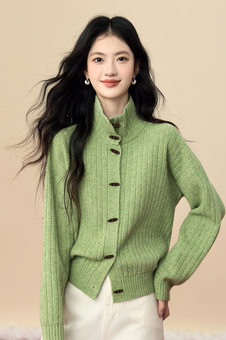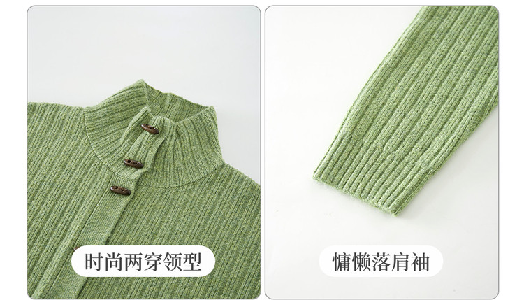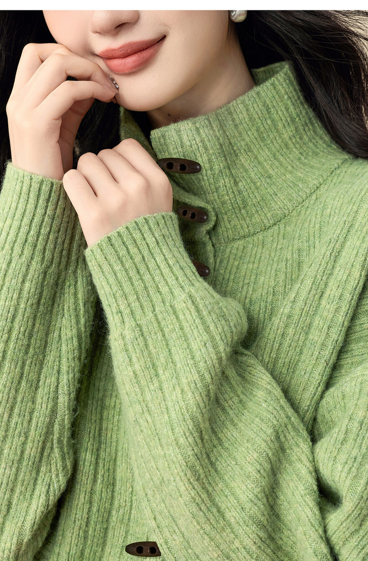 【12/24新品5.7折】熙世界巨好看绝美高领绿色毛衣女开衫秋冬慵懒风休闲牛角扣针织衫