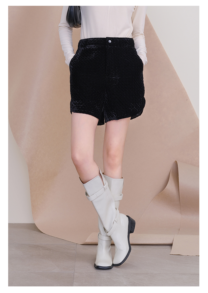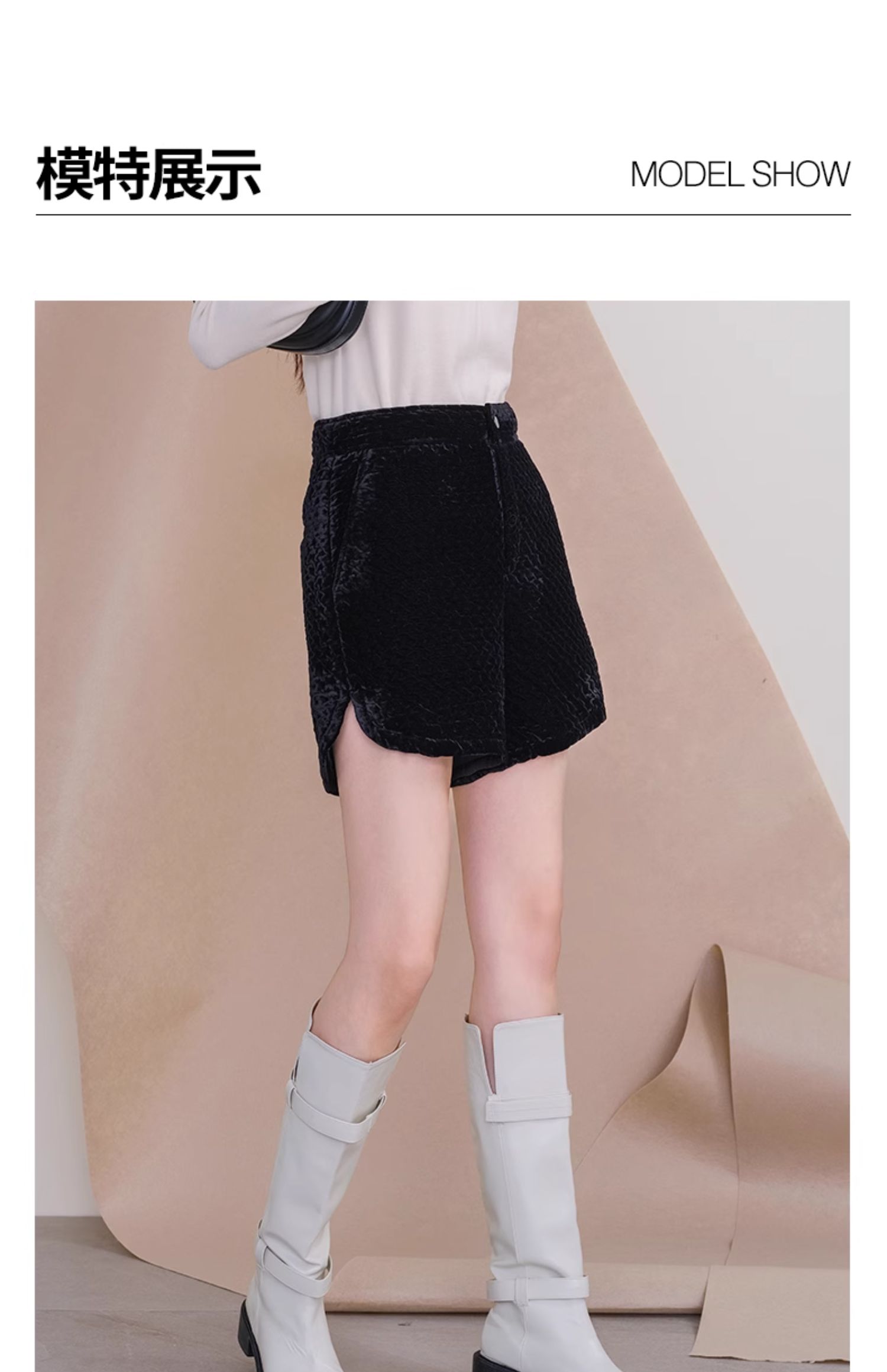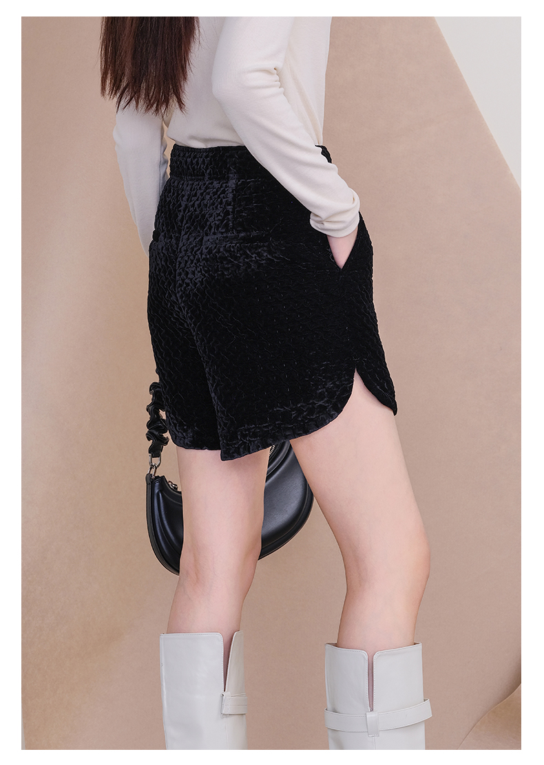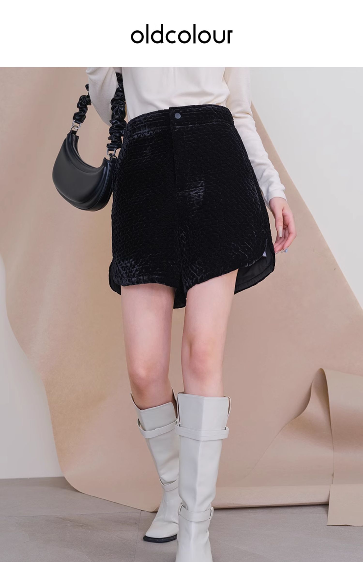 oldcolour冬季新款黑色菱格丝绒高腰休闲宽松A字短裤女P440702A1