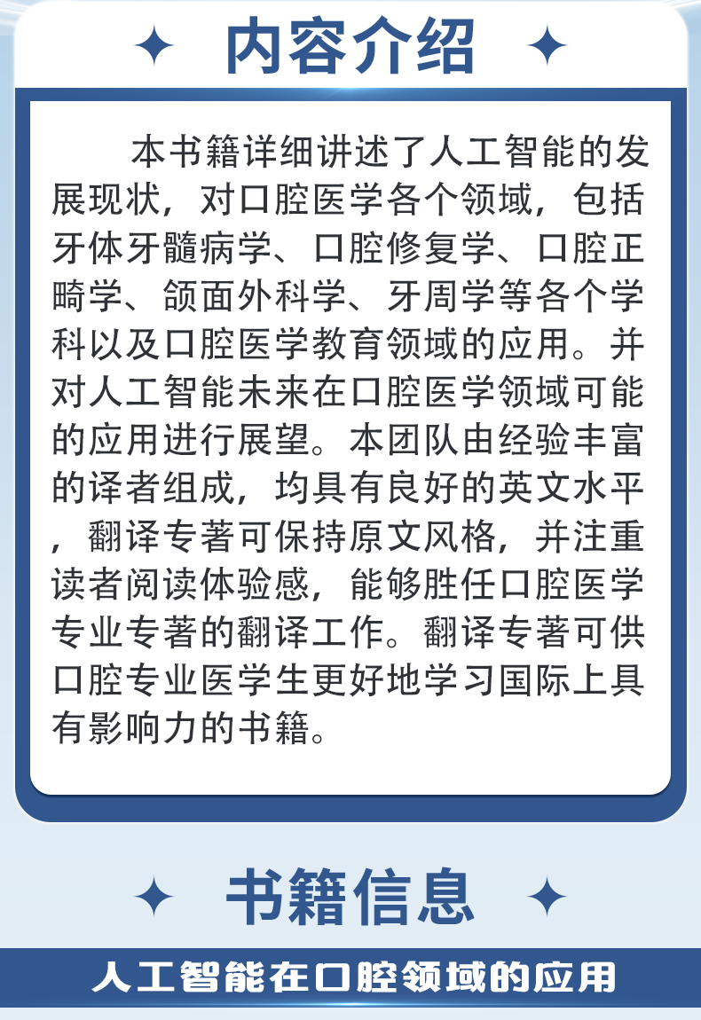 近年来人工智能发展迅速,在各个领域中均发挥了重要的作用。口腔行业是处在飞速发展中的行业,各种新技术不断革新,人工智能正在以多种方式改变口腔行业,从提高诊断速度和准确性到治疗精度和疗效。本书籍详细讲述了人工智能的发展现状,对口腔医学各个领域,包括牙体牙髓病学、口腔修复学、口腔正畸学、颌面外科学、牙周学等各个学科以及口腔医学教育领域的应用。并对人工智能未来在口腔医学领域可能的应用进行展望。本团队由经验丰富的译者组成,均具有良好的英文水平,翻译专著可保持原文风格,并注重读者阅读体验感,能够胜任口腔医学专业专著的翻译工作。翻译专著可供口腔专业医学生更好地学习国际上具有影响力的书籍。团队成员主持**、省部级项目多项,在国内外重要期刊发表论文数十篇,出版译著数部,包括《口腔正畸学手册》《口腔正畸数字化技术》《口腔正畸原理与技术》等。线上推广,可通过图书网站、电子书平台等渠道,将图书的信息传播给更多的读者。或可以在微信公众号、豆瓣读书等平台上发布图书的介绍、书评和读者反馈;线下推广,主译金作林教师是中华口腔医学会正畸专委会前任主任委员,在口腔界具有相当影响力,可在全国学术会议场所举办图书签售会、读书分享会、讲座等活动,吸引读者的兴趣和参与度,另外线上线下系列课程讲解本图书。此外,可以通过海报、展板等宣传材料,将图书的信息传递给更多的潜在读者。
