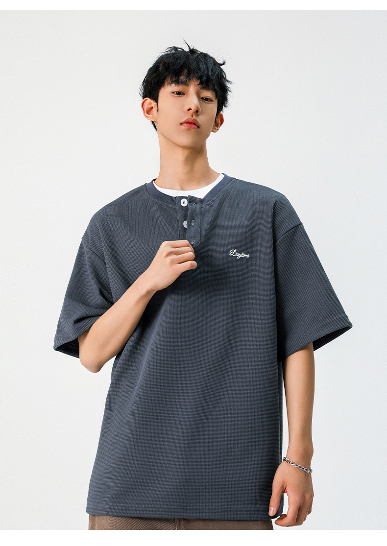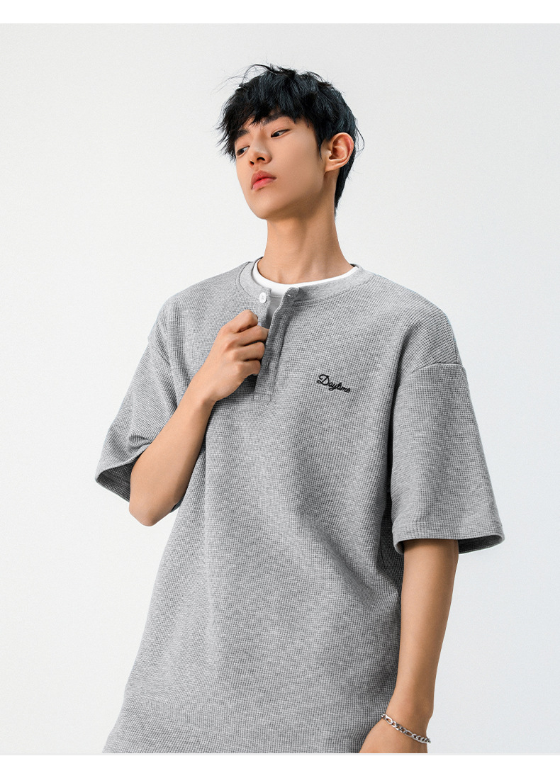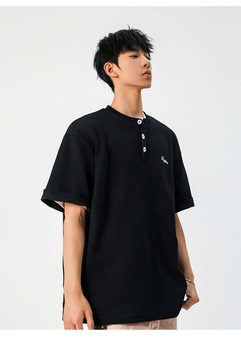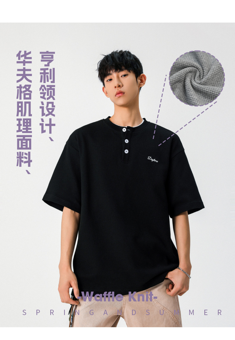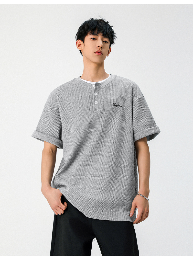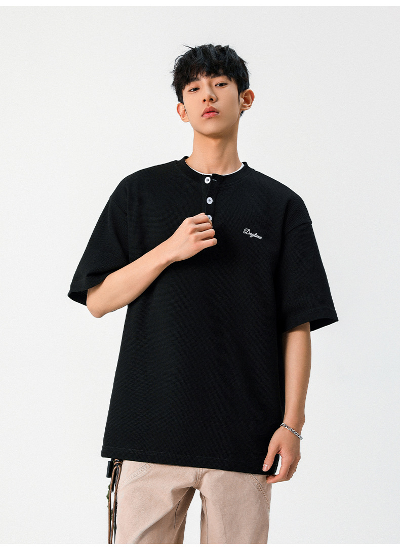 【YW】无忧购韩系重磅宽松撞色字母刺绣亨利领华夫格短袖T恤男MT7199(截单后7天发货)